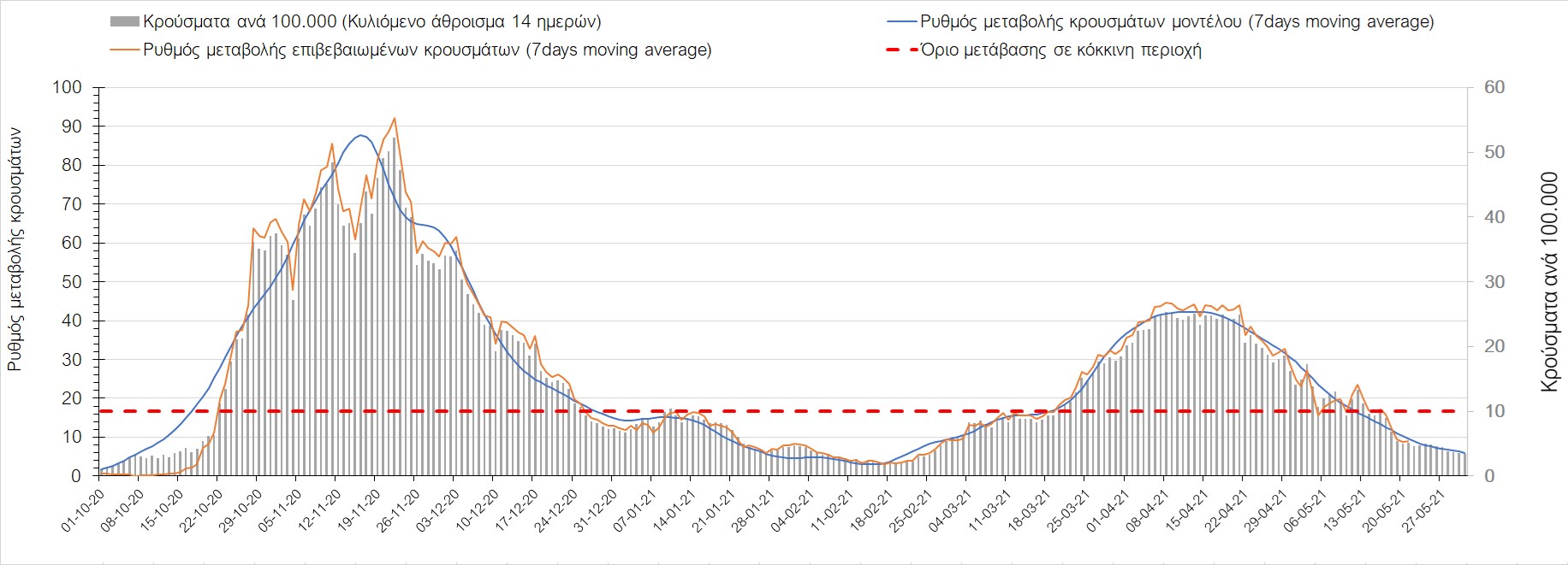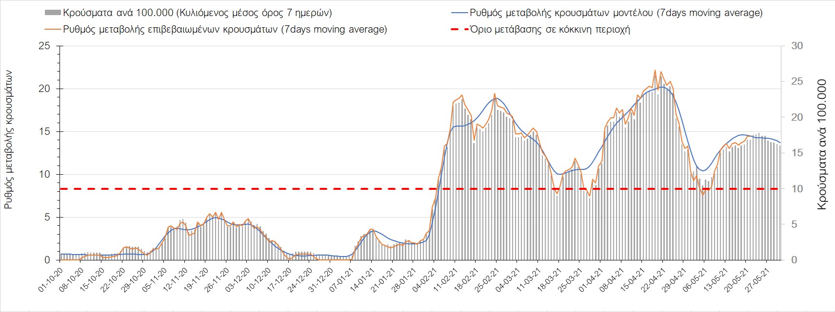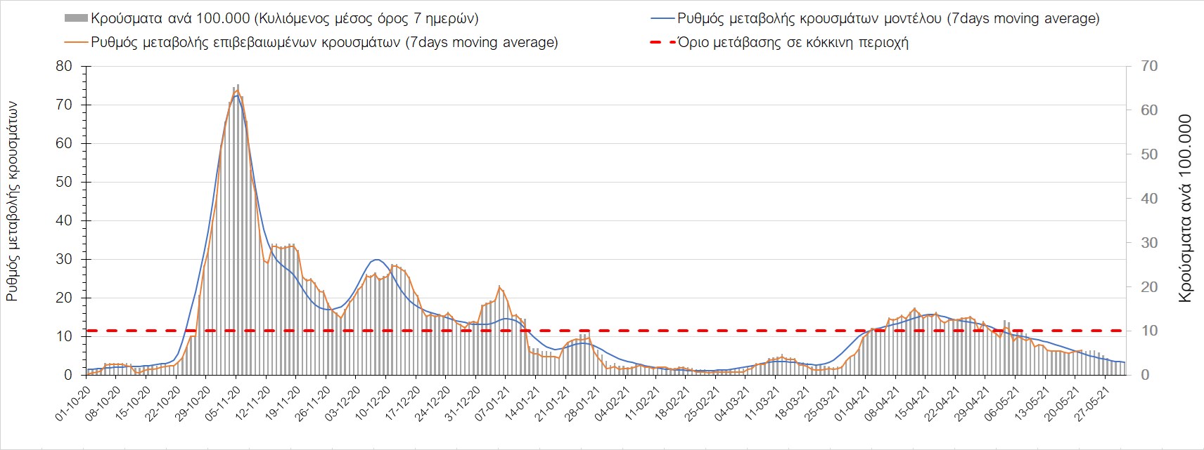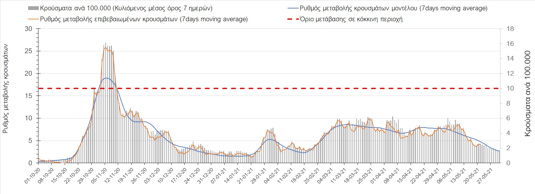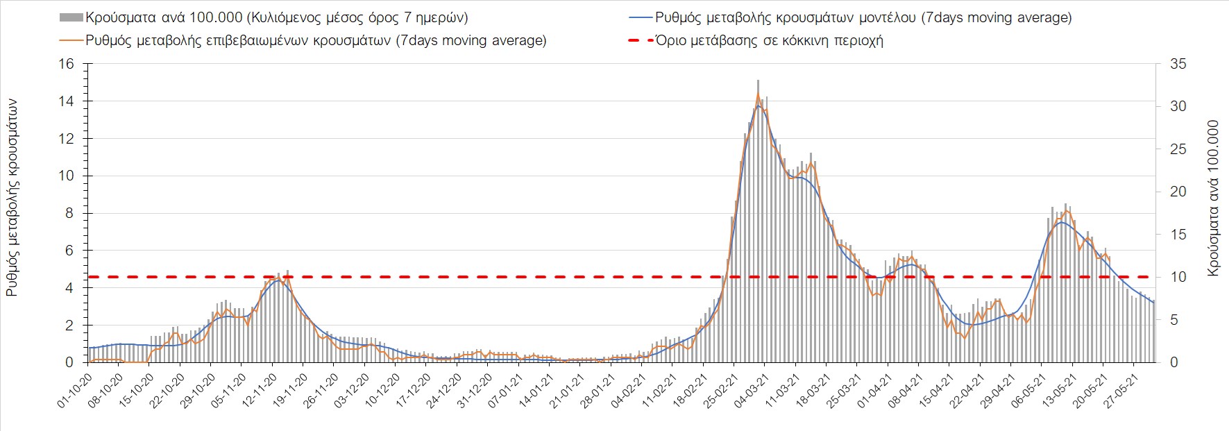 Σχήμα 44. Πορεία του ημερησίου αριθμού των κρουσμάτων (κυλιόμενος μέσος όρος 7 ημερών) στον ΈβροΣτο Ηράκλειο, όπου εντοπίστηκαν 50 κρούσματα παρατηρείται μείωση σε σχέση με προχθές (Σχήμα 45). Λόγω των έντονων διακυμάνσεων που σημειώθηκαν στην πορεία της πανδημίας ως αποτέλεσμα του πολύ μεγάλου αριθμού φορέων του μεταλλαγμένου στελέχους Β.1.1.7, το Ηράκλειο είχε μεγάλη διασπορά του ιού και αυτή η δυναμική καθυστέρησε και συνεχίζει να καθυστερεί τον αποχαρακτηρισμό της περιοχής ως κόκκινη. Το επιπλέον ανοδικό κύμα που διαμορφώθηκε τις τελευταίες ημέρες και μάλλον οφείλεται σε αυξημένες συρροές λόγω του Πάσχα, έχει αρχίσει να αποκλιμακώνεται, σύμφωνα με τις προβλέψεις, αλλά με πολύ αργό ρυθμό. Στα Χανιά με 24 κρούσματα (Σχήμα 46) έχουμε αύξηση σε σχέση με προχθές, και υπάρχουν έντονες διακυμάνσεις (με ένα επιπλέον ανοδικό κύμα που οφείλεται σε συρροές των ημερών του Πάσχα) που δυσχεραίνουν τη συστηματική αποκλιμάκωση. Τα Χανιά θα παραμείνουν ανάμεσα στις κόκκινες περιοχές και μετά τις 20 Μαΐου. Μείωση κρουσμάτων παρατηρείται στο Ρέθυμνο με 15 κρούσματα, στο οποίο η προ 15 ημερών έντονα ανοδική τάση, είχε περιέλθει σε πορεία ισχυρής αποκλιμάκωσης (Σχήμα 47), όμως η μικρή ανοδική τάση που έχει διαμορφωθεί, έχει φέρει την περιοχή ξανά πάνω από το όριο του χαρακτηρισμού ως κόκκινη. Στο Λασίθι παρατηρείται μείωση σε σχέση με προχθές, καθώς εντοπίστηκαν 0 κρούσματα και παρατηρούνται έντονες διακυμάνσεις (Σχήμα 48), παρόλα αυτά, η περιφερειακή ενότητα βρίσκεται κάτω από το όριο της κόκκινης περιοχής.