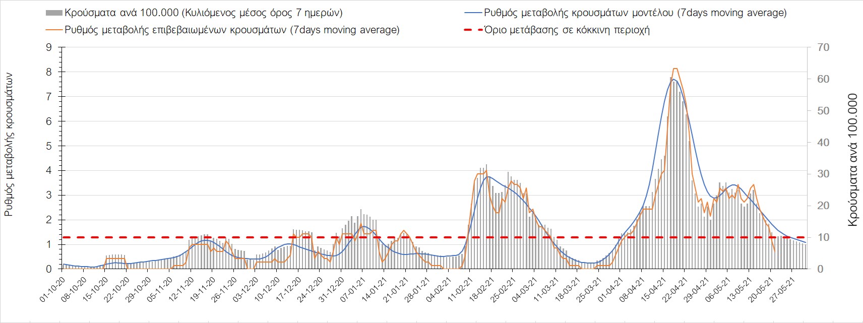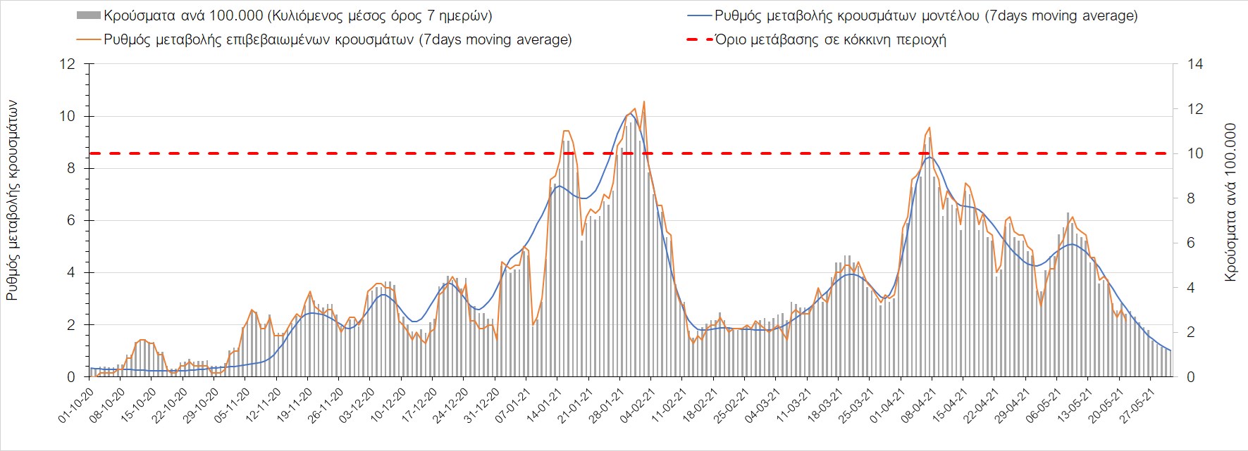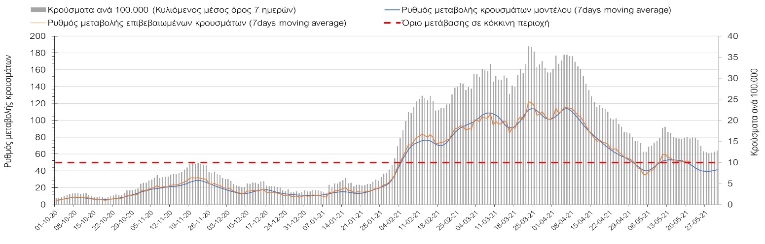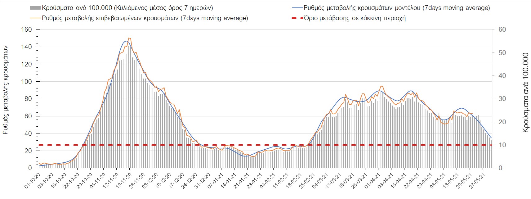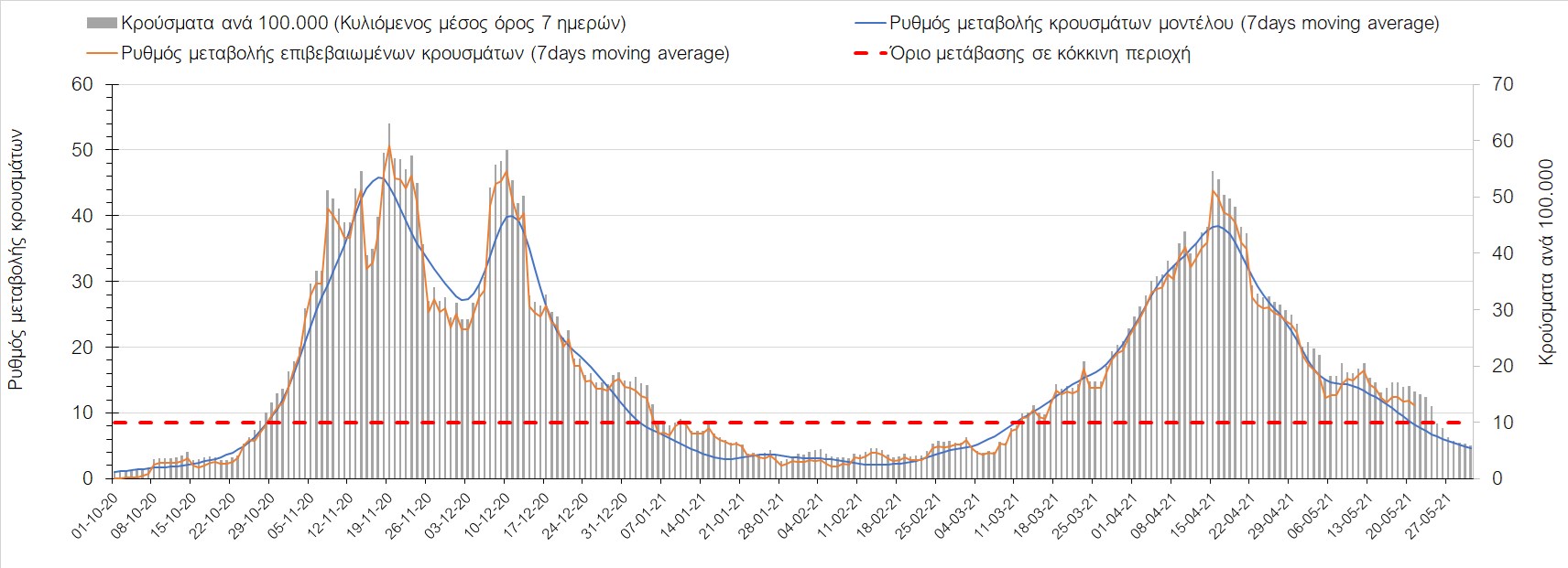 Με δεδομένη την αβεβαιότητα που αφορά κυρίως τις δύο πρώτες παραδοχές, οι προβλέψεις μας θα επαναεπικαιροποιούνται εάν παρατηρήσουμε αποκλίσεις που δε θα επιβεβαιώνουν την αναμενόμενη πορεία.Όπως φαίνεται από το διάγραμμα, από τις 8 Απριλίου, είχε ξεκινήσει αποκλιμάκωση του αριθμού των κρουσμάτων, η οποία επιταχύνθηκε μετά τις 19 Απριλίου, ως αποτέλεσμα του συνδυασμού των self-test, του αυξημένου αριθμού των τεστ ανίχνευσης που πραγματοποιούνται από τον ΕΟΔΥ, την αύξηση της θερμοκρασίας και φυσικά της συνέχισης του lockdown. Όπως ήδη αναφέραμε, λόγω του ανοίγματος δραστηριοτήτων και των συρροών του Πάσχα, παρατηρήθηκε ήδη μια ταχεία ανάσχεση της πτωτικής πορείας την προπερασμένη εβδομάδα, όπως είχε προβλεφθεί από το μοντέλο CORE. Πάντως, αξίζει για άλλη μια φορά να αναφερθεί, ότι για να μπορέσουμε να προχωρήσουμε σε άρση των περιοριστικών μέτρων για οικονομικές, εκπαιδευτικές και πολιτιστικές/αθλητικές δραστηριότητες, θα πρέπει να δημιουργήσουμε την κατάλληλη υποδομή ώστε να μπορέσουμε να αναχαιτίσουμε την υπερμετάδοση των μεταλλαγμένων στελεχών εκεί όπου συμβαίνει κατά το μάλλον, δηλαδή στους τόπους εργασίας και τα μέσα μαζικής μεταφοράς, ενώ πλέον με τα υπάρχοντα και διαφαινόμενα ανοίγματα ιδιαίτερη προσοχή χρειάζεται να δοθεί και στους χώρους εστίασης αλλά και στα σχολεία. Στα συμπεράσματα προτείνονται σχετικές λύσεις.