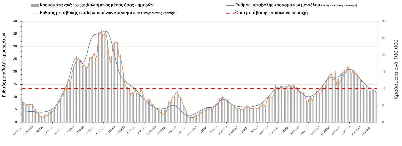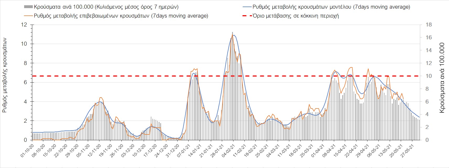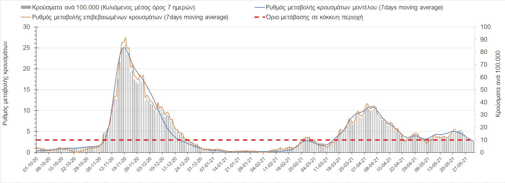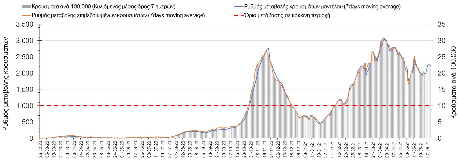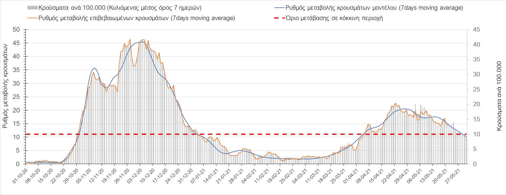 Με δεδομένη την αβεβαιότητα που αφορά κυρίως τις δύο πρώτες παραδοχές, οι προβλέψεις μας θα επαναεπικαιροποιούνται εάν παρατηρήσουμε αποκλίσεις που δε θα επιβεβαιώνουν την αναμενόμενη πορεία.Όπως φαίνεται από το διάγραμμα, από τις 8 Απριλίου, είχε ξεκινήσει αποκλιμάκωση του αριθμού των κρουσμάτων, η οποία επιταχύνθηκε μετά τις 19 Απριλίου, ως αποτέλεσμα του συνδυασμού των self-test, του αυξημένου αριθμού των τεστ ανίχνευσης που πραγματοποιούνται από τον ΕΟΔΥ, την αύξηση της θερμοκρασίας και φυσικά της συνέχισης του lockdown. Όπως ήδη αναφέραμε, λόγω του ανοίγματος δραστηριοτήτων και των συρροών του Πάσχα, παρατηρήθηκε ήδη μια ταχεία ανάσχεση της πτωτικής πορείας την προπερασμένη εβδομάδα, όπως είχε προβλεφθεί από το μοντέλο CORE. Πάντως, αξίζει για άλλη μια φορά να αναφερθεί, ότι για να μπορέσουμε να προχωρήσουμε σε άρση των περιοριστικών μέτρων για οικονομικές, εκπαιδευτικές και πολιτιστικές/αθλητικές δραστηριότητες, θα πρέπει να δημιουργήσουμε την κατάλληλη υποδομή ώστε να μπορέσουμε να αναχαιτίσουμε την υπερμετάδοση των μεταλλαγμένων στελεχών εκεί όπου συμβαίνει κατά το μάλλον, δηλαδή στους τόπους εργασίας και τα μέσα μαζικής μεταφοράς, ενώ πλέον με τα υπάρχοντα και διαφαινόμενα ανοίγματα ιδιαίτερη προσοχή χρειάζεται να δοθεί και στους χώρους εστίασης αλλά και στα σχολεία. Στα συμπεράσματα προτείνονται σχετικές λύσεις.