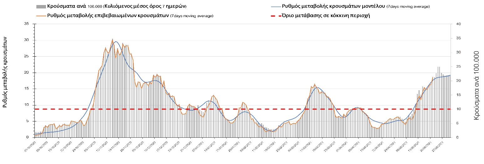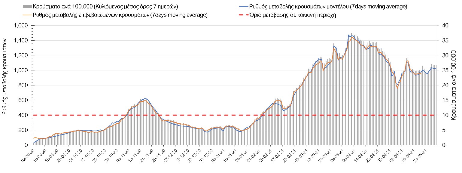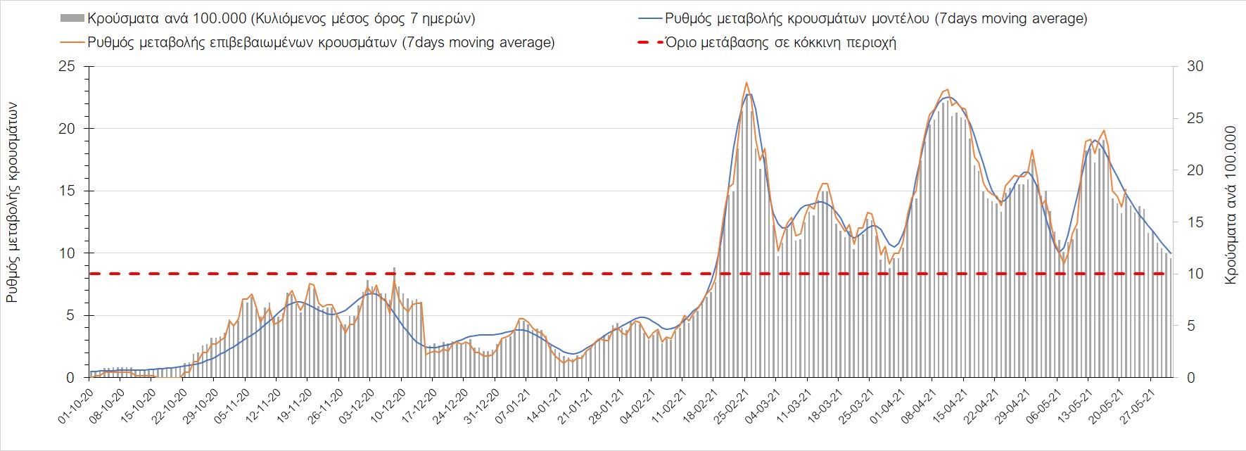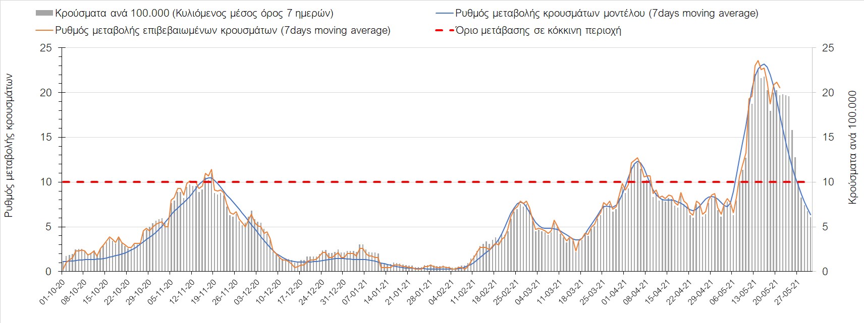 Σχήμα 19. Πορεία του ημερησίου αριθμού των κρουσμάτων (κυλιόμενος μέσος όρος 7 ημερών) στην ΚορινθίαΣτην Αιτωλοακαρνανία (Σχήμα 20) με 69 κρούσματα παρατηρείται μειωμένος αριθμός κρουσμάτων σε σχέση με προχθές (73 κρούσματα) (Σχήμα 20), και ενώ έχει ήδη περάσει τρεις κορυφώσεις της επιδημικής καμπύλης, η περιοχή διανύει μια τέταρτη, η οποία διατηρεί την Αιτωλοακαρνανία πολύ πάνω από το όριο της κόκκινης περιοχής. Με βάση τα τωρινά αποτελέσματα, η Αιτωλοακαρνανία ήταν η περιφέρεια με την πιο έντονα ανοδική τάση, παρόλα αυτά, έχει εισέλθει σε τροχιά αποκλιμάκωσης, όπως είχαμε προβλέψει από τις αρχές της προηγούμενης εβδομάδας και ακολουθεί πλήρως την πορεία του μοντέλου. Όπως έχουμε εκφράσει και παλιότερα, σε όλες τις επαρχιακές περιφερειακές ενότητες παρατηρούνται διακυμάνσεις οι οποίες ενίοτε αντιστρέφουν γρήγορα την καθοδική πορεία και δυστυχώς οι φόβοι που είχαμε εκφράσει παρατηρώντας και προηγούμενες κυμάνσεις, επιβεβαιώθηκαν ξανά, και η περιοχή την διανύει ένα επιπλέον ανοδικό κύμα (συγκεκριμένα το 4ο μέσα στο 2021), το οποίο μάλιστα είναι και το υψηλότερο από όλα. Επειδή αυτές οι διακυμάνσεις παρατηρούνται περισσότερο σε περιοχές της επαρχίας, παρά στα 2 μεγάλα αστικά κέντρα, θα ήταν χρήσιμο να ανακοινώνονται (ή τουλάχιστον να κοινοποιούνται στην ερευνητική ομάδα HERACLES) τα στοιχεία του ημερήσιου αριθμού των τεστ τα οποία διενεργούνται από τον ΕΟΔΥ ανά περιοχή, έτσι ώστε να μπορούμε να διαπιστώνουμε νωρίς εάν αυτές οι διακυμάνσεις οφείλονται σε γεγονότα υπερμετάδοσης (που σχετίζονται με δραστηριότητες που δε συνάδουν με την τήρηση των μέτρων) ή με τη διακύμανση του αριθμού των τεστ ανίχνευσης σε ημερήσια βάση. Στη συγκεκριμένη περίπτωση, οι διακυμάνσεις δεν μπορούν να εξηγηθούν ούτε από τα ισχύοντα μέτρα, ούτε από τη βελτίωση του καιρού, παρά μόνο από φαινόμενα αδικαιολόγητης συρροής, γι’ αυτό και είναι αναγκαίες, τόσο η αύξηση της επιδημιολογικής επιτήρησης, όσο και ο έλεγχος συμμόρφωσης με τα μέτρα αναχαίτισης της επιδημίας. Στην Εύβοια, με 30 κρούσματα παρατηρείται αυξημένος αριθμός κρουσμάτων σε σχέση με προχθές (Σχήμα 21). Η συνολική πορεία της καμπύλης νέων κρουσμάτων ενώ είχε επανέλθει σε πτωτική όπως είχαμε αρχικά προβλέψει, υφίσταται διακυμάνσεις. Λόγω αυτών των διακυμάνσεων, η Εύβοια προβλέπεται να παραμείνει «κόκκινη» μέχρι το τρίτο 10ήμερο του Μαΐου. Μείωση στον αριθμό των κρουσμάτων είχαμε στη Βοιωτία με 24 κρούσματα (Σχήμα 22), στην οποία επίσης είχε διαμορφωθεί μια τάση σταθεροποίησης πριν 15 ημέρες, η οποία όμως ακολουθήθηκε από ανοδική τάση που έχει ξεκινήσει την προβλεπόμενη αποκλιμάκωση. Η εξέλιξη της πανδημίας στη Βοιωτία, σημαίνει ότι η περιφερειακή ενότητα θα παραμείνει κόκκινη μετά και τα μέσα Μαΐου. Αυξημένος σε σχέση με προχθές ήταν ο αριθμός των κρουσμάτων και στη Φθιώτιδα με 21 κρούσματα (Σχήμα 24), η οποία έχει περιέλθει σε αποκλιμάκωση της ανοδικής πορείας που την είχε επαναφέρει πάνω από το όριο του να χαρακτηριστεί κόκκινη. Αύξηση του αριθμού κρουσμάτων σε σχέση με τις προηγούμενες ημέρες παρατηρήθηκε στην Ευρυτανία, καθώς εντοπίστηκαν 1 κρούσμα (Σχήμα 25), και παρά τις συνεχείς διακυμάνσεις, πλέον η περιοχή πέρασε ξανά υπό το όριο του αποχαρακτηρισμού της από κόκκινη. Αύξηση παρατηρήθηκε στην Φωκίδα με 4 κρούσματα (Σχήμα 23), στην οποία είχε διαμορφωθεί ανοδική πορεία, η οποία επίσης βρίσκεται πλέον σε κά