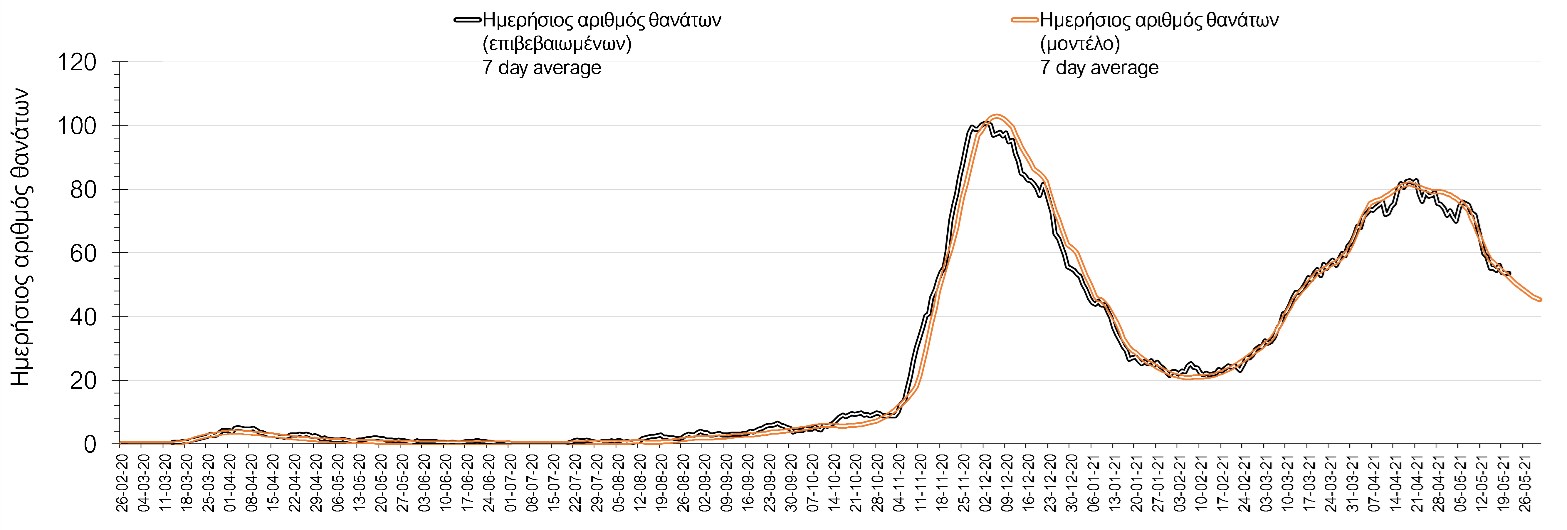 Σχήμα 3. Αριθμός θανάτων (κυλιόμενος μέσος όρος 7 ημερών) σύμφωνα με τα στοιχεία του ΕΟΔΥ και τις προβλέψεις της υπολογιστικής πλατφόρμας CORE.Η πορεία της μέσης εβδομαδιαίας τιμής των κρουσμάτων, καθώς και του κυλιόμενου μέσου όρου 7 ημερών του αριθμού των κρουσμάτων ανά 100.000 πληθυσμού, όπως έχουν καταγραφεί από τον ΕΟΔΥ και η αναμενόμενη πορεία τους όπως προδιαγράφεται από την υπολογιστική πλατφόρμα CORE για την Ελληνική επικράτεια μέχρι τις 31 Μαΐου, αποτυπώνονται στο Σχήμα 4. Με βάση το συνδυασμένο άνοιγμα της εστίασης στις 3 Μαΐου, και των προβλεπόμενων βαθμίδων εκπαίδευσης (Δημοτικά και Γυμνάσια) στις 10 Μαΐου, αναμένουμε την επιβράδυνση της πορείας αποκλιμάκωσης, με σημαντική πιθανότητα να υπάρξει και ένα μικρό ανοδικό κύμα το τελευταίο δεκαήμερο του Μαΐου. Με βάση την επικαιροποιημένη πρόβλεψη που πραγματοποιήσαμε, σύμφωνα με τον αριθμό των κρουσμάτων που παρατηρείται αυτές τις ημέρες, το ύψος του ανοδικού κύματος υπολογίζεται να επαναφέρει τον ημερήσιο αριθμό των κρουσμάτων μεταξύ των 2200-2500 πριν την αποκλιμάκωση του. Το μέγιστο ύψος του προσωρινού ανοδικού κύματος θα εξαρτηθεί από το βαθμό συμμόρφωσης στα μέτρα περιορισμού της πανδημίας. Πρέπει επίσης να σημειωθεί, ότι με βάση την επικαιροποιημένη ανάλυση των δεδομένων διασποράς της πανδημίας στη χώρα, παρατηρήθηκε αύξηση των ενεργών επαφών τις τελευταίες ημέρες του Απριλίου. Αυτές μπορούν να οφείλονται στο άνοιγμα των μεγάλων εμπορικών κέντρων (να σημειωθεί ότι έγινε χωρίς την εγκατάσταση συσκευών απολύμανσης του αέρα αν και πρόκειται για εσωτερικούς χώρους με ανάγκη τεχνητού εξαερισμού) και στην κίνηση της αγοράς λόγω του Πάσχα, αλλά και στις αυξημένες κοινωνικές επαφές κατά τη διάρκεια των εορτών του Πάσχα. Αυτή η προβλεπόμενη πορεία, που αφορά τα κρούσματα, τους νοσηλευόμενους σε απλές κλίνες, όσο και σε ΜΕΘ, καθώς επίσης και τους θανάτους, βασίζεται στις ακόλουθες παραδοχές: