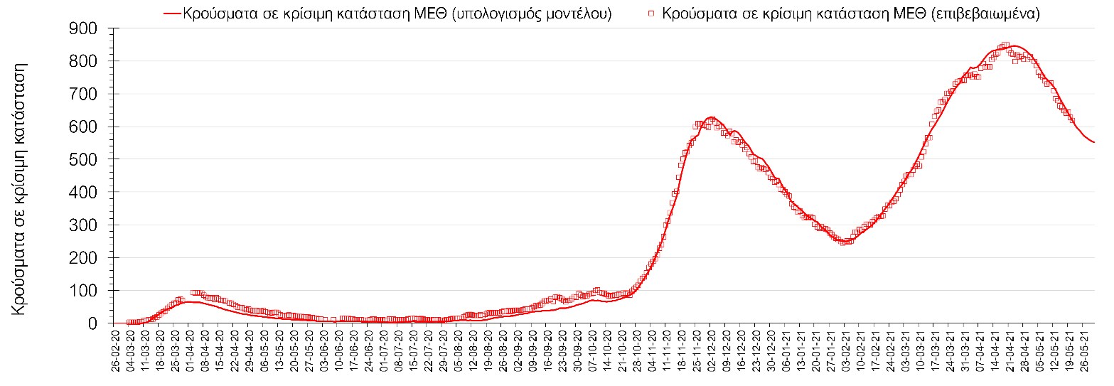 Ακολουθεί η ανάλυση του καθηγητή Δημοσθένη Σαρηγιάννη και του Δρ. Σπύρου Καρακίτσιου για την εξέλιξη της πανδημίας στη χώρα μας: Σύμφωνα με τα στοιχεία του ΕΟΔΥ, ο αριθμός κρουσμάτων της Παρασκευής ανέρχεται στα 2020 νέα κρούσματα, με τα αποτελέσματα να συνάδουν με τις προβλέψεις της υπολογιστικής πλατφόρμας CORE (n=2011). Ο αριθμός των τεστ που πραγματοποιήθηκαν ήταν 52694 και σε συνδυασμό με τον αριθμό των κρουσμάτων, ο δείκτης θετικότητας διαμορφώθηκε στο 4,3%. Η πραγματοποίηση αριθμού τεστ σε επίπεδα άνω των 50.000 την ημέρα (όπως και πραγματοποιείται τις τελευταίες ημέρες), συντελεί στο να εξάγουμε πιο ασφαλή συμπεράσματα σχετικά με την πορεία της πανδημίας, αλλά και να εντοπίζονται περισσότεροι ασυμπτωματικοί και προσυμπτωματικοί, συντελώντας στον περιορισμό της πανδημίας. Γενικά όμως θα πρέπει να αυξηθεί κι άλλο ο αριθμός των τεστ ανίχνευσης του SARS-CoV-2 χρησιμοποιώντας τα rapid test και τα self test για να καταπολεμηθεί η δυναμική αύξησης της διασποράς στις περιοχές όπου μια τέτοια αύξηση διαφαίνεται από τα μέχρι τώρα δεδομένα και την υπολογιστική πλατφόρμα CORE. Ο αριθμός ημερήσιων θανάτων (56) που καταγράφηκε την Παρασκευή είναι ελαφρώς αυξημένος σε σχέση με προχθές (54) και όπως είχαμε προβλέψει από την προηγούμενη εβδομάδα, ο κυλιόμενος εβδομαδιαίος μέσος όρος που είναι 54 έχει ξεκινήσει ήπια αποκλιμάκωση σε συνδυασμό με την πτωτική πορεία του αριθμού των κρουσμάτων.Όσον αφορά στους ασθενείς σε κρίσιμη κατάσταση (διασωληνωμένοι σε ΜΕΘ), ο αριθμός τους μειώθηκε σε σχέση με προχθές (617 από 626). Παρά τις παρατηρούμενες διακυμάνσεις, συνεχίζει η αποκλιμάκωση με βάση την επικαιροποιημένη πρόβλεψη (αυτό βέβαια με την παραδοχή ότι θα συνεχίσουν να τηρούνται τα ισχύοντα μέτρα, συμπεριλαμβανομένων των προβλεπόμενων self–test και ανοίγματα δραστηριοτήτων υψηλού συγχρωτισμού, όπως τα mall και η εστίαση θα γίνουν με την κατάλληλη προετοιμασία), η οποία όμως είναι αργή και έχει διακυμάνσεις. Αξίζει να σημειωθεί ότι ο αριθμός των ασθενών σε κρίσιμη κατάσταση όπως και των θανάτων είναι αναλογικά χαμηλότερος σε σχέση με τα αντίστοιχα μεγέθη στο δεύτερο κύμα, τόσο λόγω των εμβολιασμών ευπαθών ομάδων, όσο και του υψηλότερου αριθμού τεστ ανίχνευσης, που συντελεί στον εντοπισμό περισσότερων ασυμπτωματικών ή ήπια συμπτωματικών κρουσμάτων. Επίσης, η διασπορά των μεταλλαγμένων στελεχών που έχουν μεγαλύτερη μεταδοτικότητα από το στέλεχος του SARS-CoV-2 που κυριαρχούσε μέχρι το τέλος Φεβρουαρίου και η αυξημένη κινητικότητα του πληθυσμού έχουν μεγαλώσει το ποσοστό των νεότερων ηλικιών που μολύνονται με αποτέλεσμα η μέση ηλικία των μολύνσεων να έχει πέσει σημαντικά. Η καμπύλη εξέλιξης του αριθμού των ασθενών που νοσηλεύονται σε κλίνες ΜΕΘ με βάση τις προσομοιώσεις της πλατφόρμας CORE, όπως αυτή παρουσιάζεται στο Σχήμα 1, των ασθενών που νοσηλεύονται σε απλές κλίνες στο Σχήμα 2, ενώ μια εκτίμηση για την πορεία των θανάτων ανά ημέρα παρουσιάζεται στο Σχήμα 3.