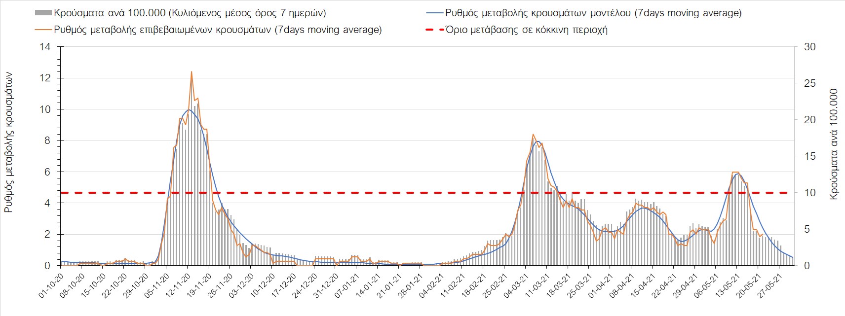 Σχήμα 52. Πορεία του ημερησίου αριθμού των κρουσμάτων (κυλιόμενος μέσος όρος 7 ημερών) στην Θάσο Συμπεράσματα:Με βάση τα αποτελέσματα, είχαμε μια ελαφρά αύξηση των ασθενών σε κρίσιμη κατάσταση (διασωληνωμένοι σε ΜΕΘ) σε σχέση με προχθές, και συνολικά συνεχίζει η συνολικά αργή αποκλιμάκωση, η οποία εκφράζεται και στον αριθμό των θανάτων. Οι προβλέψεις αυτές συνάδουν με τις προσομοιώσεις του μοντέλου CORE, όπως και ο αριθμός των κρουσμάτων, μετά και τις επικαιροποιημένες προβλέψεις προ 2 μηνών, όπου ελήφθη υπόψιν η μεγαλύτερη διασπορά των μεταλλαγμένων και ταχύτερα μεταδιδόμενων στελεχών. Σε πανελλαδικό επίπεδο ο κυλιόμενος εβδομαδιαίος μέσος όρος του δείκτη θετικότητας διαμορφώθηκε στο 4,3% (η ημερήσια τιμή είναι 3,8%) ενώ ο κυλιόμενος εβδομαδιαίος μέσος όρος του πραγματικού αριθμού αναπαραγωγής Rt (δηλαδή ο αριθμός των ατόμων που ένας φορέας μπορεί να επιμολύνει) διαμορφώθηκε στο 0,90 (τιμές του Rt πάνω από τη μονάδα υποδηλώνουν καθαρή αύξηση της διασποράς του ιού στην κοινότητα). Η ταυτόχρονη αύξηση και των δύο δεικτών, που παρατηρήθηκε την εβδομάδα μετά του Πάσχα, υποδηλώνει την συνολικά αυξητική πορεία στο συνολικό αριθμό κρουσμάτων στη χώρα από την Πέμπτη του Πάσχα και έπειτα. Με βάση τα αποτελέσματα, βλέπουμε ότι οι ανοδικές τάσεις διαφόρων περιοχών οι οποίες χρονικά συνάδουν με αύξηση επαφών τις ημέρες του Πάσχα, έχουν περιέλθει σε κάμψη. Παρόλο που την προηγούμενη εβδομάδα παρατηρήθηκε μείωση και των δύο δεικτών, είναι σημαντικό να διατηρηθεί ο υψηλός αριθμός των τεστ ανίχνευσης, έτσι ώστε να μπορούμε να έχουμε καλή εικόνα της διασποράς της πανδημίας στις επόμενες ημέρες, όπου συνδυάζονται με τα πιο πρόσφατα ανοίγματα (εστίαση, άνοιγμα Δημοτικών και Γυμνασίων). Όπως ήδη αναφέρθηκε, αναμένεται στις επόμενες ημέρες μια προσωρινή αύξηση του αριθμού των κρουσμάτων, η οποία θα οδηγήσει σε ένα μέγιστο μεταξύ των 2000 – 2500 κρούσματα/ημέρα (κυλιόμενος εβδομαδιαίος μέσος όρος) στο τέλος Μαΐου, ανάλογα με το βαθμό που θα συνεχίσει η συμμόρφωση στα μέτρα περιορισμού της πανδημίας. Η ήπια αναχαίτιση του 3ου κύματος που παρατηρούνταν μέχρι και τις ημέρες του Πάσχα, οφείλονταν σε ένα συνδυασμό παραμέτρων, οι οποίες είναι η συνέχιση του lockdown, η χρήση των self-test, η αύξηση του αριθμού των τεστ από τον ΕΟΔΥ, γεγονός που συντελεί στην απομάκρυνση από τις αλυσίδες μετάδοσης των ασυμπτωματικών και προσυμπτωματικών φορέων, η προοδευτική βελτίωση του καιρού και σε μικρότερο βαθμό η πρόοδος των εμβολιασμών, η σημασία των οποίων στον έλεγχο της πανδημίας θα αρχίσει να είναι πιο εμφανής από το τέλος του επόμενου μήνα, ιδιαίτερα λαμβάνοντας υπόψιν τη σημαντική αύξηση του ρυθμού εμβολιασμού, με περίπου 110.000 εμβολιασμούς ημερησίως. Όμως, με δεδομένο το άνοιγμα του λιανικού εμπορίου και όλων των εκπαιδευτικών βαθμίδων πλέον, είναι ακόμα πιο σημαντική η τήρηση των μέτρων, ενώ ύψιστης σημασίας στις επόμενες εβδομάδες θα αποδειχθεί η ορθή και μαζική εφαρμογή των self-test, με ταυτόχρονη αύξηση της ιχνηλασίας των επαφών των ανιχνευθέντων ως θετικοί και καραντίνα 14 ημερών για τους συμπολίτες μας που θα επιβεβαιωθεί ότι είναι θετικοί στην μόλυνση με SARS-CoV-2 ακόμη και αν είναι ασυμπτωματικοί. Δεδομένου ότι τελικά ο αριθμός των self-test που πραγματοποιούνται ημερησίως δεν έχει φθάσει στα επιθυμητά νούμερα στα οποία βασίζονται οι προβολές που παρουσιάζονται στην παρούσα τεχ