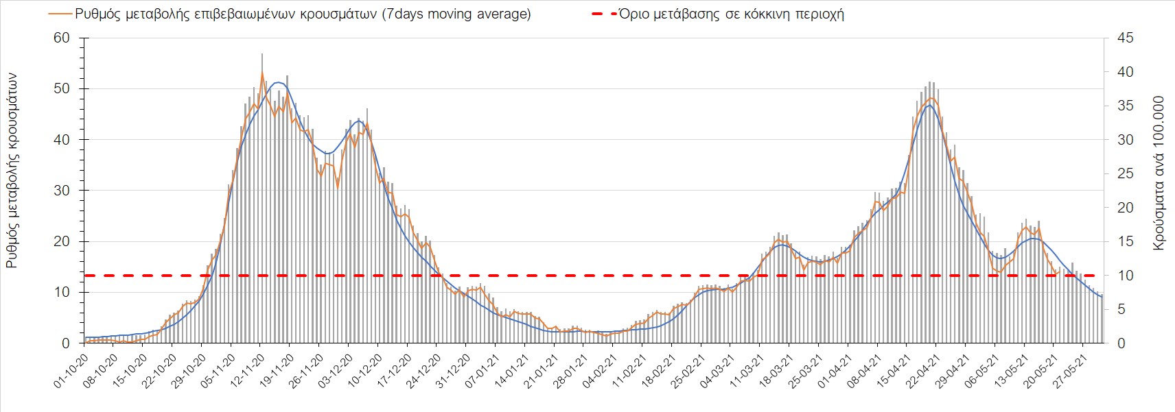Σχήμα 10. Πορεία του ημερησίου αριθμού των κρουσμάτων (κυλιόμενος μέσος όρος 7 ημερών) στη Μαγνησία