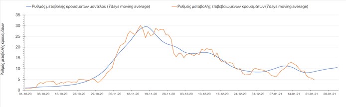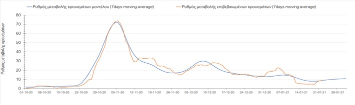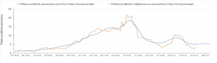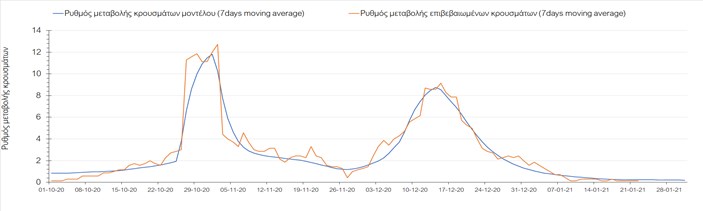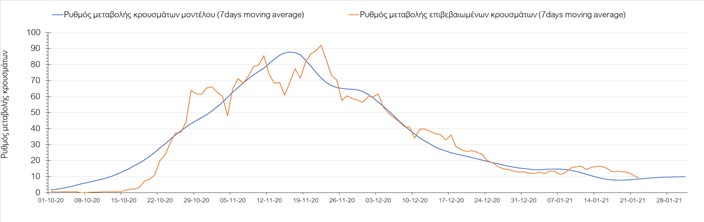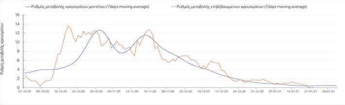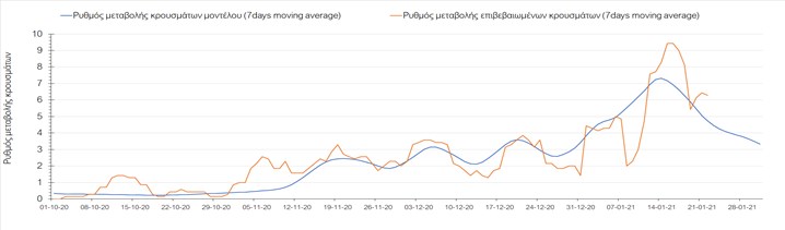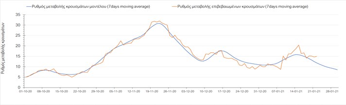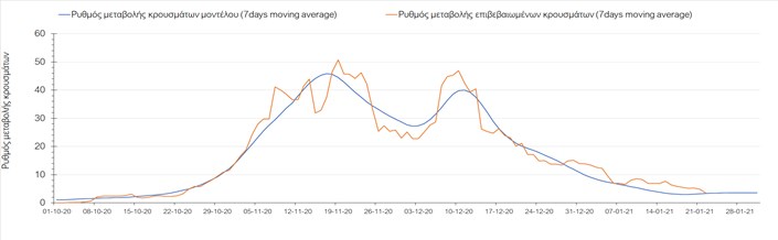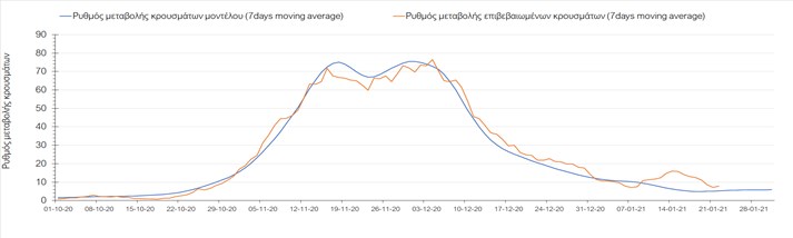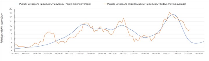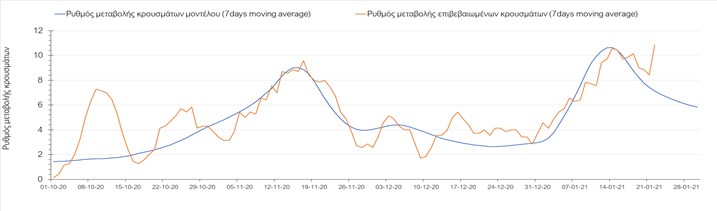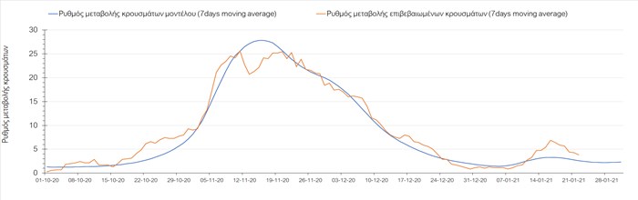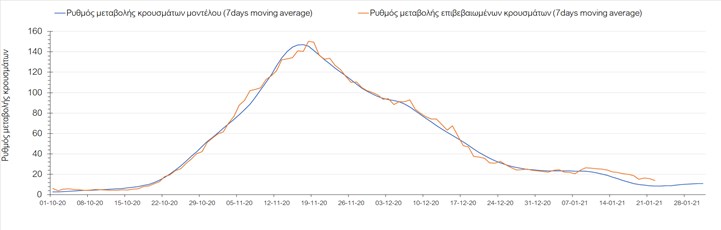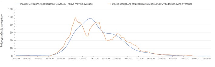 Όπως φαίνεται από το σχήμα, από τις 8 Ιανουαρίου έχουμε μια αύξηση κρουσμάτων μέχρι τις 11 Ιανουαρίου και η οποία οφείλεται στη μείωση της περιστολής που σημειώθηκε στις γιορτές. Από τις 11 μέχρι τις 18 Ιανουαρίου προβλέπεται μια μείωση κρουσμάτων λόγω της εφαρμογής του lockdown που είναι σε ισχύ αυτήν την εβδομάδα. Από τις 23 Ιανουαρίου και έπειτα προβλέπεται να διαφανεί μια ελαφρά αύξηση στον κυλιόμενο μέσο όρο των κρουσμάτων που θα συνεχιστεί μέχρι το τέλος του μήνα.