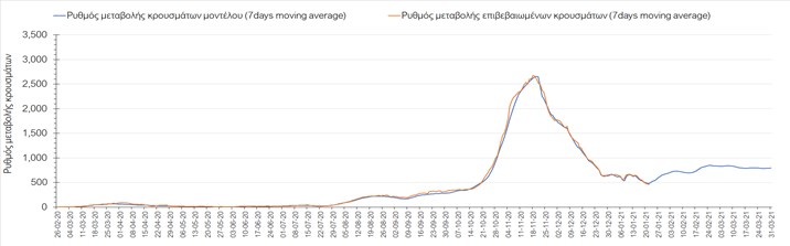 Σχήμα 3. Πορεία του ημερησίου αριθμού των κρουσμάτων (κυλιόμενος μέσος όρος 7 ημερών) στην Ελληνική επικράτεια