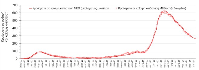 Σχήμα 1. Αριθμός κρουσμάτων σε κρίσιμη κατάσταση (ΜΕΘ) σύμφωνα με τα στοιχεία του ΕΟΔΥ και τις προβλέψεις της υπολογιστικής πλατφόρμας CORE.