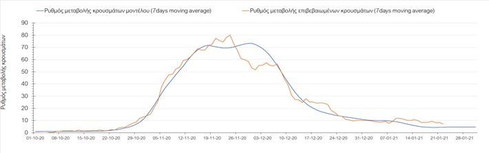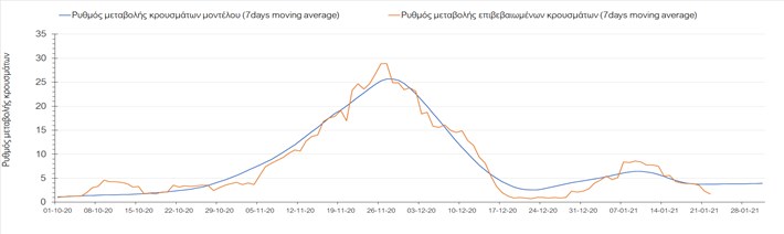Όπως φαίνεται από το σχήμα, από τις 8 Ιανουαρίου έχουμε μια αύξηση κρουσμάτων μέχρι τις 11 Ιανουαρίου και η οποία οφείλεται στη μείωση της περιστολής που σημειώθηκε στις γιορτές. Από τις 11 μέχρι τις 18 Ιανουαρίου προβλέπεται μια μείωση κρουσμάτων λόγω της εφαρμογής του lockdown που είναι σε ισχύ αυτήν την εβδομάδα. Από τις 23 Ιανουαρίου και έπειτα προβλέπεται να διαφανεί μια ελαφρά αύξηση στον κυλιόμενο μέσο όρο των κρουσμάτων που θα συνεχιστεί μέχρι το τέλος του μήνα.
