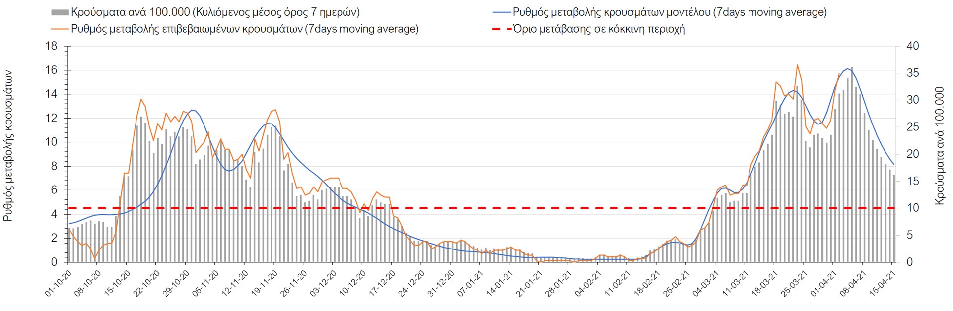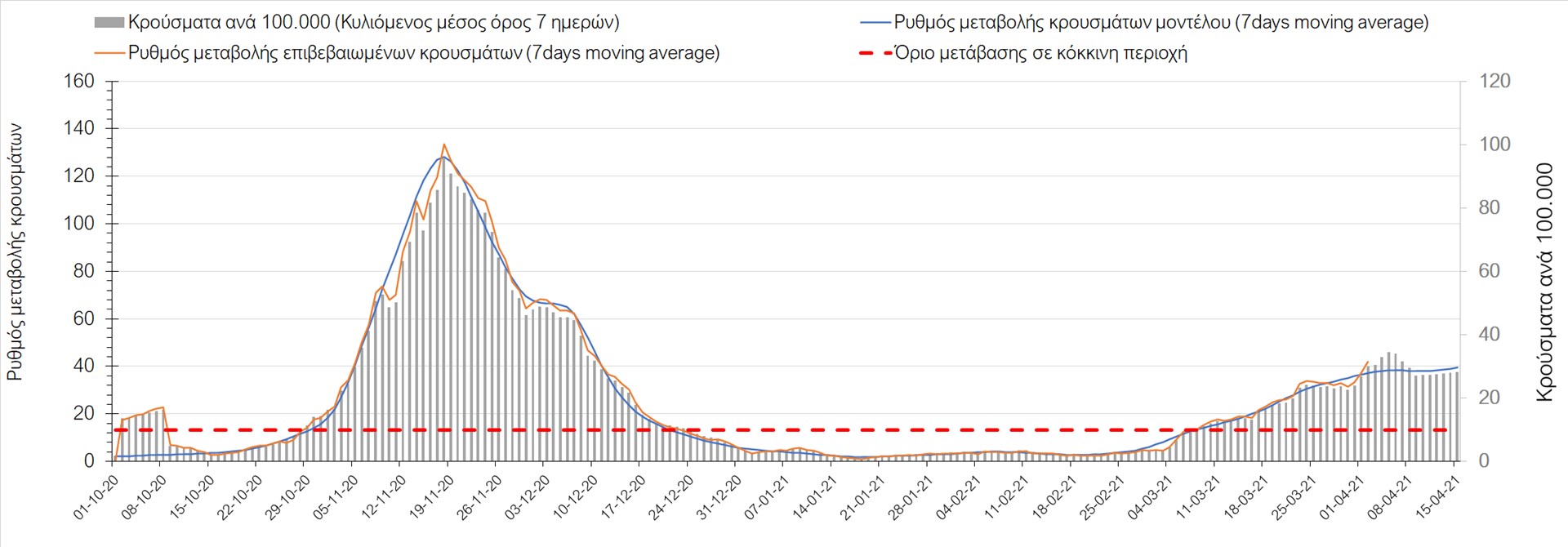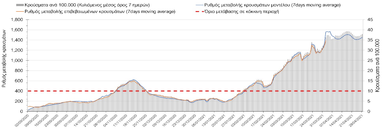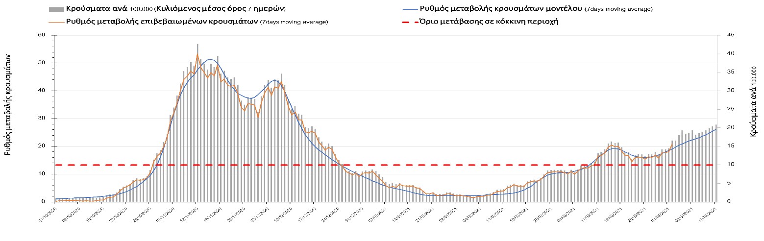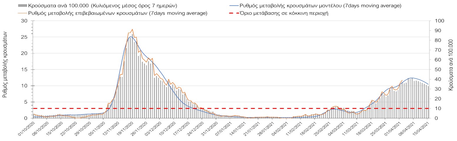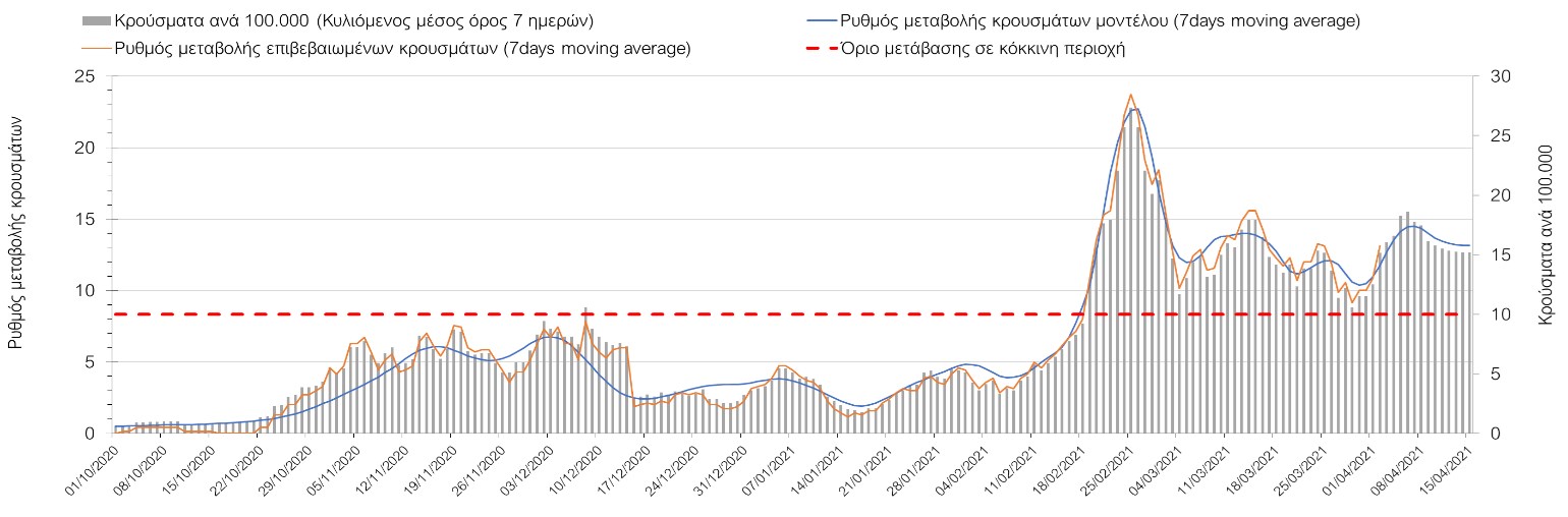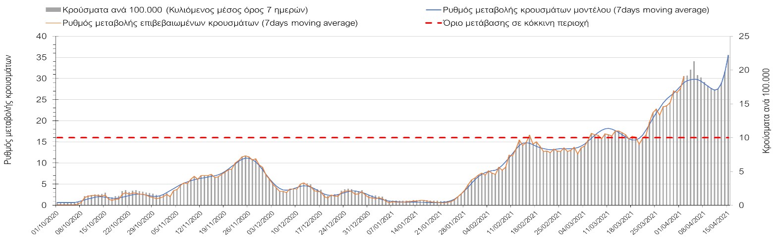 Συμπεράσματα:Η αύξηση που παρατηρείται πλέον στον αριθμό των ασθενών σε κρίσιμη κατάσταση (διασωληνωμένοι σε ΜΕΘ), καθώς και ο αριθμός των θανάτων (αν και με κάποια μικρή απόκλιση την Παρασκευή) συνάδουν με τις προσομοιώσεις του μοντέλου CORE, όπως και ο αριθμός των κρουσμάτων, μετά και τις επικαιροποιημένες προβλέψεις προ 15 ημερών, όπου ελήφθη υπόψιν η μεγαλύτερη διασπορά των μεταλλαγμένων και ταχύτερα μεταδιδόμενων στελεχών. Σε πανελλαδικό επίπεδο ο κυλιόμενος εβδομαδιαίος μέσος όρος του δείκτη θετικότητας διαμορφώθηκε στο 6,9% (η ημερήσια τιμή την Παρασκευή ήταν 5,4%) ενώ ο κυλιόμενος εβδομαδιαίος μέσος όρος του πραγματικού αριθμού αναπαραγωγής Rt (δηλαδή ο αριθμός των ατόμων που ένας φορέας μπορεί να επιμολύνει) διαμορφώθηκε στο 1,17 (τιμές του Rt πάνω από τη μονάδα υποδηλώνουν καθαρή αύξηση της διασποράς του ιού στην κοινότητα). Παρά την εφαρμογή οριζόντιων μέτρων ανάσχεσης της πανδημίας που εφαρμόσθηκαν από τα τέλη Οκτωβρίου, η πορεία της τελευταίας διαφοροποιείται από περιοχή σε περιοχή. Οι παραπάνω παρατηρήσεις τείνουν στο συμπέρασμα ότι η διαχείριση του υγειονομικού κινδύνου θα πρέπει να εξεταστεί σε τοπικό επίπεδο. Πλέον προβληματίζουν πέρα από την Αττική και τη Θεσσαλονίκη, η Αχαΐα, η Αιτωλοακαρνανία, η Εύβοια, η Βοιωτία, η Χαλκιδική, καθώς επίσης η Αρκαδία, η Ηλεία, η Αργολίδα, η Κορινιθία, η Φθιώτιδα, η Ευρυτανία, η Λάρισα, η Κοζάνη, η Καστοριά, η Καβάλα, η Χίος, το Ηράκλειο, τα Χανιά, τα Ιωάννινα, η Ημαθία, η Πέλλα, το Κιλκίς, τα Γρεβενά, η Μαγνησία και η Καρδίτσα. Ανάγκη αυξημένης επιτήρησης έχουν το Κιλκίς και οι Σέρρες, Συνολικά, τα τεστ ανίχνευσης θα πρέπει να φτάσουν τουλάχιστον στα 120.000 και να δίνεται έμφαση στοχευμένα στις περιφερειακές ενότητες στις οποίες η δυναμική της διασποράς φαίνεται να είναι ανησυχητική για 1-2 ημέρες ώστε να ανιχνεύονται οι ασυμπτωματικοί και προσυμπτωματικοί φορείς και να σπάει η αλυσίδα μετάδοσης βάζοντάς τους σε καραντίνα. Λόγω της ανησυχίας που εγείρει η παρουσία στην κοινότητα των μεταλλαγμένων στελέχους του SARS-CoV-2 (κυρίως η βρετανική και η νοτιοαφρικανική μετάλλαξη) και προκειμένου να περιορίσουμε ή τουλάχιστον να καθυστερήσουμε την ευρεία διασπορά τους, προτείνουμε τα ακόλουθα μέτρα πριν συζητηθεί το περαιτέρω άνοιγμα εκπαιδευτικών και οικονομικών δραστηριοτήτων:– πιστή εφαρμογή του ήδη υπάρχοντος νομοθετικού πλαισίου για την τηλεργασία (όσο το δυνατόν περισσότερο, αλλά τουλάχιστον 50%) ή ακόμη και αύξηση του ελάχιστου ορίου τηλεργασίας στο 75% όπου αυτό είναι δυνατόν τόσο από δημόσιους όσο και ιδιωτικούς φορείς – είναι απαραίτητο να υπάρξει άμεσα πολύ μεγαλύτερος έλεγχος της εφαρμογής της σχετικής ΚΥΑ από όλους τους εργοδότες του ιδιωτικού και δημόσιου τομέα. Σημερινά στοιχεία δείχνουν ότι το επίπεδο τηλεργασίας στον ιδιωτικό τομέα ανέρχεται οριακά στο 25%. Υπάρχει άμεση ανάγκη για επιτήρηση της εφαρμογής της σήμερα ισχύουσας νομοθεσίας και για την περαιτέρω ενίσχυσή της. – αύξηση του αριθμού των δοκιμών (συμπεριλαμβανομένων τόσο των δοκιμών RT-PCR όσο και των ταχέων δοκιμών που βασίζονται σε αντιγόνα) σε βιομηχανικές και βιοτεχνικές εγκαταστάσεις και γενικά σε χώρους εργασίας με μεγάλη πιθανότητα συγχρωτισμού λόγω της φύσης της παραγωγικής διαδικασίας.– αύξηση του αριθμού των δοκιμών (συμπεριλαμβανομένων τόσο των δοκιμών RT-PCR όσο και των ταχέων δοκιμών που βασίζονται σε αντιγόν
