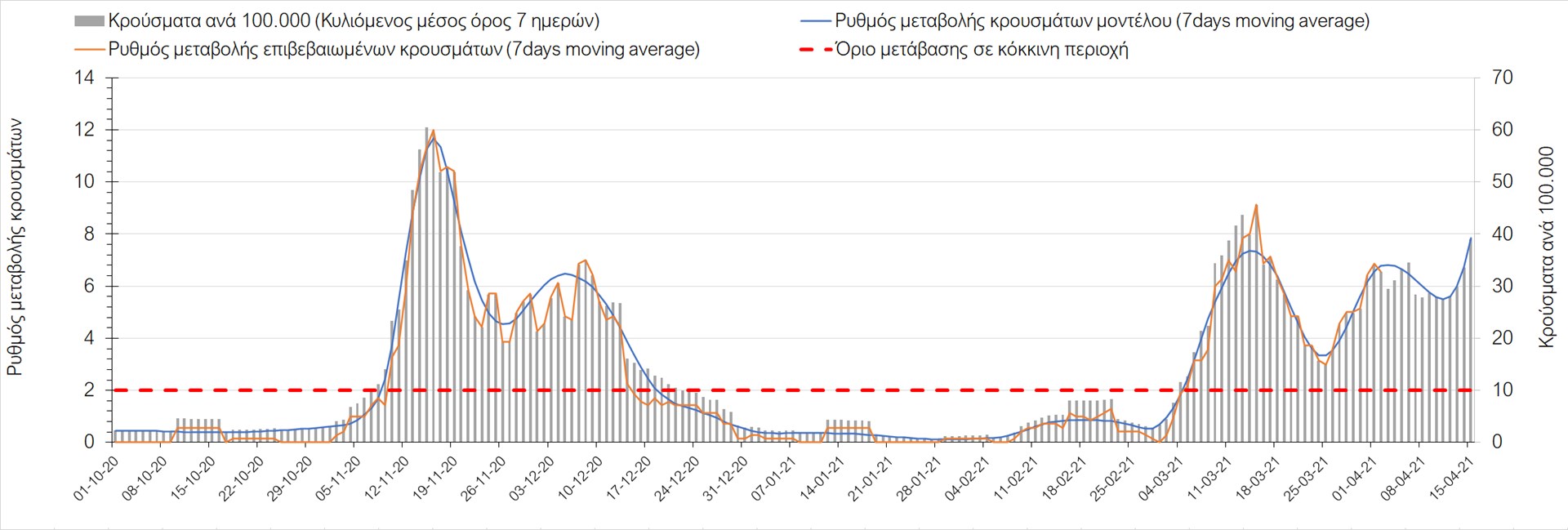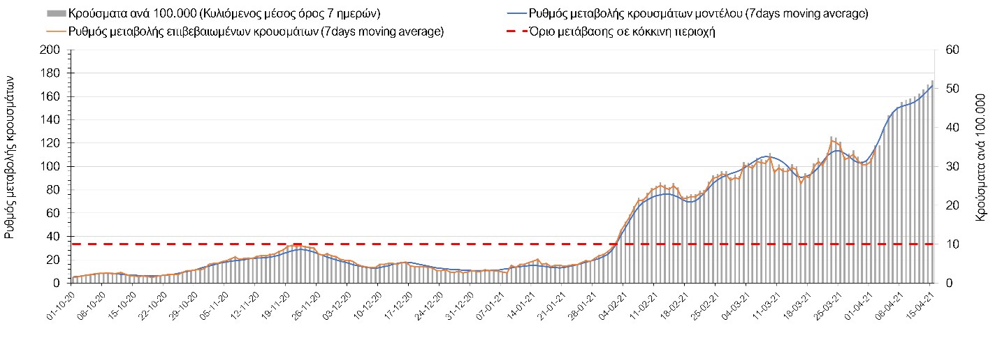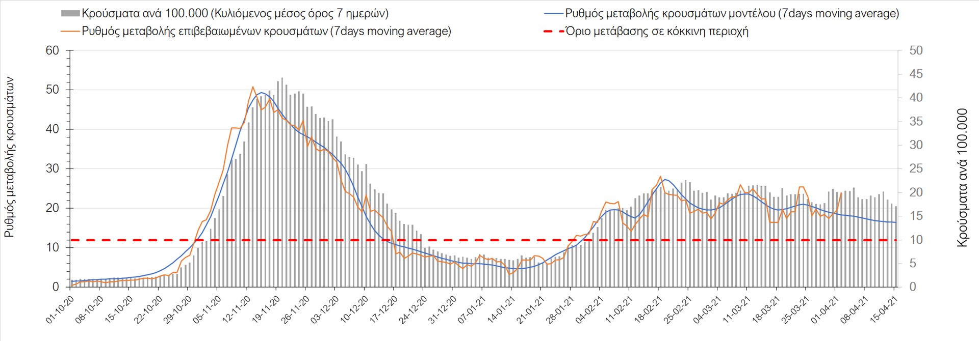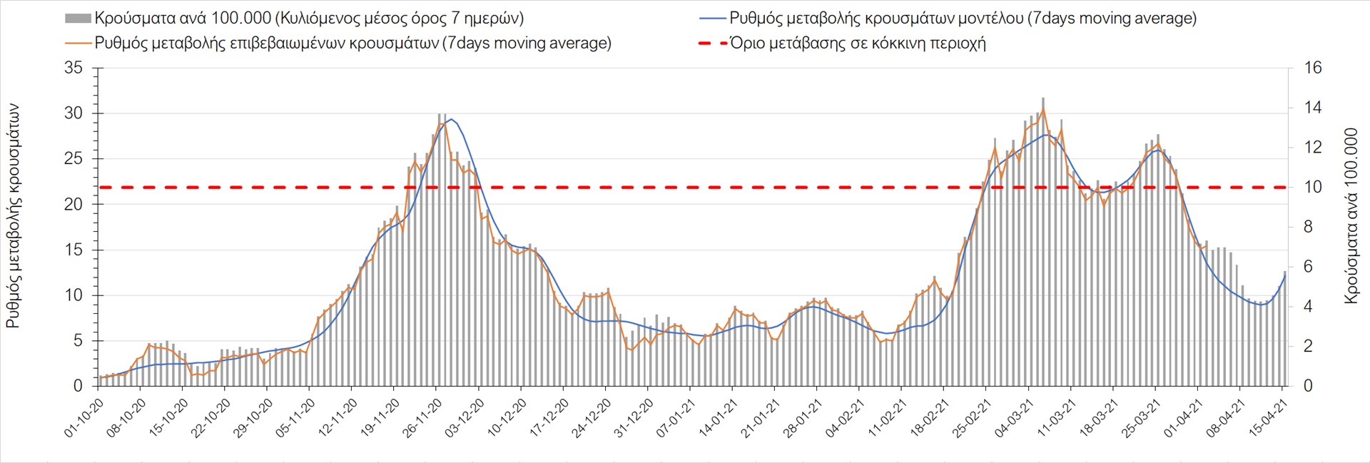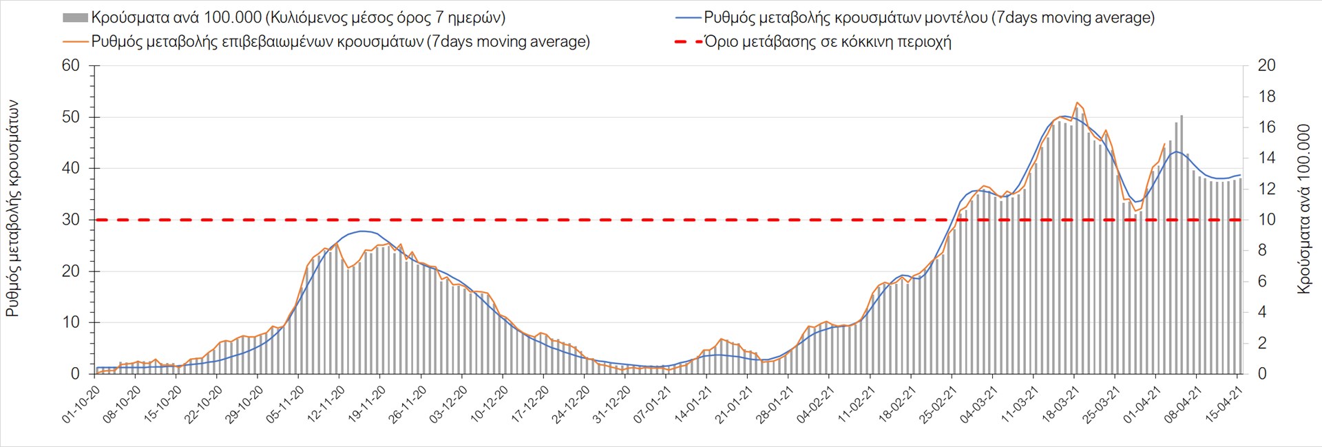 Συμπεράσματα:Η αύξηση που παρατηρείται πλέον στον αριθμό των ασθενών σε κρίσιμη κατάσταση (διασωληνωμένοι σε ΜΕΘ), καθώς και ο αριθμός των θανάτων (αν και με κάποια μικρή απόκλιση την Παρασκευή) συνάδουν με τις προσομοιώσεις του μοντέλου CORE, όπως και ο αριθμός των κρουσμάτων, μετά και τις επικαιροποιημένες προβλέψεις προ 15 ημερών, όπου ελήφθη υπόψιν η μεγαλύτερη διασπορά των μεταλλαγμένων και ταχύτερα μεταδιδόμενων στελεχών. Σε πανελλαδικό επίπεδο ο κυλιόμενος εβδομαδιαίος μέσος όρος του δείκτη θετικότητας διαμορφώθηκε στο 6,9% (η ημερήσια τιμή την Παρασκευή ήταν 5,4%) ενώ ο κυλιόμενος εβδομαδιαίος μέσος όρος του πραγματικού αριθμού αναπαραγωγής Rt (δηλαδή ο αριθμός των ατόμων που ένας φορέας μπορεί να επιμολύνει) διαμορφώθηκε στο 1,17 (τιμές του Rt πάνω από τη μονάδα υποδηλώνουν καθαρή αύξηση της διασποράς του ιού στην κοινότητα). Παρά την εφαρμογή οριζόντιων μέτρων ανάσχεσης της πανδημίας που εφαρμόσθηκαν από τα τέλη Οκτωβρίου, η πορεία της τελευταίας διαφοροποιείται από περιοχή σε περιοχή. Οι παραπάνω παρατηρήσεις τείνουν στο συμπέρασμα ότι η διαχείριση του υγειονομικού κινδύνου θα πρέπει να εξεταστεί σε τοπικό επίπεδο. Πλέον προβληματίζουν πέρα από την Αττική και τη Θεσσαλονίκη, η Αχαΐα, η Αιτωλοακαρνανία, η Εύβοια, η Βοιωτία, η Χαλκιδική, καθώς επίσης η Αρκαδία, η Ηλεία, η Αργολίδα, η Κορινιθία, η Φθιώτιδα, η Ευρυτανία, η Λάρισα, η Κοζάνη, η Καστοριά, η Καβάλα, η Χίος, το Ηράκλειο, τα Χανιά, τα Ιωάννινα, η Ημαθία, η Πέλλα, το Κιλκίς, τα Γρεβενά, η Μαγνησία και η Καρδίτσα. Ανάγκη αυξημένης επιτήρησης έχουν το Κιλκίς και οι Σέρρες, Συνολικά, τα τεστ ανίχνευσης θα πρέπει να φτάσουν τουλάχιστον στα 120.000 και να δίνεται έμφαση στοχευμένα στις περιφερειακές ενότητες στις οποίες η δυναμική της διασποράς φαίνεται να είναι ανησυχητική για 1-2 ημέρες ώστε να ανιχνεύονται οι ασυμπτωματικοί και προσυμπτωματικοί φορείς και να σπάει η αλυσίδα μετάδοσης βάζοντάς τους σε καραντίνα. Λόγω της ανησυχίας που εγείρει η παρουσία στην κοινότητα των μεταλλαγμένων στελέχους του SARS-CoV-2 (κυρίως η βρετανική και η νοτιοαφρικανική μετάλλαξη) και προκειμένου να περιορίσουμε ή τουλάχιστον να καθυστερήσουμε την ευρεία διασπορά τους, προτείνουμε τα ακόλουθα μέτρα πριν συζητηθεί το περαιτέρω άνοιγμα εκπαιδευτικών και οικονομικών δραστηριοτήτων:– πιστή εφαρμογή του ήδη υπάρχοντος νομοθετικού πλαισίου για την τηλεργασία (όσο το δυνατόν περισσότερο, αλλά τουλάχιστον 50%) ή ακόμη και αύξηση του ελάχιστου ορίου τηλεργασίας στο 75% όπου αυτό είναι δυνατόν τόσο από δημόσιους όσο και ιδιωτικούς φορείς – είναι απαραίτητο να υπάρξει άμεσα πολύ μεγαλύτερος έλεγχος της εφαρμογής της σχετικής ΚΥΑ από όλους τους εργοδότες του ιδιωτικού και δημόσιου τομέα. Σημερινά στοιχεία δείχνουν ότι το επίπεδο τηλεργασίας στον ιδιωτικό τομέα ανέρχεται οριακά στο 25%. Υπάρχει άμεση ανάγκη για επιτήρηση της εφαρμογής της σήμερα ισχύουσας νομοθεσίας και για την περαιτέρω ενίσχυσή της. – αύξηση του αριθμού των δοκιμών (συμπεριλαμβανομένων τόσο των δοκιμών RT-PCR όσο και των ταχέων δοκιμών που βασίζονται σε αντιγόνα) σε βιομηχανικές και βιοτεχνικές εγκαταστάσεις και γενικά σε χώρους εργασίας με μεγάλη πιθανότητα συγχρωτισμού λόγω της φύσης της παραγωγικής διαδικασίας.– αύξηση του αριθμού των δοκιμών (συμπεριλαμβανομένων τόσο των δοκιμών RT-PCR όσο και των ταχέων δοκιμών που βασίζονται σε αντιγόν