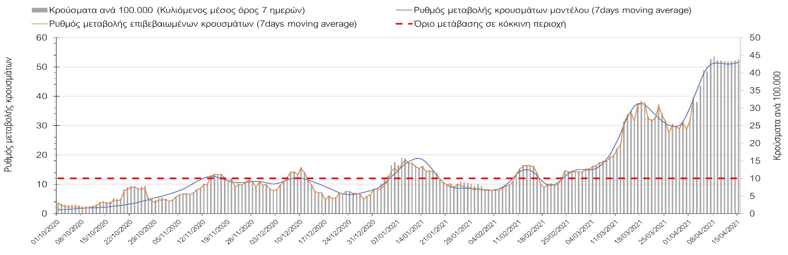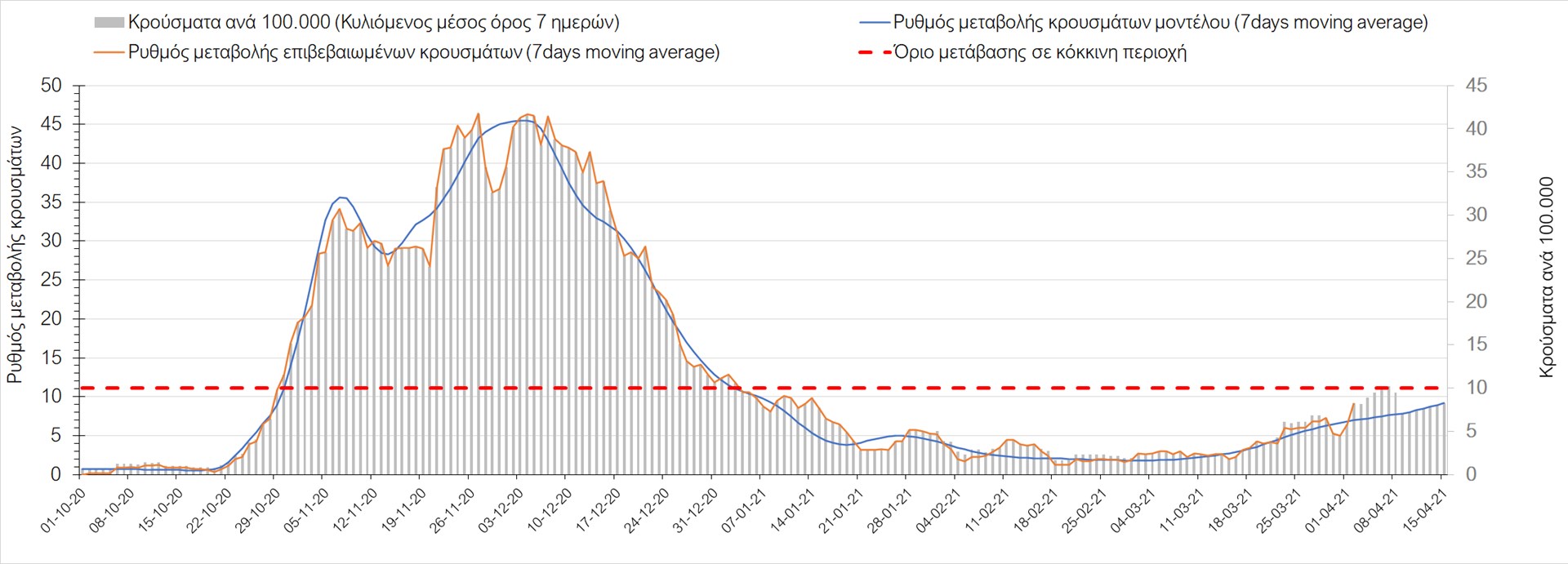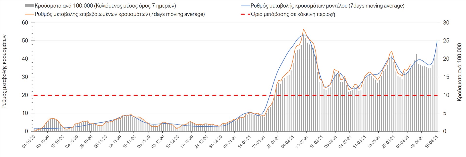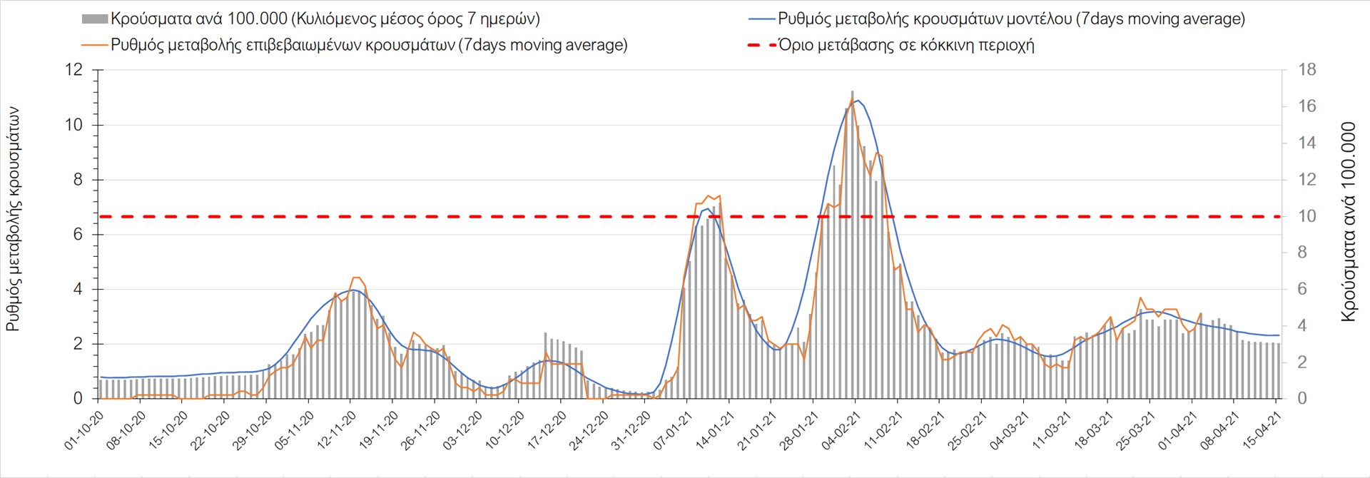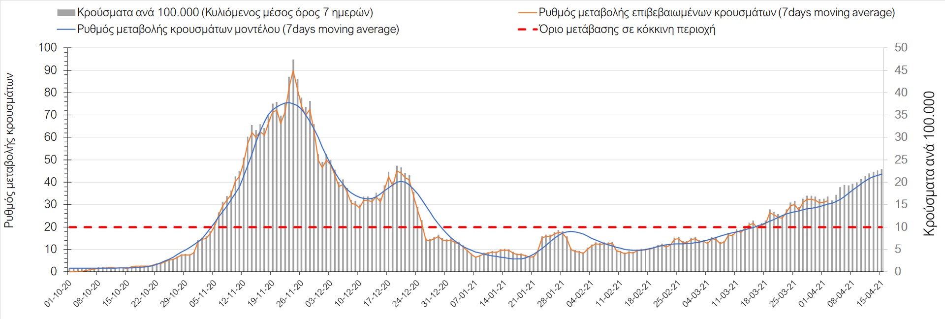 Συμπεράσματα:Η αύξηση που παρατηρείται πλέον στον αριθμό των ασθενών σε κρίσιμη κατάσταση (διασωληνωμένοι σε ΜΕΘ), καθώς και ο αριθμός των θανάτων (αν και με κάποια μικρή απόκλιση την Παρασκευή) συνάδουν με τις προσομοιώσεις του μοντέλου CORE, όπως και ο αριθμός των κρουσμάτων, μετά και τις επικαιροποιημένες προβλέψεις προ 15 ημερών, όπου ελήφθη υπόψιν η μεγαλύτερη διασπορά των μεταλλαγμένων και ταχύτερα μεταδιδόμενων στελεχών. Σε πανελλαδικό επίπεδο ο κυλιόμενος εβδομαδιαίος μέσος όρος του δείκτη θετικότητας διαμορφώθηκε στο 6,9% (η ημερήσια τιμή την Παρασκευή ήταν 5,4%) ενώ ο κυλιόμενος εβδομαδιαίος μέσος όρος του πραγματικού αριθμού αναπαραγωγής Rt (δηλαδή ο αριθμός των ατόμων που ένας φορέας μπορεί να επιμολύνει) διαμορφώθηκε στο 1,17 (τιμές του Rt πάνω από τη μονάδα υποδηλώνουν καθαρή αύξηση της διασποράς του ιού στην κοινότητα). Παρά την εφαρμογή οριζόντιων μέτρων ανάσχεσης της πανδημίας που εφαρμόσθηκαν από τα τέλη Οκτωβρίου, η πορεία της τελευταίας διαφοροποιείται από περιοχή σε περιοχή. Οι παραπάνω παρατηρήσεις τείνουν στο συμπέρασμα ότι η διαχείριση του υγειονομικού κινδύνου θα πρέπει να εξεταστεί σε τοπικό επίπεδο. Πλέον προβληματίζουν πέρα από την Αττική και τη Θεσσαλονίκη, η Αχαΐα, η Αιτωλοακαρνανία, η Εύβοια, η Βοιωτία, η Χαλκιδική, καθώς επίσης η Αρκαδία, η Ηλεία, η Αργολίδα, η Κορινιθία, η Φθιώτιδα, η Ευρυτανία, η Λάρισα, η Κοζάνη, η Καστοριά, η Καβάλα, η Χίος, το Ηράκλειο, τα Χανιά, τα Ιωάννινα, η Ημαθία, η Πέλλα, το Κιλκίς, τα Γρεβενά, η Μαγνησία και η Καρδίτσα. Ανάγκη αυξημένης επιτήρησης έχουν το Κιλκίς και οι Σέρρες, Συνολικά, τα τεστ ανίχνευσης θα πρέπει να φτάσουν τουλάχιστον στα 120.000 και να δίνεται έμφαση στοχευμένα στις περιφερειακές ενότητες στις οποίες η δυναμική της διασποράς φαίνεται να είναι ανησυχητική για 1-2 ημέρες ώστε να ανιχνεύονται οι ασυμπτωματικοί και προσυμπτωματικοί φορείς και να σπάει η αλυσίδα μετάδοσης βάζοντάς τους σε καραντίνα. Λόγω της ανησυχίας που εγείρει η παρουσία στην κοινότητα των μεταλλαγμένων στελέχους του SARS-CoV-2 (κυρίως η βρετανική και η νοτιοαφρικανική μετάλλαξη) και προκειμένου να περιορίσουμε ή τουλάχιστον να καθυστερήσουμε την ευρεία διασπορά τους, προτείνουμε τα ακόλουθα μέτρα πριν συζητηθεί το περαιτέρω άνοιγμα εκπαιδευτικών και οικονομικών δραστηριοτήτων:– πιστή εφαρμογή του ήδη υπάρχοντος νομοθετικού πλαισίου για την τηλεργασία (όσο το δυνατόν περισσότερο, αλλά τουλάχιστον 50%) ή ακόμη και αύξηση του ελάχιστου ορίου τηλεργασίας στο 75% όπου αυτό είναι δυνατόν τόσο από δημόσιους όσο και ιδιωτικούς φορείς – είναι απαραίτητο να υπάρξει άμεσα πολύ μεγαλύτερος έλεγχος της εφαρμογής της σχετικής ΚΥΑ από όλους τους εργοδότες του ιδιωτικού και δημόσιου τομέα. Σημερινά στοιχεία δείχνουν ότι το επίπεδο τηλεργασίας στον ιδιωτικό τομέα ανέρχεται οριακά στο 25%. Υπάρχει άμεση ανάγκη για επιτήρηση της εφαρμογής της σήμερα ισχύουσας νομοθεσίας και για την περαιτέρω ενίσχυσή της. – αύξηση του αριθμού των δοκιμών (συμπεριλαμβανομένων τόσο των δοκιμών RT-PCR όσο και των ταχέων δοκιμών που βασίζονται σε αντιγόνα) σε βιομηχανικές και βιοτεχνικές εγκαταστάσεις και γενικά σε χώρους εργασίας με μεγάλη πιθανότητα συγχρωτισμού λόγω της φύσης της παραγωγικής διαδικασίας.– αύξηση του αριθμού των δοκιμών (συμπεριλαμβανομένων τόσο των δοκιμών RT-PCR όσο και των ταχέων δοκιμών που βασίζονται σε αντιγόν