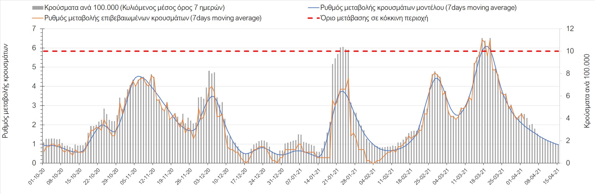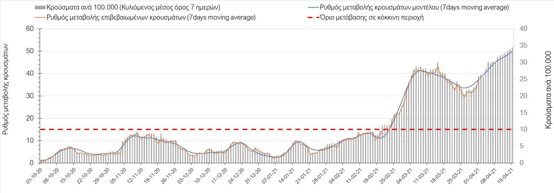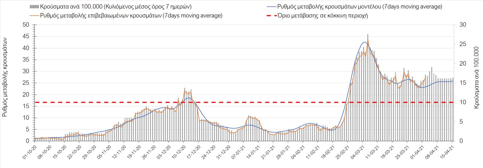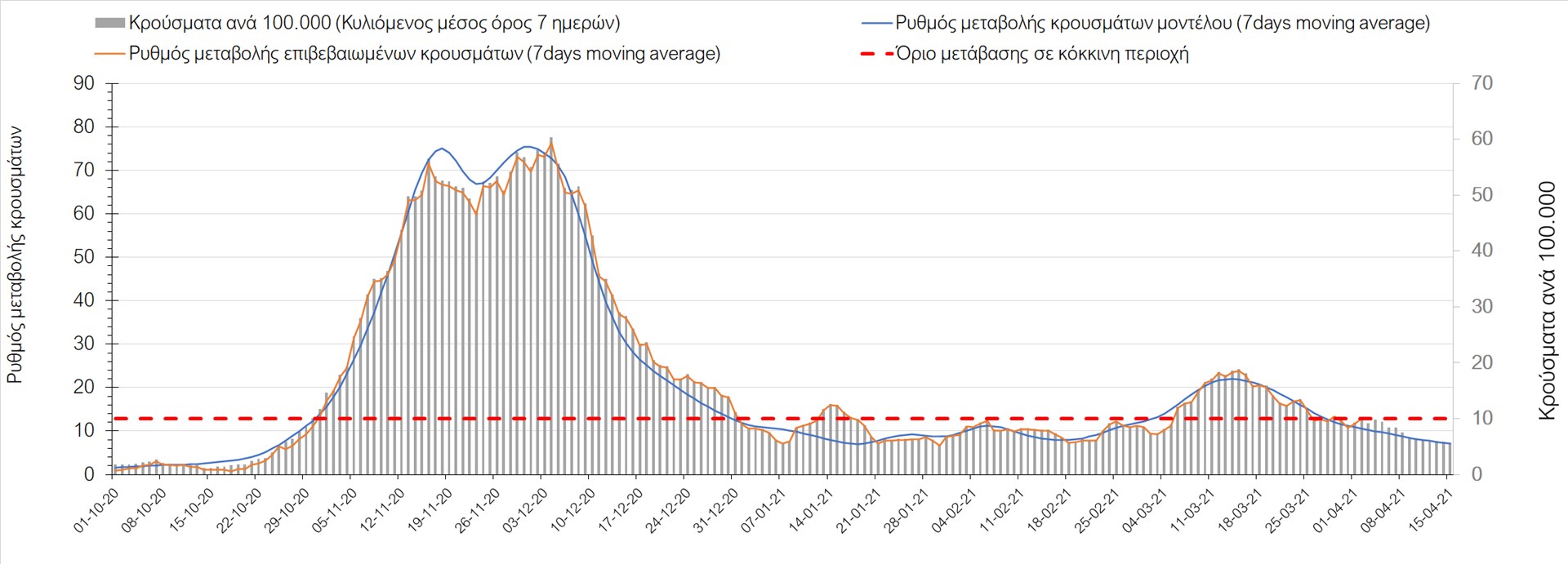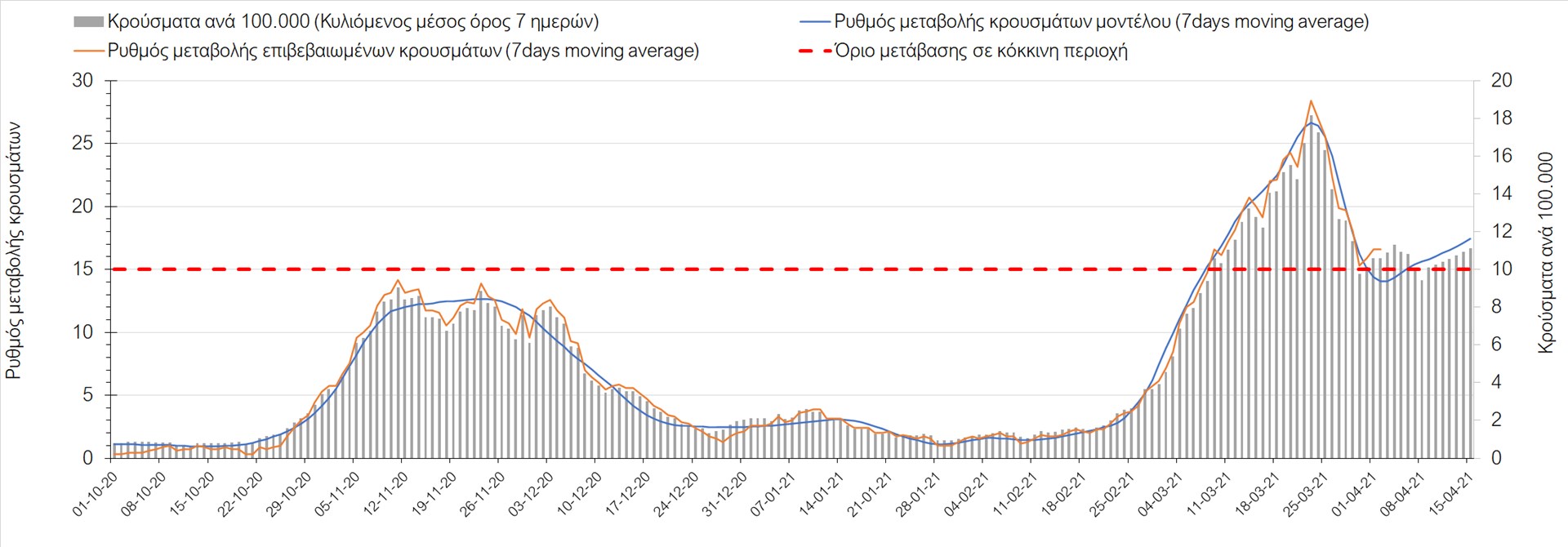 Συμπεράσματα:Η αύξηση που παρατηρείται πλέον στον αριθμό των ασθενών σε κρίσιμη κατάσταση (διασωληνωμένοι σε ΜΕΘ), καθώς και ο αριθμός των θανάτων (αν και με κάποια μικρή απόκλιση την Παρασκευή) συνάδουν με τις προσομοιώσεις του μοντέλου CORE, όπως και ο αριθμός των κρουσμάτων, μετά και τις επικαιροποιημένες προβλέψεις προ 15 ημερών, όπου ελήφθη υπόψιν η μεγαλύτερη διασπορά των μεταλλαγμένων και ταχύτερα μεταδιδόμενων στελεχών. Σε πανελλαδικό επίπεδο ο κυλιόμενος εβδομαδιαίος μέσος όρος του δείκτη θετικότητας διαμορφώθηκε στο 6,9% (η ημερήσια τιμή την Παρασκευή ήταν 5,4%) ενώ ο κυλιόμενος εβδομαδιαίος μέσος όρος του πραγματικού αριθμού αναπαραγωγής Rt (δηλαδή ο αριθμός των ατόμων που ένας φορέας μπορεί να επιμολύνει) διαμορφώθηκε στο 1,17 (τιμές του Rt πάνω από τη μονάδα υποδηλώνουν καθαρή αύξηση της διασποράς του ιού στην κοινότητα). Παρά την εφαρμογή οριζόντιων μέτρων ανάσχεσης της πανδημίας που εφαρμόσθηκαν από τα τέλη Οκτωβρίου, η πορεία της τελευταίας διαφοροποιείται από περιοχή σε περιοχή. Οι παραπάνω παρατηρήσεις τείνουν στο συμπέρασμα ότι η διαχείριση του υγειονομικού κινδύνου θα πρέπει να εξεταστεί σε τοπικό επίπεδο. Πλέον προβληματίζουν πέρα από την Αττική και τη Θεσσαλονίκη, η Αχαΐα, η Αιτωλοακαρνανία, η Εύβοια, η Βοιωτία, η Χαλκιδική, καθώς επίσης η Αρκαδία, η Ηλεία, η Αργολίδα, η Κορινιθία, η Φθιώτιδα, η Ευρυτανία, η Λάρισα, η Κοζάνη, η Καστοριά, η Καβάλα, η Χίος, το Ηράκλειο, τα Χανιά, τα Ιωάννινα, η Ημαθία, η Πέλλα, το Κιλκίς, τα Γρεβενά, η Μαγνησία και η Καρδίτσα. Ανάγκη αυξημένης επιτήρησης έχουν το Κιλκίς και οι Σέρρες, Συνολικά, τα τεστ ανίχνευσης θα πρέπει να φτάσουν τουλάχιστον στα 120.000 και να δίνεται έμφαση στοχευμένα στις περιφερειακές ενότητες στις οποίες η δυναμική της διασποράς φαίνεται να είναι ανησυχητική για 1-2 ημέρες ώστε να ανιχνεύονται οι ασυμπτωματικοί και προσυμπτωματικοί φορείς και να σπάει η αλυσίδα μετάδοσης βάζοντάς τους σε καραντίνα. Λόγω της ανησυχίας που εγείρει η παρουσία στην κοινότητα των μεταλλαγμένων στελέχους του SARS-CoV-2 (κυρίως η βρετανική και η νοτιοαφρικανική μετάλλαξη) και προκειμένου να περιορίσουμε ή τουλάχιστον να καθυστερήσουμε την ευρεία διασπορά τους, προτείνουμε τα ακόλουθα μέτρα πριν συζητηθεί το περαιτέρω άνοιγμα εκπαιδευτικών και οικονομικών δραστηριοτήτων:– πιστή εφαρμογή του ήδη υπάρχοντος νομοθετικού πλαισίου για την τηλεργασία (όσο το δυνατόν περισσότερο, αλλά τουλάχιστον 50%) ή ακόμη και αύξηση του ελάχιστου ορίου τηλεργασίας στο 75% όπου αυτό είναι δυνατόν τόσο από δημόσιους όσο και ιδιωτικούς φορείς – είναι απαραίτητο να υπάρξει άμεσα πολύ μεγαλύτερος έλεγχος της εφαρμογής της σχετικής ΚΥΑ από όλους τους εργοδότες του ιδιωτικού και δημόσιου τομέα. Σημερινά στοιχεία δείχνουν ότι το επίπεδο τηλεργασίας στον ιδιωτικό τομέα ανέρχεται οριακά στο 25%. Υπάρχει άμεση ανάγκη για επιτήρηση της εφαρμογής της σήμερα ισχύουσας νομοθεσίας και για την περαιτέρω ενίσχυσή της. – αύξηση του αριθμού των δοκιμών (συμπεριλαμβανομένων τόσο των δοκιμών RT-PCR όσο και των ταχέων δοκιμών που βασίζονται σε αντιγόνα) σε βιομηχανικές και βιοτεχνικές εγκαταστάσεις και γενικά σε χώρους εργασίας με μεγάλη πιθανότητα συγχρωτισμού λόγω της φύσης της παραγωγικής διαδικασίας.– αύξηση του αριθμού των δοκιμών (συμπεριλαμβανομένων τόσο των δοκιμών RT-PCR όσο και των ταχέων δοκιμών που βασίζονται σε αντιγόν