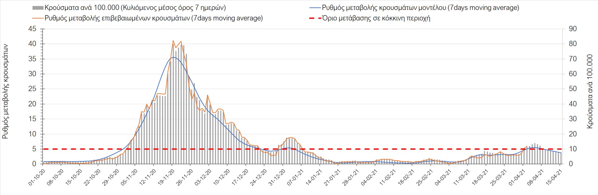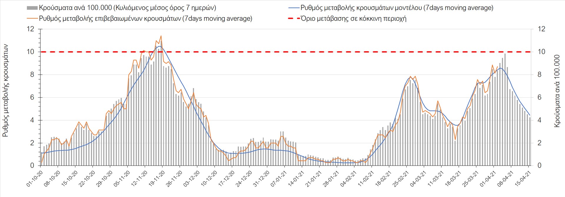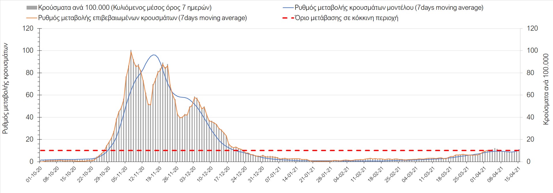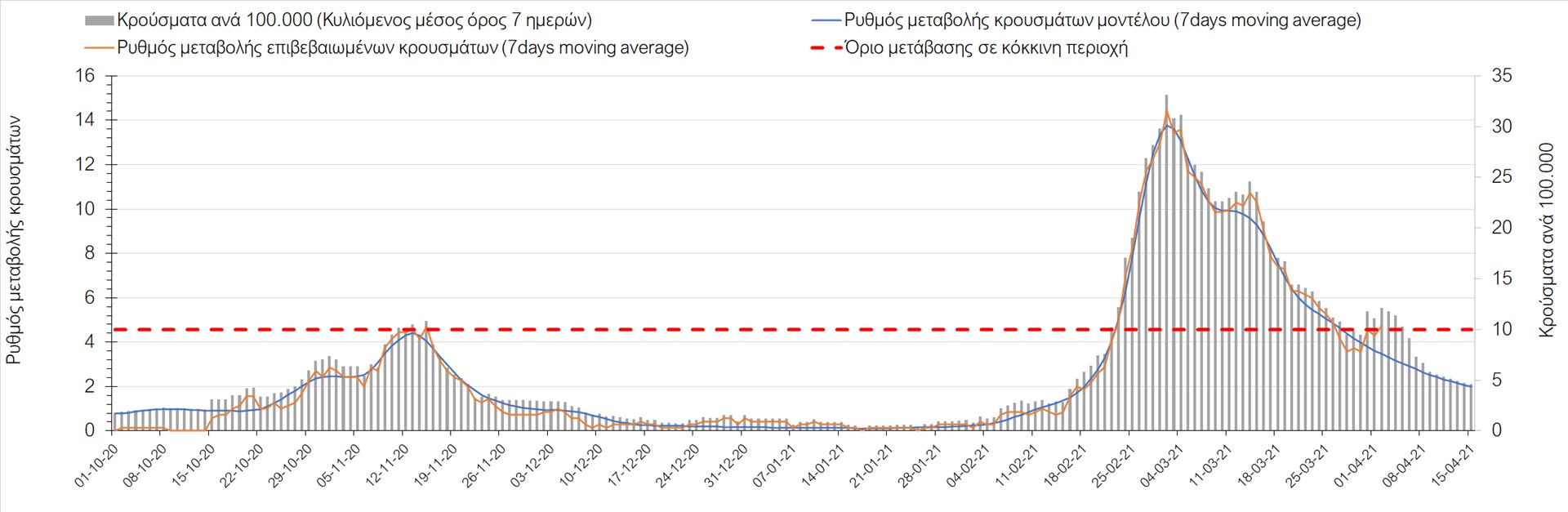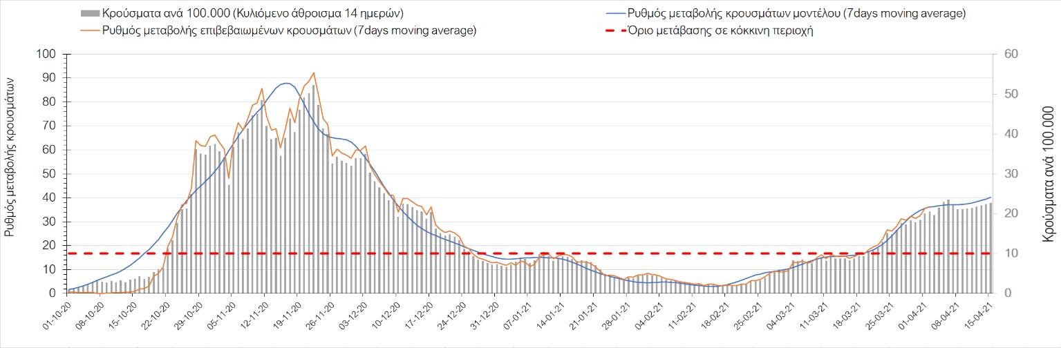 Συμπεράσματα:Η αύξηση που παρατηρείται πλέον στον αριθμό των ασθενών σε κρίσιμη κατάσταση (διασωληνωμένοι σε ΜΕΘ), καθώς και ο αριθμός των θανάτων (αν και με κάποια μικρή απόκλιση την Παρασκευή) συνάδουν με τις προσομοιώσεις του μοντέλου CORE, όπως και ο αριθμός των κρουσμάτων, μετά και τις επικαιροποιημένες προβλέψεις προ 15 ημερών, όπου ελήφθη υπόψιν η μεγαλύτερη διασπορά των μεταλλαγμένων και ταχύτερα μεταδιδόμενων στελεχών. Σε πανελλαδικό επίπεδο ο κυλιόμενος εβδομαδιαίος μέσος όρος του δείκτη θετικότητας διαμορφώθηκε στο 6,9% (η ημερήσια τιμή την Παρασκευή ήταν 5,4%) ενώ ο κυλιόμενος εβδομαδιαίος μέσος όρος του πραγματικού αριθμού αναπαραγωγής Rt (δηλαδή ο αριθμός των ατόμων που ένας φορέας μπορεί να επιμολύνει) διαμορφώθηκε στο 1,17 (τιμές του Rt πάνω από τη μονάδα υποδηλώνουν καθαρή αύξηση της διασποράς του ιού στην κοινότητα). Παρά την εφαρμογή οριζόντιων μέτρων ανάσχεσης της πανδημίας που εφαρμόσθηκαν από τα τέλη Οκτωβρίου, η πορεία της τελευταίας διαφοροποιείται από περιοχή σε περιοχή. Οι παραπάνω παρατηρήσεις τείνουν στο συμπέρασμα ότι η διαχείριση του υγειονομικού κινδύνου θα πρέπει να εξεταστεί σε τοπικό επίπεδο. Πλέον προβληματίζουν πέρα από την Αττική και τη Θεσσαλονίκη, η Αχαΐα, η Αιτωλοακαρνανία, η Εύβοια, η Βοιωτία, η Χαλκιδική, καθώς επίσης η Αρκαδία, η Ηλεία, η Αργολίδα, η Κορινιθία, η Φθιώτιδα, η Ευρυτανία, η Λάρισα, η Κοζάνη, η Καστοριά, η Καβάλα, η Χίος, το Ηράκλειο, τα Χανιά, τα Ιωάννινα, η Ημαθία, η Πέλλα, το Κιλκίς, τα Γρεβενά, η Μαγνησία και η Καρδίτσα. Ανάγκη αυξημένης επιτήρησης έχουν το Κιλκίς και οι Σέρρες, Συνολικά, τα τεστ ανίχνευσης θα πρέπει να φτάσουν τουλάχιστον στα 120.000 και να δίνεται έμφαση στοχευμένα στις περιφερειακές ενότητες στις οποίες η δυναμική της διασποράς φαίνεται να είναι ανησυχητική για 1-2 ημέρες ώστε να ανιχνεύονται οι ασυμπτωματικοί και προσυμπτωματικοί φορείς και να σπάει η αλυσίδα μετάδοσης βάζοντάς τους σε καραντίνα. Λόγω της ανησυχίας που εγείρει η παρουσία στην κοινότητα των μεταλλαγμένων στελέχους του SARS-CoV-2 (κυρίως η βρετανική και η νοτιοαφρικανική μετάλλαξη) και προκειμένου να περιορίσουμε ή τουλάχιστον να καθυστερήσουμε την ευρεία διασπορά τους, προτείνουμε τα ακόλουθα μέτρα πριν συζητηθεί το περαιτέρω άνοιγμα εκπαιδευτικών και οικονομικών δραστηριοτήτων:– πιστή εφαρμογή του ήδη υπάρχοντος νομοθετικού πλαισίου για την τηλεργασία (όσο το δυνατόν περισσότερο, αλλά τουλάχιστον 50%) ή ακόμη και αύξηση του ελάχιστου ορίου τηλεργασίας στο 75% όπου αυτό είναι δυνατόν τόσο από δημόσιους όσο και ιδιωτικούς φορείς – είναι απαραίτητο να υπάρξει άμεσα πολύ μεγαλύτερος έλεγχος της εφαρμογής της σχετικής ΚΥΑ από όλους τους εργοδότες του ιδιωτικού και δημόσιου τομέα. Σημερινά στοιχεία δείχνουν ότι το επίπεδο τηλεργασίας στον ιδιωτικό τομέα ανέρχεται οριακά στο 25%. Υπάρχει άμεση ανάγκη για επιτήρηση της εφαρμογής της σήμερα ισχύουσας νομοθεσίας και για την περαιτέρω ενίσχυσή της. – αύξηση του αριθμού των δοκιμών (συμπεριλαμβανομένων τόσο των δοκιμών RT-PCR όσο και των ταχέων δοκιμών που βασίζονται σε αντιγόνα) σε βιομηχανικές και βιοτεχνικές εγκαταστάσεις και γενικά σε χώρους εργασίας με μεγάλη πιθανότητα συγχρωτισμού λόγω της φύσης της παραγωγικής διαδικασίας.– αύξηση του αριθμού των δοκιμών (συμπεριλαμβανομένων τόσο των δοκιμών RT-PCR όσο και των ταχέων δοκιμών που βασίζονται σε αντιγόν