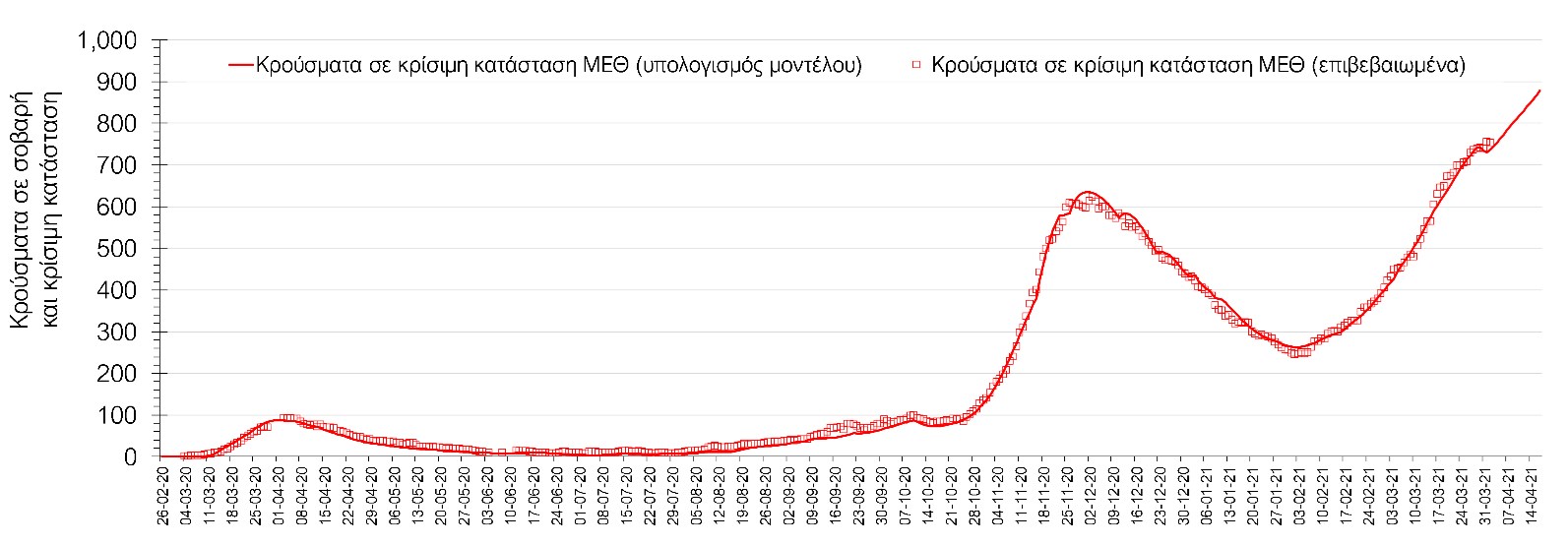 Ακολουθεί η ανάλυση του καθηγητή Δημοσθένη Σαρηγιάννη και του Δρ. Σπύρου Καρακίτσιου για την εξέλιξη της πανδημίας στη χώρα μας:Σύμφωνα με τα στοιχεία του ΕΟΔΥ, ο αριθμός κρουσμάτων την Παρασκευή ανήλθε σε 3080 νέα κρούσματα, με τα αποτελέσματα να συνάδουν με τις προβλέψεις της υπολογιστικής πλατφόρμας CORE (n=3161). Ο αριθμός των τεστ που πραγματοποιήθηκαν την Παρασκευή ήταν 56.903 και σε συνδυασμό με τον αριθμό των κρουσμάτων, ο δείκτης θετικότητας διαμορφώθηκε στο 5,4%. Η πραγματοποίηση αριθμού τεστ σε επίπεδα άνω των 50.000 την ημέρα (όπως και πραγματοποιείται τις τελευταίες ημέρες), συντελεί στο να εξάγουμε πιο ασφαλή συμπεράσματα σχετικά με την πορεία της πανδημίας. Γενικά όμως θα πρέπει να αυξηθεί κι άλλο ο αριθμός των τεστ ανίχνευσης του SARS-CoV-2 χρησιμοποιώντας τα rapid test και τα fast test για να καταπολεμηθεί η δυναμική αύξησης της διασποράς στις περιοχές όπου μια τέτοια αύξηση διαφαίνεται από τα μέχρι τώρα δεδομένα και την υπολογιστική πλατφόρμα CORE. Επειδή και την Παρασκευή ο δείκτης θετικότητας παρέμεινε σε υψηλά επίπεδα, δυστυχώς επιβεβαιώνεται ότι η διασπορά των μεταλλαγμένων στην κοινότητα είναι πολύ μεγαλύτερη από αυτή που είχε αποτυπωθεί με βάση τα τελευταία διαθέσιμα δεδομένα και πραγματοποιήθηκε επαναπαραμετροποίηση του μοντέλου στα νέα δεδομένα και επικαιροποίηση των προβλέψεων, οι οποία έλαβε υπόψη επίσης την παράταση του lockdown έως και τις 29 Μαρτίου. Η παράταση είναι απόρροια της επιβαρυμένης επιδημιολογικής εικόνας, όπως αυτή αποτυπώνεται τόσο στον αριθμό των νέων κρουσμάτων που αποτυπώνονται καθημερινά, όσο και στην επιβάρυνση του συστήματος υγείας και ιδιαίτερα της πληρότητας των κλινών ΜΕΘ.Ο αριθμός θανάτων (72) είναι αυξημένος σε σχέση με την Πέμπτη (67) και όπως είχαμε προβλέψει από την προηγούμενη εβδομάδα, ο κυλιόμενος εβδομαδιαίος μέσος όρος που σήμερα είναι 68, αναμένεται να αυξηθεί περαιτέρω μέχρι και κοντά στα 70 μέχρι τα μέσα Απριλίου (σε επίπεδο μέσης εβδομαδιαίας τιμής), με δεδομένη την αύξηση του αριθμού των κρουσμάτων και την αύξηση του αριθμού των διασωληνωμένων.Όσον αφορά στους ασθενείς σε κρίσιμη κατάσταση (διασωληνωμένοι σε ΜΕΘ), την Παρασκευή ο αριθμός τους μειώθηκε ελαφρά σε σχέση με την Πέμπτη (753 από 755), ενώ αναμένεται να φτάσουν τους περίπου 800 μέχρι τα μέσα Απριλίου με βάση την επικαιροποιημένη πρόβλεψη. Αξίζει να σημειωθεί ότι ο αριθμός των ασθενών σε κρίσιμη κατάσταση όπως και των θανάτων είναι αναλογικά χαμηλότερος σε σχέση με τα αντίστοιχα μεγέθη στο δεύτερο κύμα, τόσο λόγω των εμβολιασμών ευπαθών ομάδων, όσο και του υψηλότερου αριθμού τεστ ανίχνευσης, που συντελεί στον εντοπισμό περισσότερων ασυμπτωματικών ή ήπια συμπτωματικών κρουσμάτων. Επίσης, η διασπορά των μεταλλαγμένων στελεχών που έχουν μεγαλύτερη μεταδοτικότητα από το στέλεχος του SARS-CoV-2 που κυριαρχούσε μέχρι το τέλος Φεβρουαρίου και η αυξημένη κινητικότητα του πληθυσμού έχουν μεγαλώσει το ποσοστό των νεότερων ηλικιών που μολύνονται με αποτέλεσμα η μέση ηλικία των μολύνσεων να έχει πέσει σημαντικά. Η καμπύλη εξέλιξης του αριθμού των ασθενών με βάση τις προσομοιώσεις της πλατφόρμας CORE, όπως αυτή παρουσιάζεται στο Σχήμα 1, ενώ μια εκτίμηση για την πορεία των θανάτων ανά ημέρα παρουσιάζεται στο Σχήμα 2. Σχήμα 1. Αριθμός κρουσμάτων σε κρίσιμη κατάσταση (ΜΕΘ) σύμφωνα με τα στοιχεία του ΕΟΔΥ και τις προβλέψεις της υπολογιστικής πλατφόρμας CORE