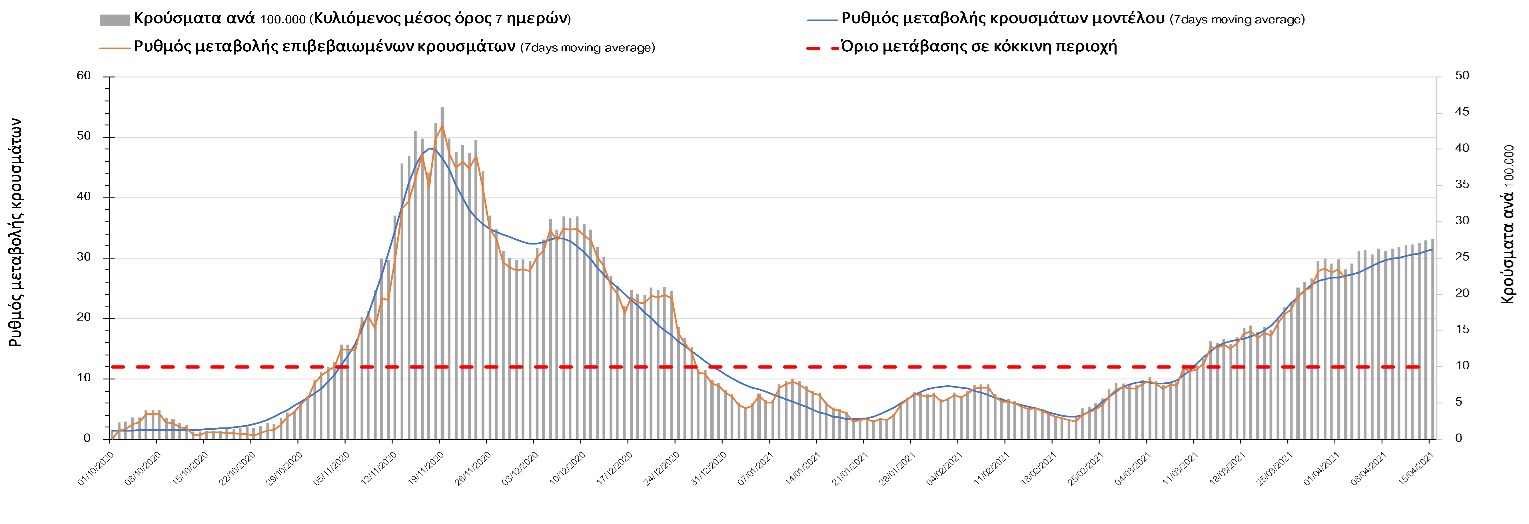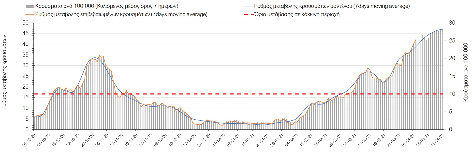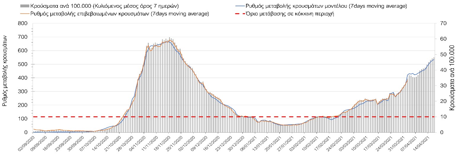 Η πορεία της μέσης εβδομαδιαίας τιμής των κρουσμάτων, καθώς και του κυλιόμενου μέσου όρου 7 ημερών του αριθμού των κρουσμάτων ανά 100.000 πληθυσμού, όπως έχουν καταγραφεί από τον ΕΟΔΥ και η αναμενόμενη πορεία τους όπως προδιαγράφεται από την υπολογιστική πλατφόρμα CORE για την Ελληνική επικράτεια μέχρι το μέσα Απριλίου, αποτυπώνονται στο Σχήμα 3. Φαίνεται μια αρχική σταθεροποίηση σε υψηλό αριθμό κορυσμάτων μέχρι το τέλος του μήνα και έπειτα μια μικρή αύξηση με κορύφωση στις 8 Απριλίου. Μετά από αυτήν την ημερομηνία και ανάλογα με τα μέτρα που θα έχουμε εφαρμόσει θα μπορούμε να δούμε σταδιακή αποκλιμάκωση της πανδημίας πανελλαδικά. Όπως φαίνεται από το διάγραμμα, από τις 8 Ιανουαρίου έχουμε μια αύξηση κρουσμάτων μέχρι τις 11 Ιανουαρίου η οποία οφείλεται στη μείωση της περιστολής που σημειώθηκε στις γιορτές. Από τις 11 μέχρι τις 18 Ιανουαρίου προβλεπόταν μια μείωση κρουσμάτων λόγω της εφαρμογής του lockdown και η οποία όντως παρατηρήθηκε. Εντούτοις, όπως είχαμε προβλέψει, από τις 23 Ιανουαρίου και έπειτα διαφαίνεται αύξηση στον κυλιόμενο μέσο όρο των κρουσμάτων, η οποία έγινε ιδιαίτερα έντονη μετά τις 17/2, η οποία και συνεχίζεται μέχρι τώρα. Λόγω της ισχυρής παρουσία των μεταλλαγμένων στελεχών, πιστεύουμε ότι για να επιτευχθεί κάμψη της επιδημικής καμπύλης, θα πρέπει να γίνει αυστηρή εφαρμογή των μέτρων, έτσι ώστε σε συνδυασμό με την επικρατούσα μετεωρολογία να επέλθει επιβράδυνση της ανόδου ή και σταθεροποίηση των κρουσμάτων προς το τέλος του μήνα. Πάντως για να μπορέσουμε να προχωρήσουμε σε σταδιακή άρση των περιοριστικών μέτρων για οικονομικές, εκπαιδευτικές και πολιτιστικές/αθλητικές δραστηριότητες, θα πρέπει να δημιουργήσουμε την κατάλληλη υποδομή ώστε να μπορέσουμε να αναχαιτίσουμε την υπερμετάδοση των μεταλλαγμένων στελεχών εκεί όπου συμβαίνει κατά το μάλλον, δηλαδή στους τόπους εργασίας και τα μέσα μαζικής μεταφοράς. Στα συμπεράσματα προτείνονται σχετικές λύσεις. Σχήμα 3. Πορεία του ημερησίου αριθμού των κρουσμάτων (κυλιόμενος μέσος όρος 7 ημερών) στην Ελληνική επικράτεια