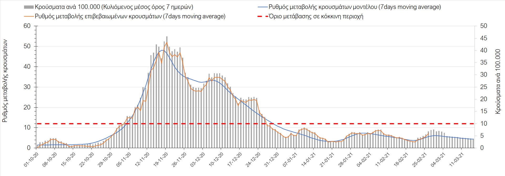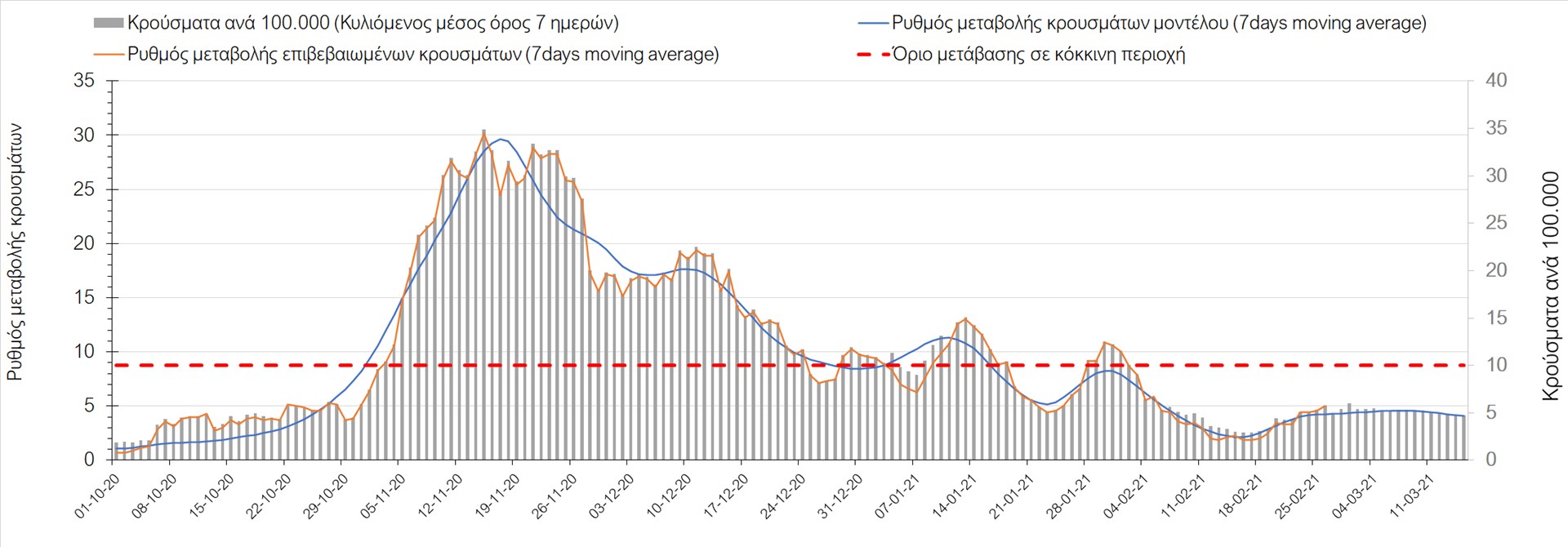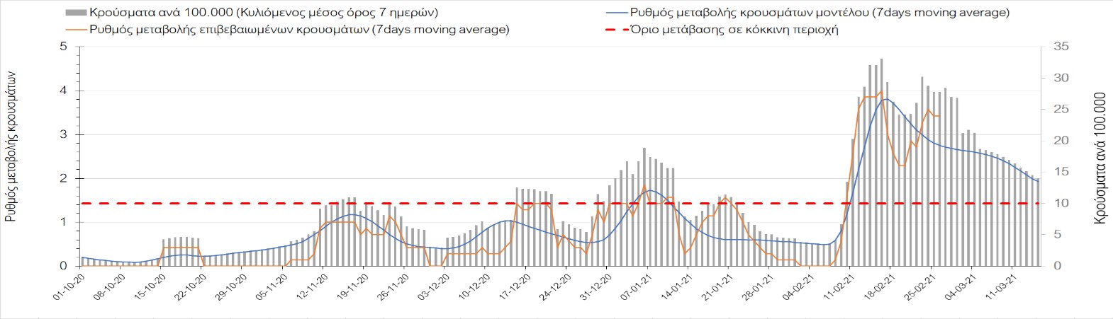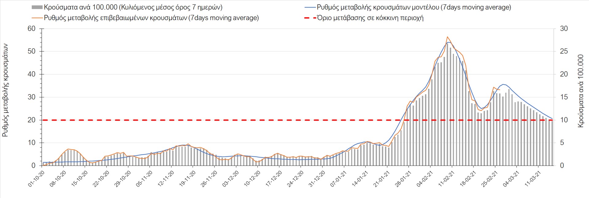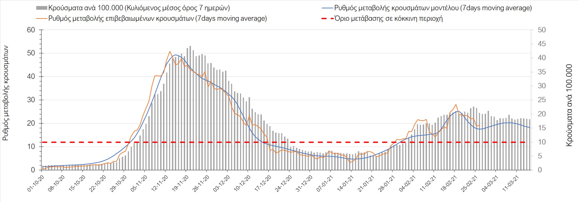 Όπως φαίνεται από το διάγραμμα, από τις 8 Ιανουαρίου έχουμε μια αύξηση κρουσμάτων μέχρι τις 11 Ιανουαρίου η οποία οφείλεται στη μείωση της περιστολής που σημειώθηκε στις γιορτές. Από τις 11 μέχρι τις 18 Ιανουαρίου προβλεπόταν μια μείωση κρουσμάτων λόγω της εφαρμογής του lockdown και η οποία όντως παρατηρήθηκε. Εντούτοις, όπως είχαμε προβλέψει, από τις 23 Ιανουαρίου και έπειτα διαφαίνεται αύξηση στον κυλιόμενο μέσο όρο των κρουσμάτων. Η εφαρμογή των περιοριστικών μέτρων, σε συνδυασμό με την επικρατούσα μετεωρολογία πρόκειται να επιφέρει μια σταθεροποίηση ή και ελαφρά μείωση των κρουσμάτων τις επόμενες ημέρες. Παρ’ολ’αυτά, μετά από τις 17/2 σημειώνεται μια αύξηση των κρουσμάτων, η οποία αναμένουμε να καμφθεί τις επόμενες 1-2 ημέρες, ως αποτέλεσμα των μέτρων που ελήφθησαν από την προηγουμένη εβδομάδα σε διάφορες περιοχές της χώρας.