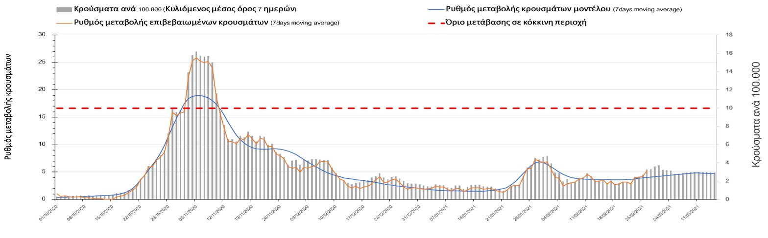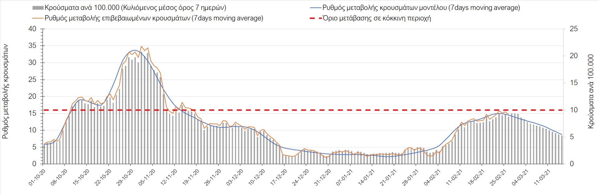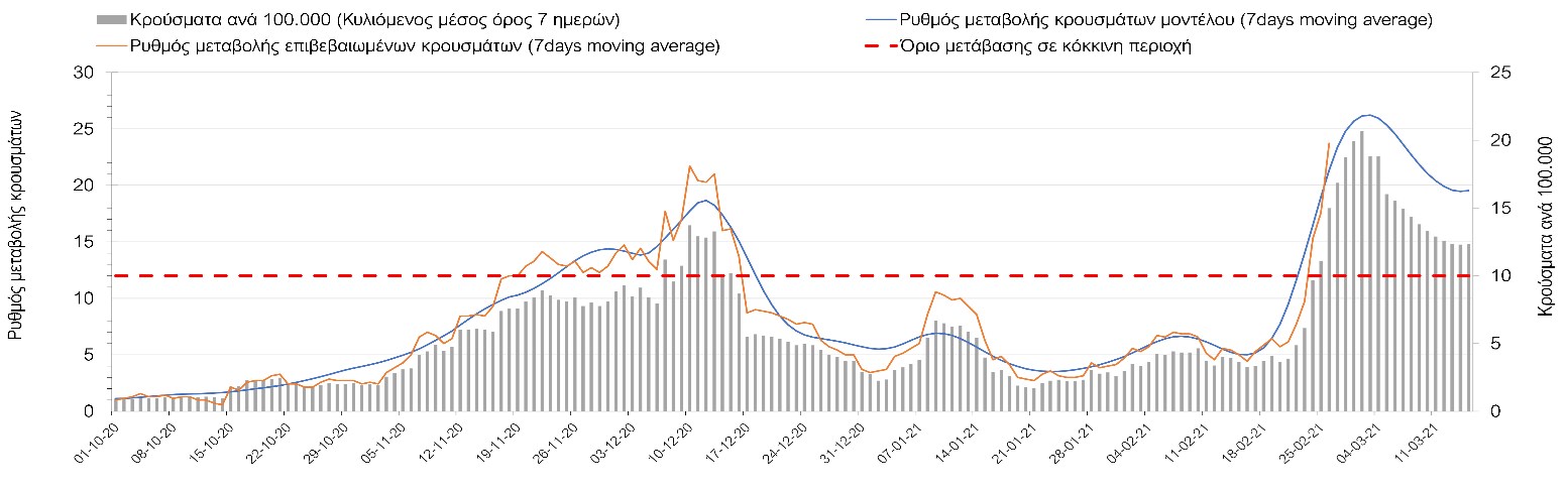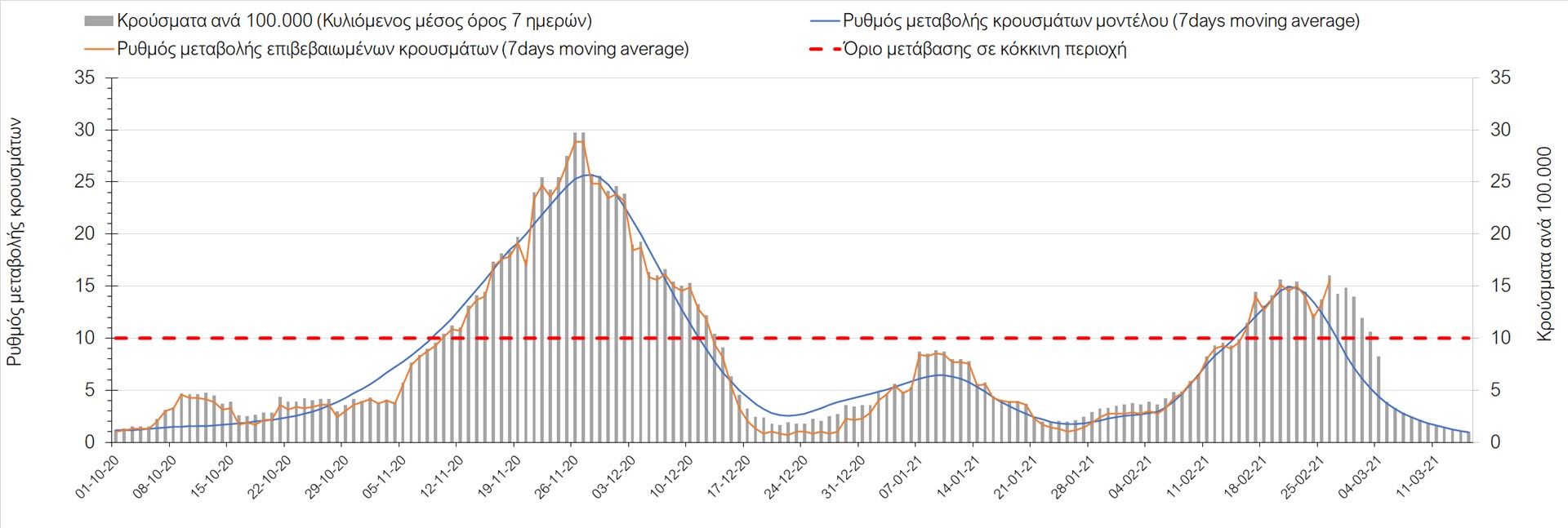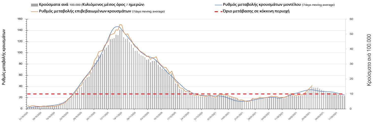 Όπως φαίνεται από το διάγραμμα, από τις 8 Ιανουαρίου έχουμε μια αύξηση κρουσμάτων μέχρι τις 11 Ιανουαρίου η οποία οφείλεται στη μείωση της περιστολής που σημειώθηκε στις γιορτές. Από τις 11 μέχρι τις 18 Ιανουαρίου προβλεπόταν μια μείωση κρουσμάτων λόγω της εφαρμογής του lockdown και η οποία όντως παρατηρήθηκε. Εντούτοις, όπως είχαμε προβλέψει, από τις 23 Ιανουαρίου και έπειτα διαφαίνεται αύξηση στον κυλιόμενο μέσο όρο των κρουσμάτων. Η εφαρμογή των περιοριστικών μέτρων, σε συνδυασμό με την επικρατούσα μετεωρολογία πρόκειται να επιφέρει μια σταθεροποίηση ή και ελαφρά μείωση των κρουσμάτων τις επόμενες ημέρες. Παρ’ολ’αυτά, μετά από τις 17/2 σημειώνεται μια αύξηση των κρουσμάτων, η οποία αναμένουμε να καμφθεί τις επόμενες 1-2 ημέρες, ως αποτέλεσμα των μέτρων που ελήφθησαν από την προηγουμένη εβδομάδα σε διάφορες περιοχές της χώρας.
