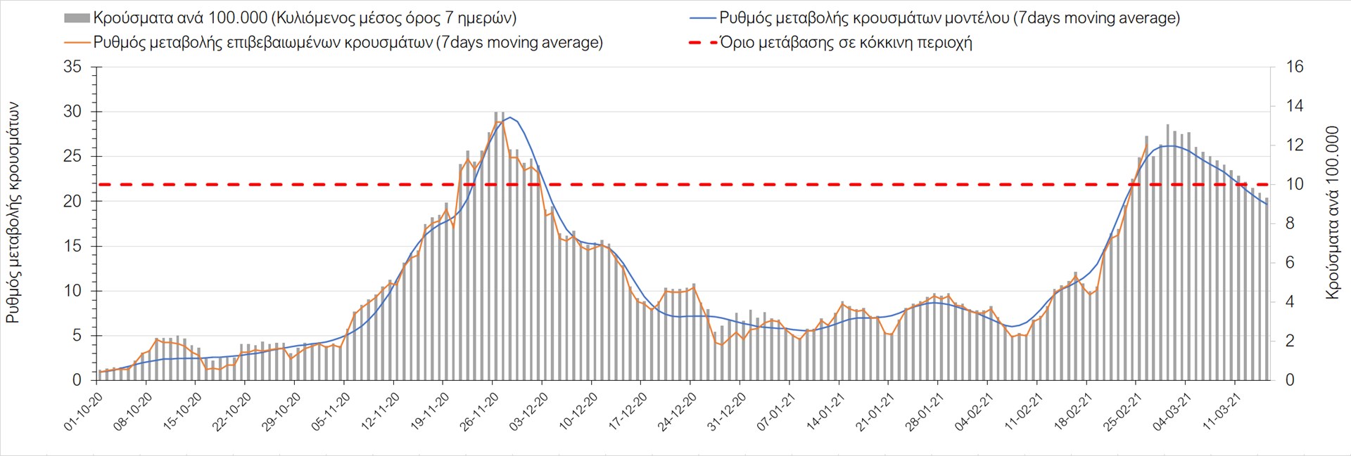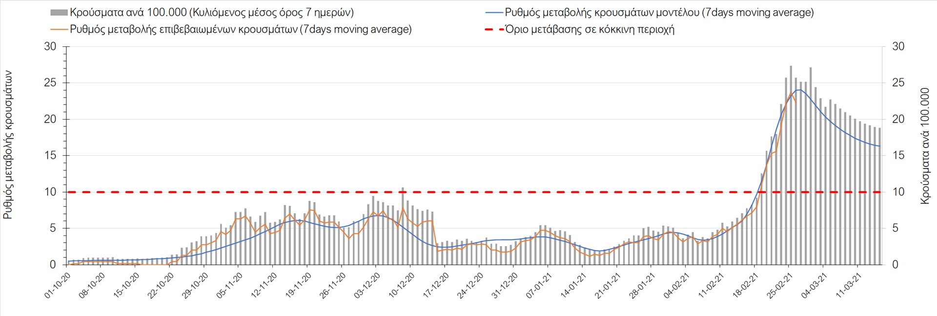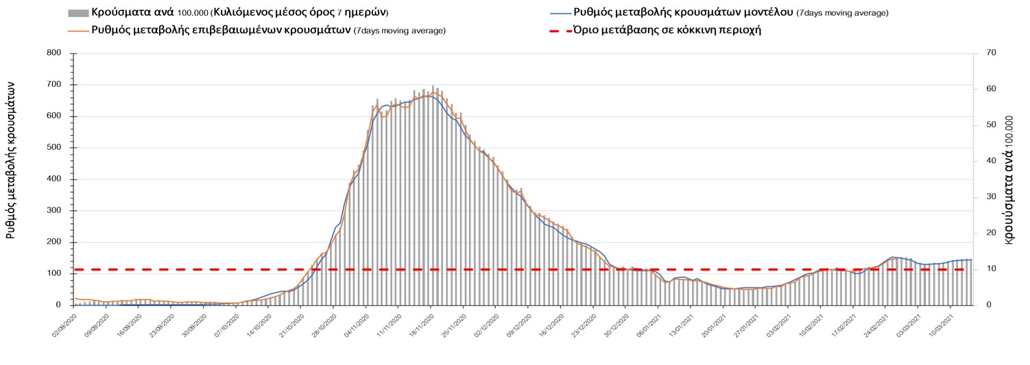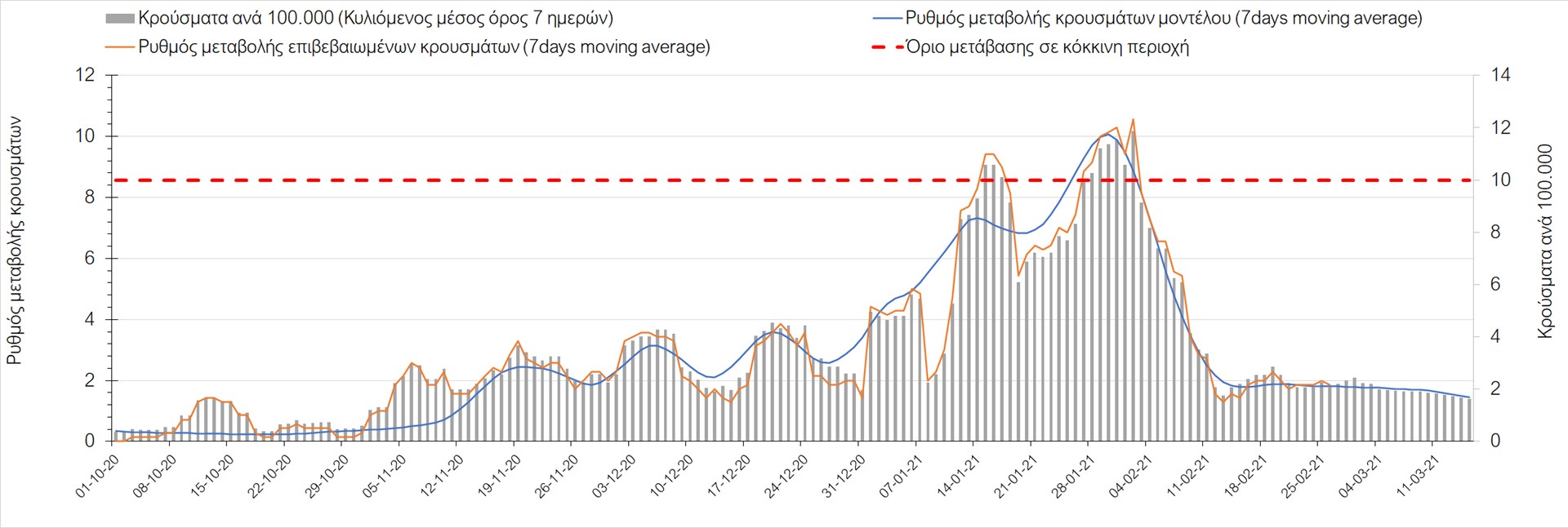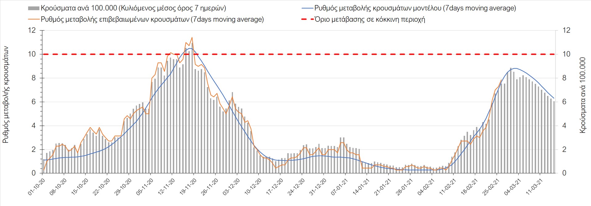 Όπως φαίνεται από το διάγραμμα, από τις 8 Ιανουαρίου έχουμε μια αύξηση κρουσμάτων μέχρι τις 11 Ιανουαρίου η οποία οφείλεται στη μείωση της περιστολής που σημειώθηκε στις γιορτές. Από τις 11 μέχρι τις 18 Ιανουαρίου προβλεπόταν μια μείωση κρουσμάτων λόγω της εφαρμογής του lockdown και η οποία όντως παρατηρήθηκε. Εντούτοις, όπως είχαμε προβλέψει, από τις 23 Ιανουαρίου και έπειτα διαφαίνεται αύξηση στον κυλιόμενο μέσο όρο των κρουσμάτων. Η εφαρμογή των περιοριστικών μέτρων, σε συνδυασμό με την επικρατούσα μετεωρολογία πρόκειται να επιφέρει μια σταθεροποίηση ή και ελαφρά μείωση των κρουσμάτων τις επόμενες ημέρες. Παρ’ολ’αυτά, μετά από τις 17/2 σημειώνεται μια αύξηση των κρουσμάτων, η οποία αναμένουμε να καμφθεί τις επόμενες 1-2 ημέρες, ως αποτέλεσμα των μέτρων που ελήφθησαν από την προηγουμένη εβδομάδα σε διάφορες περιοχές της χώρας.