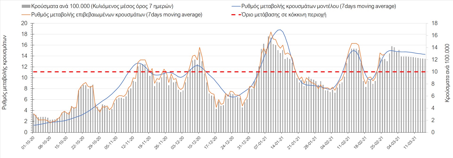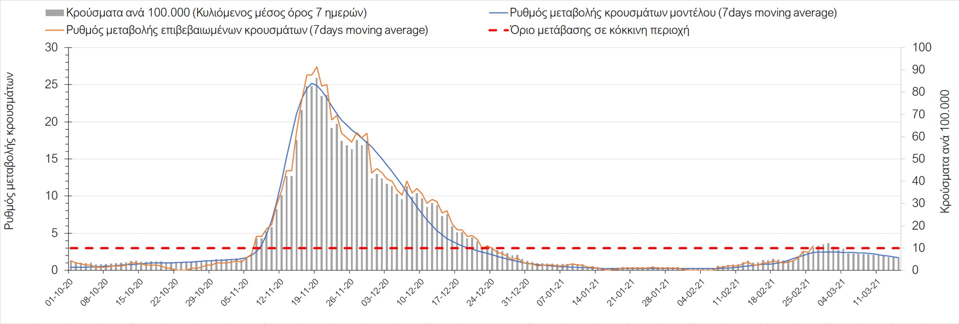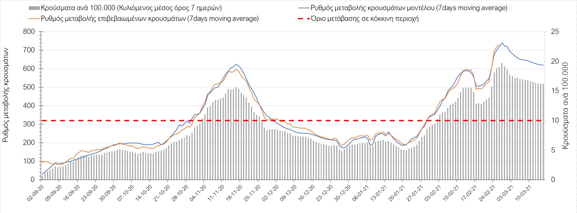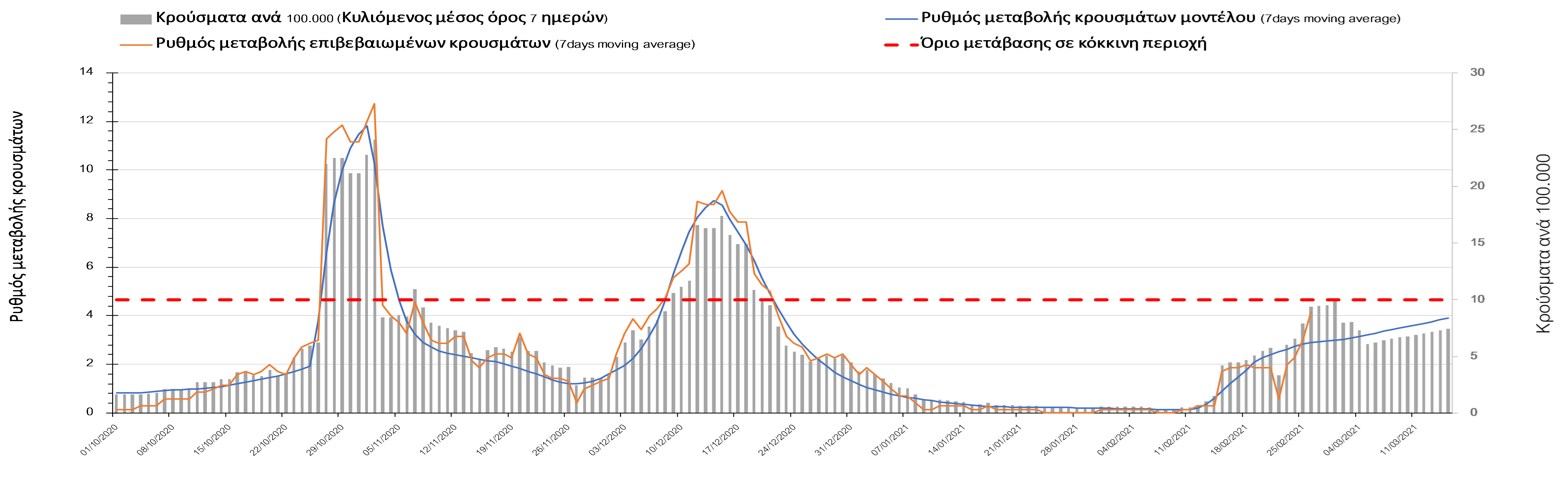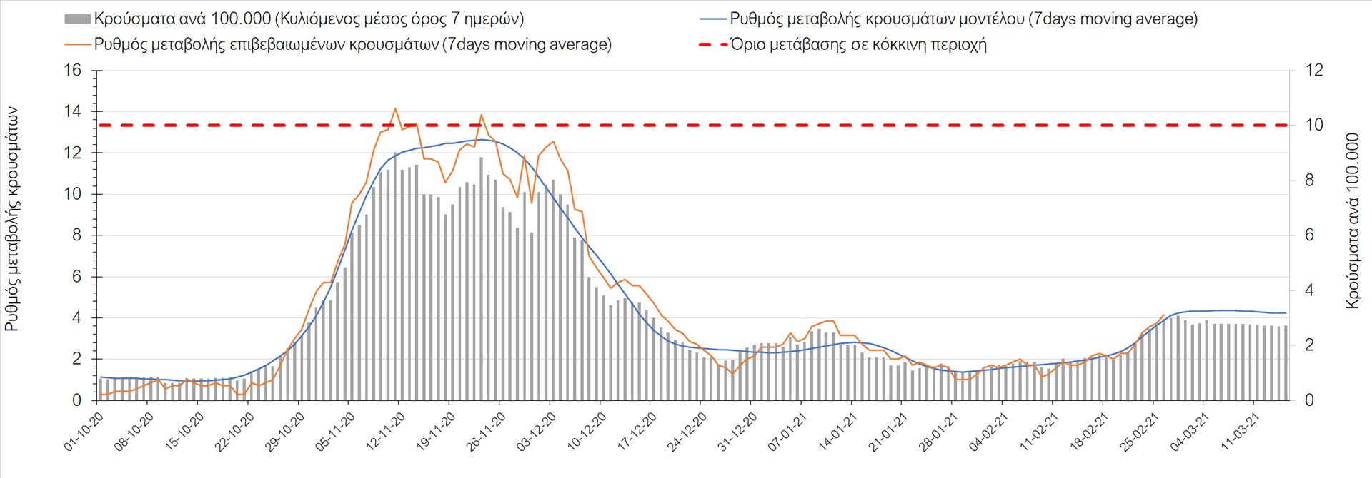 Όπως φαίνεται από το διάγραμμα, από τις 8 Ιανουαρίου έχουμε μια αύξηση κρουσμάτων μέχρι τις 11 Ιανουαρίου η οποία οφείλεται στη μείωση της περιστολής που σημειώθηκε στις γιορτές. Από τις 11 μέχρι τις 18 Ιανουαρίου προβλεπόταν μια μείωση κρουσμάτων λόγω της εφαρμογής του lockdown και η οποία όντως παρατηρήθηκε. Εντούτοις, όπως είχαμε προβλέψει, από τις 23 Ιανουαρίου και έπειτα διαφαίνεται αύξηση στον κυλιόμενο μέσο όρο των κρουσμάτων. Η εφαρμογή των περιοριστικών μέτρων, σε συνδυασμό με την επικρατούσα μετεωρολογία πρόκειται να επιφέρει μια σταθεροποίηση ή και ελαφρά μείωση των κρουσμάτων τις επόμενες ημέρες. Παρ’ολ’αυτά, μετά από τις 17/2 σημειώνεται μια αύξηση των κρουσμάτων, η οποία αναμένουμε να καμφθεί τις επόμενες 1-2 ημέρες, ως αποτέλεσμα των μέτρων που ελήφθησαν από την προηγουμένη εβδομάδα σε διάφορες περιοχές της χώρας.