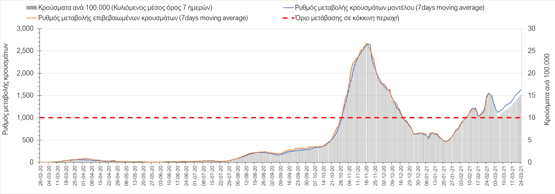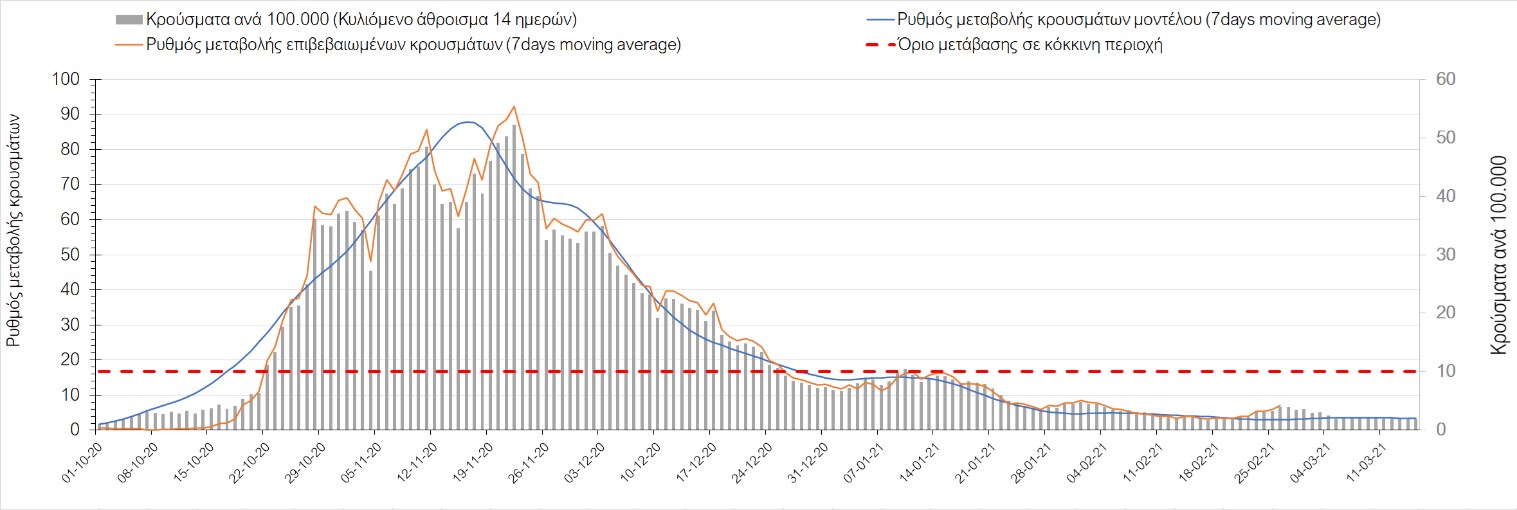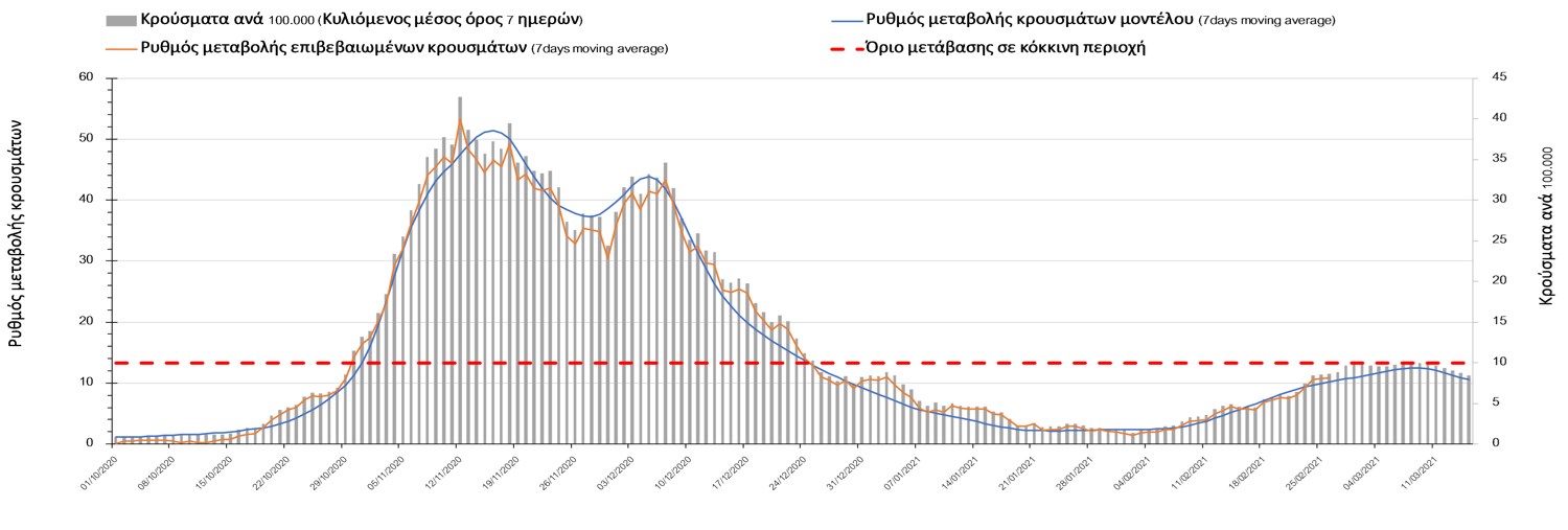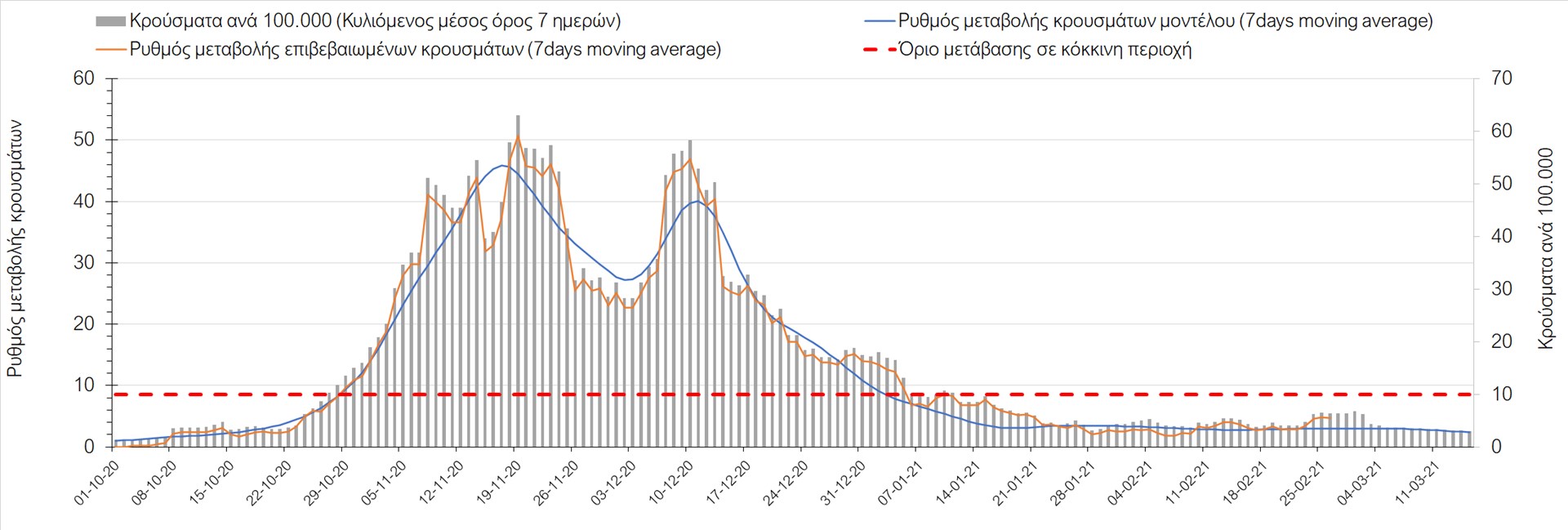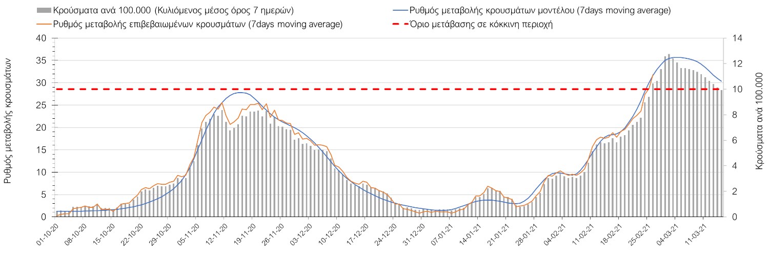 Όπως φαίνεται από το διάγραμμα, από τις 8 Ιανουαρίου έχουμε μια αύξηση κρουσμάτων μέχρι τις 11 Ιανουαρίου η οποία οφείλεται στη μείωση της περιστολής που σημειώθηκε στις γιορτές. Από τις 11 μέχρι τις 18 Ιανουαρίου προβλεπόταν μια μείωση κρουσμάτων λόγω της εφαρμογής του lockdown και η οποία όντως παρατηρήθηκε. Εντούτοις, όπως είχαμε προβλέψει, από τις 23 Ιανουαρίου και έπειτα διαφαίνεται αύξηση στον κυλιόμενο μέσο όρο των κρουσμάτων. Η εφαρμογή των περιοριστικών μέτρων, σε συνδυασμό με την επικρατούσα μετεωρολογία πρόκειται να επιφέρει μια σταθεροποίηση ή και ελαφρά μείωση των κρουσμάτων τις επόμενες ημέρες. Παρ’ολ’αυτά, μετά από τις 17/2 σημειώνεται μια αύξηση των κρουσμάτων, η οποία αναμένουμε να καμφθεί τις επόμενες 1-2 ημέρες, ως αποτέλεσμα των μέτρων που ελήφθησαν από την προηγουμένη εβδομάδα σε διάφορες περιοχές της χώρας.