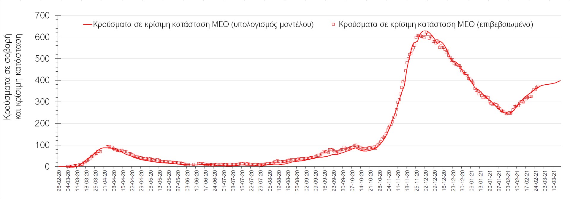 Σχήμα 1. Αριθμός κρουσμάτων σε κρίσιμη κατάσταση (ΜΕΘ) σύμφωνα με τα στοιχεία του ΕΟΔΥ και τις προβλέψεις της υπολογιστικής πλατφόρμας CORE.