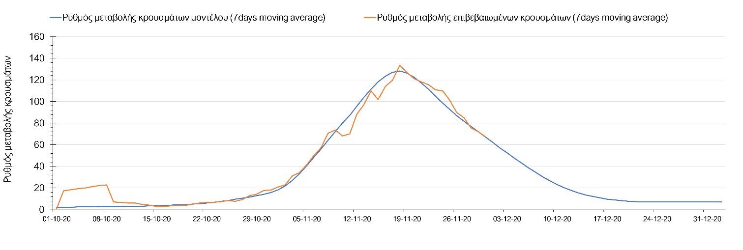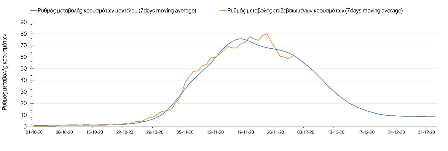 Σχήμα 2. Αριθμός θανάτων (κυλιόμενος μέσος όρος 7 ημερών) σύμφωνα με τα στοιχεία του ΕΟΔΥ και τις προβλέψεις της υπολογιστικής πλατφόρμας CORE.Η πορεία της μέσης εβδομαδιαίας τιμής των κρουσμάτων όπως έχουν καταγραφεί από τον ΕΟΔΥ και η αναμενόμενη πορεία αυτών στην περίπτωση ανοίγματος των εμπορικών καταστημάτων στις 14 Δεκεμβρίου όπως προδιαγράφεται από την υπολογιστική πλατφόρμα CORE για την Ελληνική επικράτεια, αποτυπώνονται στο Σχήμα 3.