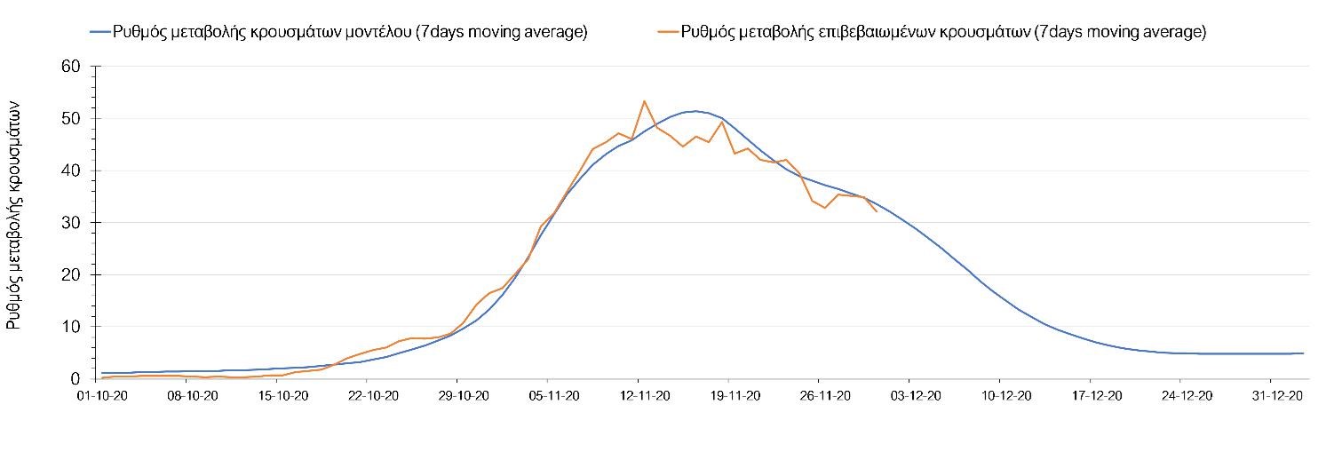 Σύμφωνα με τα σημερινά στοιχεία του ΕΟΔΥ, παρουσιάστηκε μείωση στον αριθμό των επιβεβαιωμένων κρουσμάτων, με τα αποτελέσματα να είναι πιο κοντά στις προβλέψεις που υπάγονταν από την πτωτική πορεία της προηγούμενης εβδομάδας. Ο αριθμός των τεστ που πραγματοποιήθηκαν σήμερα (27263) ήταν λίγο χαμηλότερος από τον χθεσινό, αλλά ακόμα και με τον μικρότερο αριθμό των τεστ, ο επίσης κατά τι χαμηλότερος δείκτης θετικότητας (6.1% σε σχέση με 6.3% χθες), συντελεί στο να διατηρήσουμε τη συγκρατημένα αισιόδοξη εικόνα για την εξέλιξη της πανδημίας στην Ελλάδα.Σήμερα ο αριθμός των θανάτων (98) παρέμεινε σε υψηλά επίπεδα, υποδηλώνοντας ότι μέχρι και πριν 2 εβδομάδες, ο ρυθμός μετάδοσης της νόσου ήταν υψηλός, λόγω της πλημμελούς εφαρμογής του lockdown τις πρώτες 15 ημέρες της εφαρμογής του και από τη συνέχιση της λειτουργίας των Δημοτικών σχολείων και την γενικότερα αυξημένη κοινωνική κινητικότητα των γονέων που συνάδει με τη συνοδεία των νεαρών παιδιών από και προς το σχολείο σε συνδυασμό με την χαμηλή εφαρμογή της τηλεργασίας, η οποία αυξάνει περαιτέρω την πιθανότητα μετάδοσης του SARS-CoV-2 από τους εργαζόμενους ενήλικες. Ο υψηλός αριθμός των θανάτων σε συνδυασμό με την παρατηρούμενη μείωση των επιβεβαιωμένων κρουσμάτων σε σχέση με την προηγούμενη εβδομάδα μπορεί να ερμηνευθεί από το γεγονός ότι έγινε πιο συνεπής εφαρμογή του lockdown μετά τις 17-18 Νοεμβρίου, περίπου 10 μέρες μετά την ανακοίνωση του. O ρυθμός αύξησης των θανάτων έχει αρχίσει να κάμπτεται (Σχήμα 2), γεγονός που συνάδει και με τις προβλέψεις του μοντέλου. H ασταθής πορεία της επιδημικής καμπύλης και η πιθανή ανάσχεση της πτωτικής της πορείας στο σύνολο της χώρας πιθανότατα οφείλεται στην κακή πορεία σε επιμέρους περιοχές, όπως η Ημαθία (79 κρούσματα σήμερα), η Πέλλα (57 κρούσματα σήμερα), η Ξάνθη (49 κρούσματα σήμερα), και η Μαγνησία (51 κρούσματα σήμερα). Ένα ακόμα ευχάριστο νέο σήμερα είναι η μικρή μείωση του αριθμού των ασθενών που βρίσκονται σε κρίσιμη κατάσταση (διασωληνομένοι σε ΜΕΘ) από 622 σε 612. Η καμπύλη εξέλιξης του αριθμού των ασθενών που χρειάζονται διασωλήνωση φαίνεται να ακολουθεί την πορεία που διαφαίνονταν και από την υπολογιστική πλατφόρμα CORE. Η πορεία του αριθμού των ασθενών σε κρίσιμη κατάσταση (διασωληνομένοι σε ΜΕΘ) για τις επόμενες ημέρες πανελλαδικά παρουσιάζεται στο Σχήμα 1, ενώ μια εκτίμηση για την πορεία των θανάτων παρουσιάζεται στο Σχήμα 2.