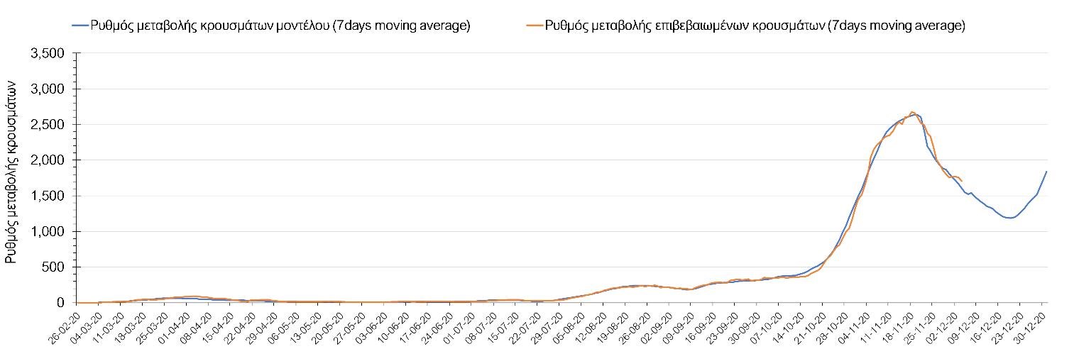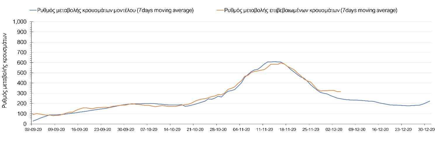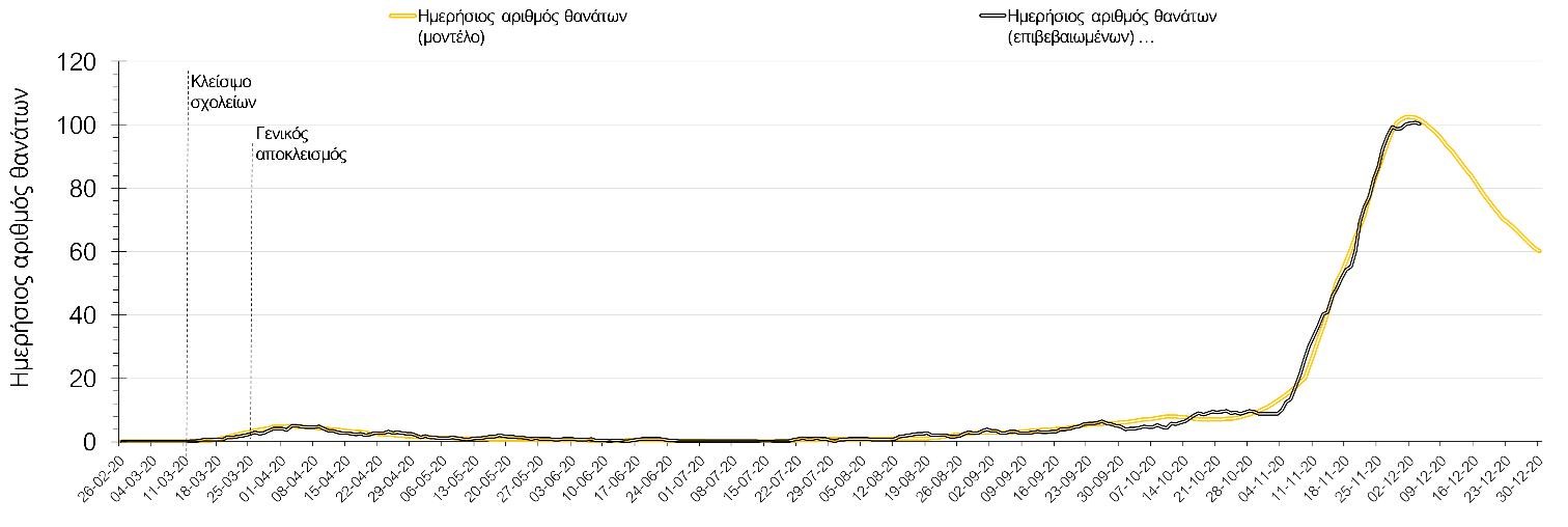 Σχήμα 2. Αριθμός θανάτων (κυλιόμενος μέσος όρος 7 ημερών) σύμφωνα με τα στοιχεία του ΕΟΔΥ και τις προβλέψεις της υπολογιστικής πλατφόρμας CORE.Η πορεία της μέσης εβδομαδιαίας τιμής των κρουσμάτων όπως έχουν καταγραφεί από τον ΕΟΔΥ και η αναμενόμενη πορεία αυτών στην περίπτωση ανοίγματος των εμπορικών καταστημάτων στις 14 Δεκεμβρίου όπως προδιαγράφεται από την υπολογιστική πλατφόρμα CORE για την Ελληνική επικράτεια, αποτυπώνονται στο Σχήμα 3.