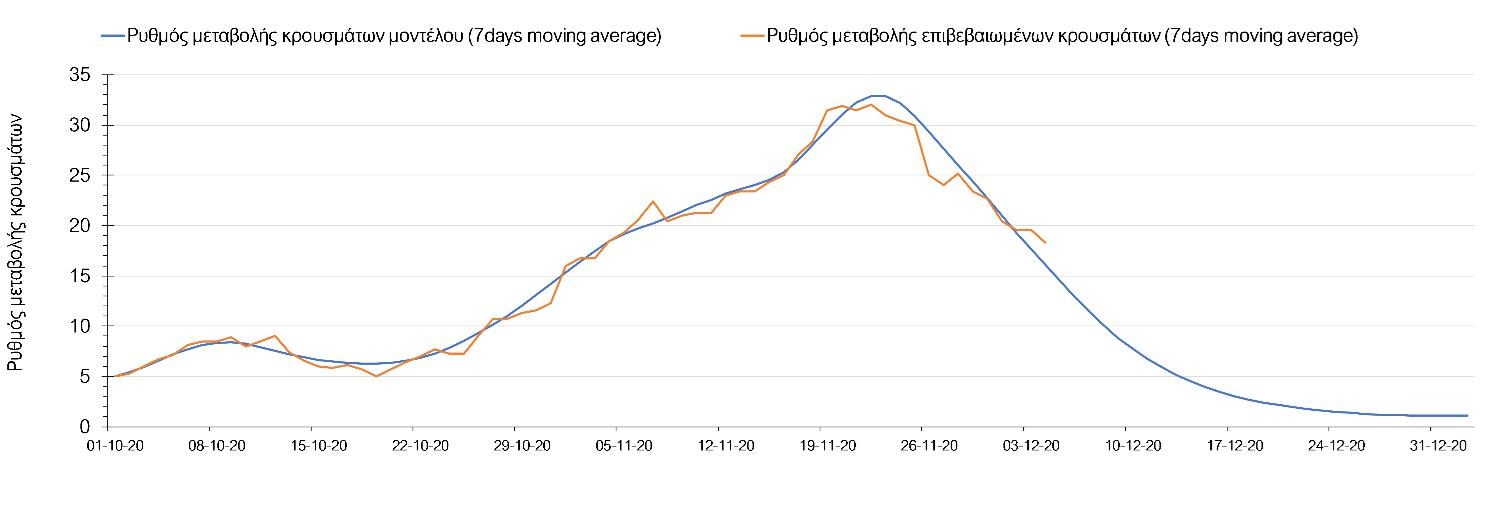 Σύμφωνα με τα σημερινά στοιχεία του ΕΟΔΥ, παρουσιάστηκε μείωση στον αριθμό των επιβεβαιωμένων κρουσμάτων, με τα αποτελέσματα να είναι πιο κοντά στις προβλέψεις που υπάγονταν από την πτωτική πορεία της προηγούμενης εβδομάδας. Ο αριθμός των τεστ που πραγματοποιήθηκαν σήμερα (27263) ήταν λίγο χαμηλότερος από τον χθεσινό, αλλά ακόμα και με τον μικρότερο αριθμό των τεστ, ο επίσης κατά τι χαμηλότερος δείκτης θετικότητας (6.1% σε σχέση με 6.3% χθες), συντελεί στο να διατηρήσουμε τη συγκρατημένα αισιόδοξη εικόνα για την εξέλιξη της πανδημίας στην Ελλάδα.Σήμερα ο αριθμός των θανάτων (98) παρέμεινε σε υψηλά επίπεδα, υποδηλώνοντας ότι μέχρι και πριν 2 εβδομάδες, ο ρυθμός μετάδοσης της νόσου ήταν υψηλός, λόγω της πλημμελούς εφαρμογής του lockdown τις πρώτες 15 ημέρες της εφαρμογής του και από τη συνέχιση της λειτουργίας των Δημοτικών σχολείων και την γενικότερα αυξημένη κοινωνική κινητικότητα των γονέων που συνάδει με τη συνοδεία των νεαρών παιδιών από και προς το σχολείο σε συνδυασμό με την χαμηλή εφαρμογή της τηλεργασίας, η οποία αυξάνει περαιτέρω την πιθανότητα μετάδοσης του SARS-CoV-2 από τους εργαζόμενους ενήλικες. Ο υψηλός αριθμός των θανάτων σε συνδυασμό με την παρατηρούμενη μείωση των επιβεβαιωμένων κρουσμάτων σε σχέση με την προηγούμενη εβδομάδα μπορεί να ερμηνευθεί από το γεγονός ότι έγινε πιο συνεπής εφαρμογή του lockdown μετά τις 17-18 Νοεμβρίου, περίπου 10 μέρες μετά την ανακοίνωση του. O ρυθμός αύξησης των θανάτων έχει αρχίσει να κάμπτεται (Σχήμα 2), γεγονός που συνάδει και με τις προβλέψεις του μοντέλου. H ασταθής πορεία της επιδημικής καμπύλης και η πιθανή ανάσχεση της πτωτικής της πορείας στο σύνολο της χώρας πιθανότατα οφείλεται στην κακή πορεία σε επιμέρους περιοχές, όπως η Ημαθία (79 κρούσματα σήμερα), η Πέλλα (57 κρούσματα σήμερα), η Ξάνθη (49 κρούσματα σήμερα), και η Μαγνησία (51 κρούσματα σήμερα). Ένα ακόμα ευχάριστο νέο σήμερα είναι η μικρή μείωση του αριθμού των ασθενών που βρίσκονται σε κρίσιμη κατάσταση (διασωληνομένοι σε ΜΕΘ) από 622 σε 612. Η καμπύλη εξέλιξης του αριθμού των ασθενών που χρειάζονται διασωλήνωση φαίνεται να ακολουθεί την πορεία που διαφαίνονταν και από την υπολογιστική πλατφόρμα CORE. Η πορεία του αριθμού των ασθενών σε κρίσιμη κατάσταση (διασωληνομένοι σε ΜΕΘ) για τις επόμενες ημέρες πανελλαδικά παρουσιάζεται στο Σχήμα 1, ενώ μια εκτίμηση για την πορεία των θανάτων παρουσιάζεται στο Σχήμα 2.