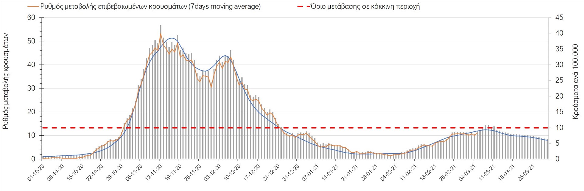 Σχήμα 41. Πορεία του ημερησίου αριθμού των κρουσμάτων (κυλιόμενος μέσος όρος 7 ημερών) στην ΘάσοΣυμπεράσματα:Η αύξηση που παρατηρείται πλέον στον αριθμό των ασθενών σε κρίσιμη κατάσταση (διασωληνωμένοι σε ΜΕΘ), καθώς και ο αριθμός των θανάτων συνάδουν με τις προσομοιώσεις του μοντέλου CORE για τον επόμενο μήνα, ενώ και ο αριθμός των νέων κρουσμάτων παραμένει ανησυχητικός, ιδιαίτερα για την Αττική. Τα παραπάνω αποτελέσματα αποτυπώνονται και στο δείκτη θετικότητας. Σε πανελλαδικό επίπεδο ο κυλιόμενος εβδομαδιαίος μέσος όρος του δείκτη θετικότητας παρέμεινε σταθερός στο 4,5% (η ημερήσια τιμή την Παρασκευή είναι 4,0%) ενώ ο κυλιόμενος εβδομαδιαίος μέσος όρος του πραγματικού αριθμού αναπαραγωγής Rt (δηλαδή ο αριθμός των ατόμων που ένας φορέας μπορεί να επιμολύνει) είναι πλέον 1,26 (τιμές του Rt πάνω από τη μονάδα υποδηλώνουν καθαρή αύξηση της διασποράς του ιού στην κοινότητα). Παρατηρείται δηλαδή εδώ και λίγες ημέρες μια σταθεροποίηση της αύξησης της διασποράς του SARS-CoV-2 στη χώρα. Με βάση τα δεδομένα αυτής της εβδομάδας, καλώς εφαρμόσθηκαν τα περιοριστικά μέτρα που ισχύουν από τις 4 Μαρτίου, τα οποία ίσως χρειαστούν επιπλέον αναθεώρηση, με βάση την επιδημιολογική εικόνα που θα επικρατήσει, ενώ επίσης καλώς εφαρμόσθηκε το lockdown στην Αθήνα μέχρι τις 15 Μαρτίου.Με τα μέχρι τώρα δεδομένα, τα μέτρα αυτά φαίνονται να είναι προς τη σωστή κατεύθυνση, και αναμένουμε να δούμε εάν θα αποδειχθούν ικανά και στην πράξη να αναχαιτίσουν την επέλαση ενός τρίτου κύματος, εν αναμονή και επιπλέον στοιχείων, τόσο για τη μεταδοτικότητα του στελέχους B.1.1.7. του SARS-CoV-2, όσο και της διασποράς του στην κοινότητα, οπότε συνολικά προτείνουμε την εφαρμογή καθολικού lockdown σε όλη τη χώρα, ώστε να αναχαιτιστεί η διαφαινόμενη ανοδική πορεία που διαμορφώνεται. Η πρόταση αυτή υποστηρίζεται και από το υψηλό ποσοστό πληρότητας των ΜΕΘ, των οποίων οι ανάγκες αναμένεται να συνεχίσουν να αυξάνουν.Παρά την εφαρμογή οριζόντιων μέτρων ανάσχεσης της πανδημίας που εφαρμόσθηκαν από τα τέλη Οκτωβρίου, η πορεία της τελευταίας διαφοροποιείται από περιοχή σε περιοχή. Οι παραπάνω παρατηρήσεις τείνουν στο συμπέρασμα ότι η διαχείριση του υγειονομικού κινδύνου θα πρέπει να εξεταστεί σε τοπικό επίπεδο. Πλέον προβληματίζουν πέρα από την Αττική, η Αχαΐα, η Αιτωλοακαρνανία, η Εύβοια, η Βοιωτία, η Θάσος, η Χαλκιδική, καθώς επίσης η Αρκαδία, η Αργολίδα, η Φθιώτιδα, η Λάρισα, τα Γρεβενά, η Χίος, το Ρέθυμνο, το Ηράκλειο και τα Ιωάννινα. Προσοχή πρέπει να δοθεί στην επιδημιολογική παρατήρηση στην Ημαθία. Προσοχή χρειάζεται και η Θεσσαλονίκη, ώστε να μην ξεφύγει η διασπορά της νοτιοαφρικανική μετάλλαξης στην κοινότητα. Συνολικά, τα τεστ ανίχνευσης θα πρέπει να φτάσουν τουλάχιστον στα 80.000 και να δίνεται έμφαση στοχευμένα στις περιφερειακές ενότητες στις οποίες η δυναμική της διασποράς φαίνεται να είναι ανησυχητική για 1-2 ημέρες ώστε να ανιχνεύονται οι ασυμπτωματικοί και προσυμπτωματικοί φορείς και να σπάει η αλυσίδα μετάδοσης βάζοντάς τους σε καραντίνα. Λόγω της ανησυχίας που εγείρει η παρουσία στην κοινότητα των μεταλλαγμένων στελέχους του SARS-CoV-2 (κυρίως η βρετανική και η νοτιοαφρικανική μετάλλαξη) και προκειμένου να περιορίσουμε ή τουλάχιστον να καθυστερήσουμε την ευρεία διασπορά τους, προτείνουμε τα ακόλουθα μέτρα πριν συζητηθεί το περαιτέρω άνοιγμα εκπαιδευτικών και οικονομικών δραστηριοτήτων:– εφα