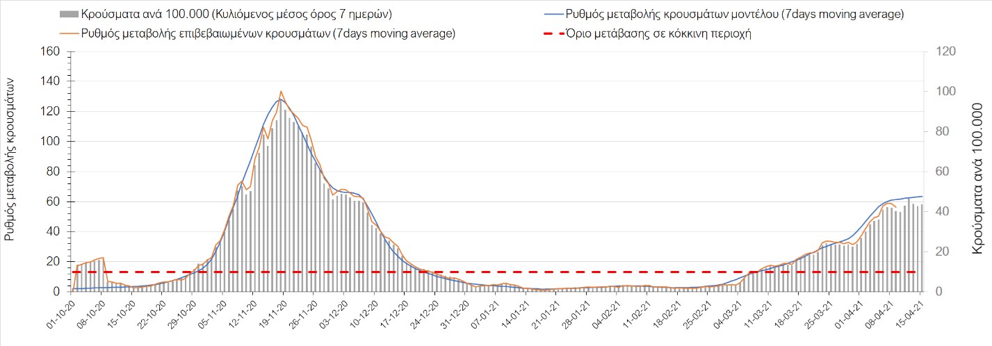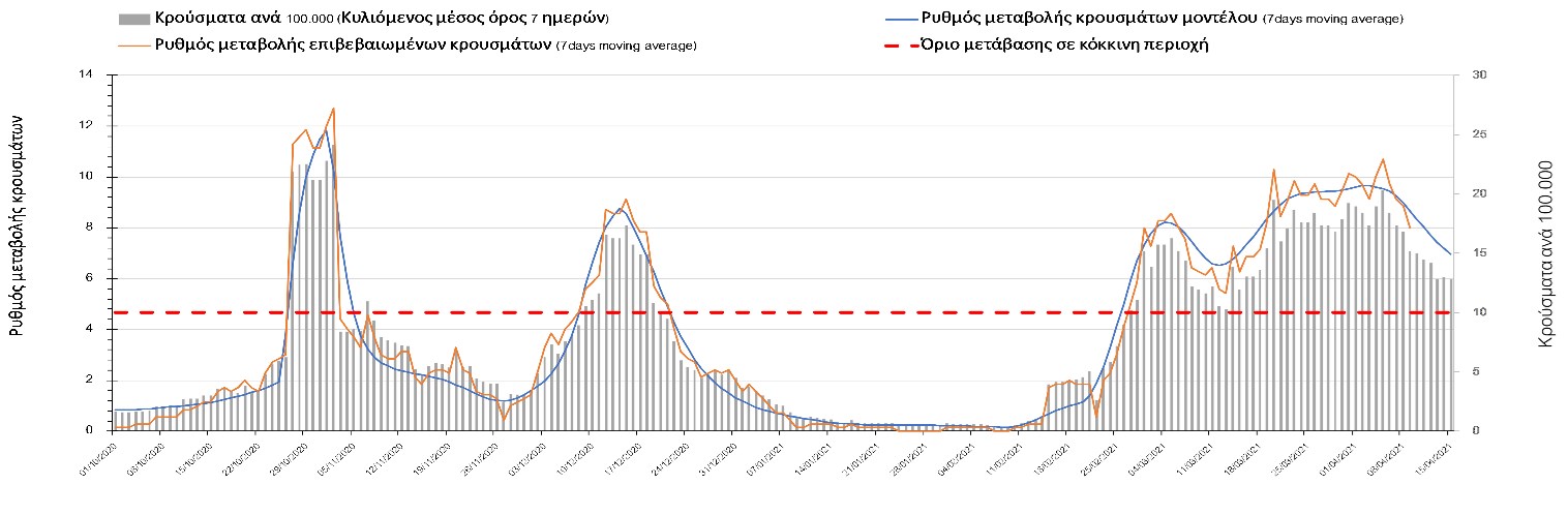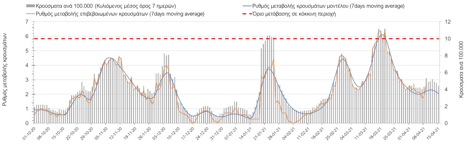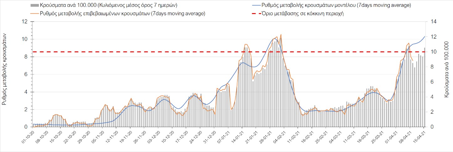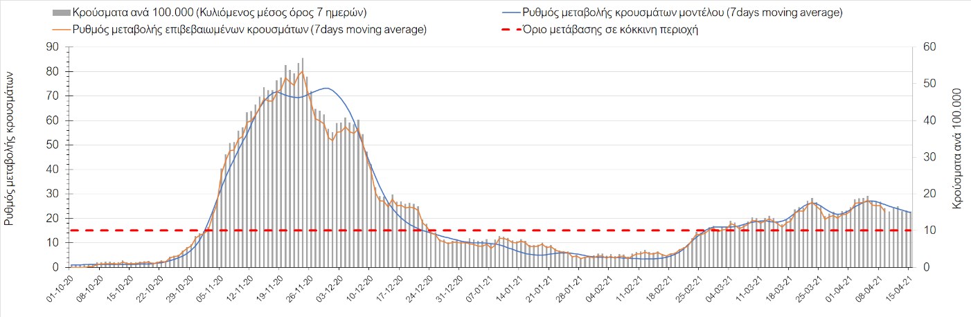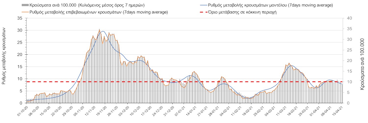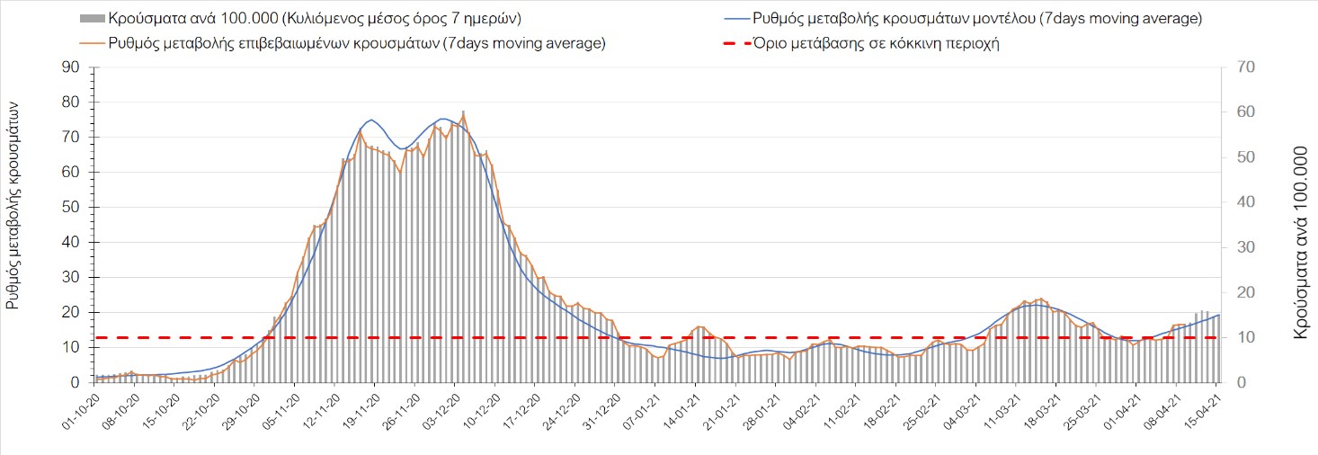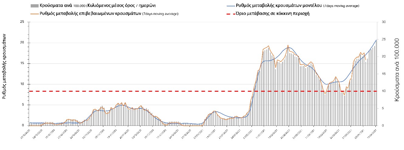 Σχήμα 49. Πορεία του ημερησίου αριθμού των κρουσμάτων (κυλιόμενος μέσος όρος 7 ημερών) στην Θάσο Συμπεράσματα:Η αύξηση που παρατηρείται πλέον στον αριθμό των ασθενών σε κρίσιμη κατάσταση (διασωληνομένοι σε ΜΕΘ), καθώς και ο αριθμός των θανάτων (αν και με κάποια μικρή απόκλιση την Παρασκευή) συνάδουν με τις προσομοιώσεις του μοντέλου CORE, όπως και ο αριθμός των κρουσμάτων, μετά και τις επικαιροποιημένες προβλέψεις προ 15 ημερών, όπου ελήφθη υπόψιν η μεγαλύτερη διασπορά των μεταλλαγμένων και ταχύτερα μεταδιδόμενων στελεχών. Σε πανελλαδικό επίπεδο ο κυλιόμενος εβδομαδιαίος μέσος όρος του δείκτη θετικότητας διαμορφώθηκε στο 6,8% (η ημερήσια τιμή ήταν την Παρασκευή4,8%) ενώ ο κυλιόμενος εβδομαδιαίος μέσος όρος του πραγματικού αριθμού αναπαραγωγής Rt (δηλαδή ο αριθμός των ατόμων που ένας φορέας μπορεί να επιμολύνει) διαμορφώθηκε στο 1,05 (τιμές του Rt πάνω από τη μονάδα υποδηλώνουν καθαρή αύξηση της διασποράς του ιού στην κοινότητα). Αξίζει να σημειωθεί ότι είναι η πρώτη φορά που έχουμε ταυτόχρονη μείωση και των δύο δεικτών, γεγονός που εάν δεν οφείλεται σε αστοχία της ιχνηλάτησης των κρουσμάτων, υποδηλώνει κάμψη της ανοδικής τάσης. Όμως, με δεδομένο το άνοιγμα του λιανικού εμπορίου στις 5 Απριλίου (εκτός άπο τις περιοχές της Θεσσαλονίκης, Αχαΐας που θα πραγματοποιηθεί στις 12 Απριλίου και Κοζάνης που ακόμα παραμένει κλειστό) και των Λυκείων στις 12 Απριλίου, είναι ακομα πιο σημαντική η τήρηση των μέτρων, ενώ ύψιστης σημασίας στις επόμενες εβδομάδες θα αποδειχθεί η ορθή και μαζική εφαρμογή των self-test, με ταυτόχρονη αύξηση της ιχνηλασίας των επαφών των ανιχνευθέντων ως θετικοί και καραντίνα 14 ημερών για τους συμπολίτες μας που θα επιβεβαιωθεί ότι είναι θετικοί στην μόλυνση με SARS-CoV-2 ακόμη και αν είναι ασυμπτωματικοί. Παρά την εφαρμογή οριζόντιων μέτρων ανάσχεσης της πανδημίας που εφαρμόσθηκαν από τα τέλη Οκτωβρίου, η πορεία της τελευταίας διαφοροποιείται από περιοχή σε περιοχή. Οι παραπάνω παρατηρήσεις τείνουν στο συμπέρασμα ότι η διαχείριση του υγειονομικού κινδύνου θα πρέπει να συνεχίσει να εξετάζεται σε τοπικό επίπεδο. Πλέον προβληματίζουν πέρα από την Αττική και τη Θεσσαλονίκη, η Αχαΐα, η Αιτωλοακαρνανία, η Εύβοια, η Βοιωτία, η Χαλκιδική, καθώς επίσης η Αρκαδία, η Ηλεία, η Αργολίδα, η Κορινιθία, η Φθιώτιδα, η Ευρυτανία, η Λάρισα, η Κοζάνη, η Καστοριά, η Καβάλα, η Χίος, το Ηράκλειο, τα Χανιά, τα Ιωάννινα, η Ημαθία, η Πέλλα, το Κιλκίς, τα Γρεβενά, η Μαγνησία, η Καρδίτσα και πλέον και το Λασίθι. Ανάγκη αυξημένης επιτήρησης έχουν το Κιλκίς, οι Σέρρες και η Πέλλα, Συνολικά, τα τεστ ανίχνευσης θα πρέπει να φτάσουν τουλάχιστον στα 120.000 και να δίνεται έμφαση στοχευμένα στις περιφερειακές ενότητες στις οποίες η δυναμική της διασποράς φαίνεται να είναι ανησυχητική για 1-2 ημέρες ώστε να ανιχνεύονται οι ασυμπτωματικοί και προσυμπτωματικοί φορείς και να σπάει η αλυσίδα μετάδοσης βάζοντάς τους σε καραντίνα. Λόγω της ανησυχίας που εγείρει η παρουσία στην κοινότητα των μεταλλαγμένων στελέχους του SARS-CoV-2 (κυρίως η βρετανική και η νοτιοαφρικανική μετάλλαξη) και προκειμένου να περιορίσουμε ή τουλάχιστον να καθυστερήσουμε την ευρεία διασπορά τους, προτείνουμε τα ακόλουθα μέτρα πριν συζητηθεί το περαιτέρω άνοιγμα εκπαιδευτικών και οικονομικών δραστηριοτήτων:– πιστή εφαρμογή του ήδη υπάρχοντος νομοθετικού πλαισίου για την τηλεργασία (όσο το δυνατόν περισσότερο, αλλ