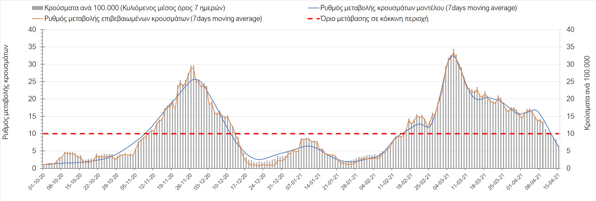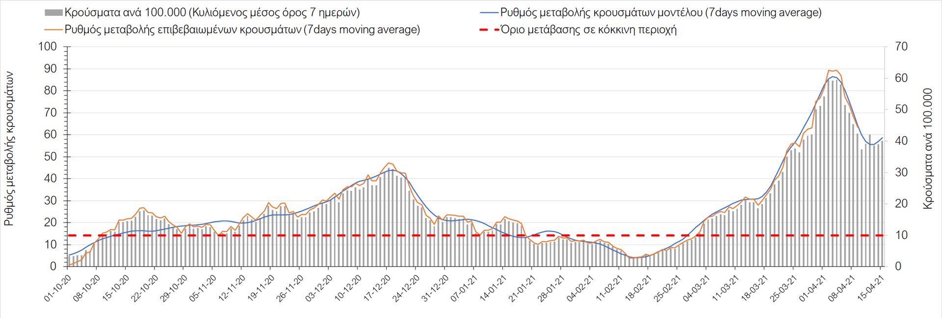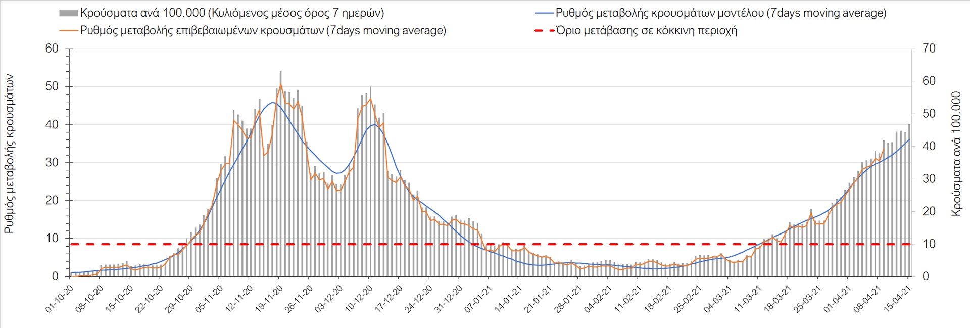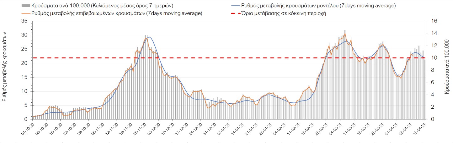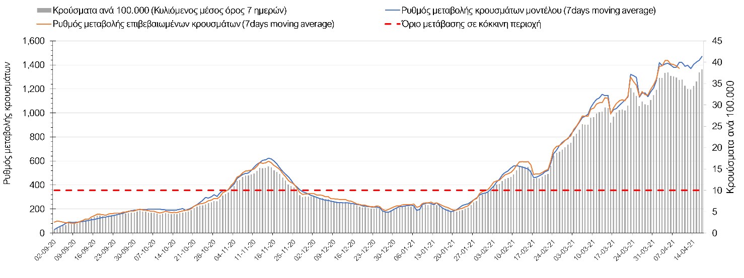 Σχήμα 49. Πορεία του ημερησίου αριθμού των κρουσμάτων (κυλιόμενος μέσος όρος 7 ημερών) στην Θάσο Συμπεράσματα:Η αύξηση που παρατηρείται πλέον στον αριθμό των ασθενών σε κρίσιμη κατάσταση (διασωληνομένοι σε ΜΕΘ), καθώς και ο αριθμός των θανάτων (αν και με κάποια μικρή απόκλιση την Παρασκευή) συνάδουν με τις προσομοιώσεις του μοντέλου CORE, όπως και ο αριθμός των κρουσμάτων, μετά και τις επικαιροποιημένες προβλέψεις προ 15 ημερών, όπου ελήφθη υπόψιν η μεγαλύτερη διασπορά των μεταλλαγμένων και ταχύτερα μεταδιδόμενων στελεχών. Σε πανελλαδικό επίπεδο ο κυλιόμενος εβδομαδιαίος μέσος όρος του δείκτη θετικότητας διαμορφώθηκε στο 6,8% (η ημερήσια τιμή ήταν την Παρασκευή4,8%) ενώ ο κυλιόμενος εβδομαδιαίος μέσος όρος του πραγματικού αριθμού αναπαραγωγής Rt (δηλαδή ο αριθμός των ατόμων που ένας φορέας μπορεί να επιμολύνει) διαμορφώθηκε στο 1,05 (τιμές του Rt πάνω από τη μονάδα υποδηλώνουν καθαρή αύξηση της διασποράς του ιού στην κοινότητα). Αξίζει να σημειωθεί ότι είναι η πρώτη φορά που έχουμε ταυτόχρονη μείωση και των δύο δεικτών, γεγονός που εάν δεν οφείλεται σε αστοχία της ιχνηλάτησης των κρουσμάτων, υποδηλώνει κάμψη της ανοδικής τάσης. Όμως, με δεδομένο το άνοιγμα του λιανικού εμπορίου στις 5 Απριλίου (εκτός άπο τις περιοχές της Θεσσαλονίκης, Αχαΐας που θα πραγματοποιηθεί στις 12 Απριλίου και Κοζάνης που ακόμα παραμένει κλειστό) και των Λυκείων στις 12 Απριλίου, είναι ακομα πιο σημαντική η τήρηση των μέτρων, ενώ ύψιστης σημασίας στις επόμενες εβδομάδες θα αποδειχθεί η ορθή και μαζική εφαρμογή των self-test, με ταυτόχρονη αύξηση της ιχνηλασίας των επαφών των ανιχνευθέντων ως θετικοί και καραντίνα 14 ημερών για τους συμπολίτες μας που θα επιβεβαιωθεί ότι είναι θετικοί στην μόλυνση με SARS-CoV-2 ακόμη και αν είναι ασυμπτωματικοί. Παρά την εφαρμογή οριζόντιων μέτρων ανάσχεσης της πανδημίας που εφαρμόσθηκαν από τα τέλη Οκτωβρίου, η πορεία της τελευταίας διαφοροποιείται από περιοχή σε περιοχή. Οι παραπάνω παρατηρήσεις τείνουν στο συμπέρασμα ότι η διαχείριση του υγειονομικού κινδύνου θα πρέπει να συνεχίσει να εξετάζεται σε τοπικό επίπεδο. Πλέον προβληματίζουν πέρα από την Αττική και τη Θεσσαλονίκη, η Αχαΐα, η Αιτωλοακαρνανία, η Εύβοια, η Βοιωτία, η Χαλκιδική, καθώς επίσης η Αρκαδία, η Ηλεία, η Αργολίδα, η Κορινιθία, η Φθιώτιδα, η Ευρυτανία, η Λάρισα, η Κοζάνη, η Καστοριά, η Καβάλα, η Χίος, το Ηράκλειο, τα Χανιά, τα Ιωάννινα, η Ημαθία, η Πέλλα, το Κιλκίς, τα Γρεβενά, η Μαγνησία, η Καρδίτσα και πλέον και το Λασίθι. Ανάγκη αυξημένης επιτήρησης έχουν το Κιλκίς, οι Σέρρες και η Πέλλα, Συνολικά, τα τεστ ανίχνευσης θα πρέπει να φτάσουν τουλάχιστον στα 120.000 και να δίνεται έμφαση στοχευμένα στις περιφερειακές ενότητες στις οποίες η δυναμική της διασποράς φαίνεται να είναι ανησυχητική για 1-2 ημέρες ώστε να ανιχνεύονται οι ασυμπτωματικοί και προσυμπτωματικοί φορείς και να σπάει η αλυσίδα μετάδοσης βάζοντάς τους σε καραντίνα. Λόγω της ανησυχίας που εγείρει η παρουσία στην κοινότητα των μεταλλαγμένων στελέχους του SARS-CoV-2 (κυρίως η βρετανική και η νοτιοαφρικανική μετάλλαξη) και προκειμένου να περιορίσουμε ή τουλάχιστον να καθυστερήσουμε την ευρεία διασπορά τους, προτείνουμε τα ακόλουθα μέτρα πριν συζητηθεί το περαιτέρω άνοιγμα εκπαιδευτικών και οικονομικών δραστηριοτήτων:– πιστή εφαρμογή του ήδη υπάρχοντος νομοθετικού πλαισίου για την τηλεργασία (όσο το δυνατόν περισσότερο, αλλ