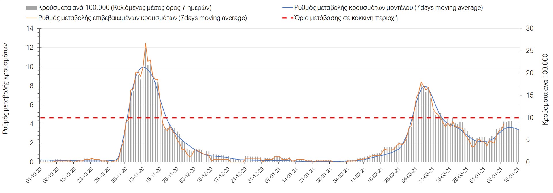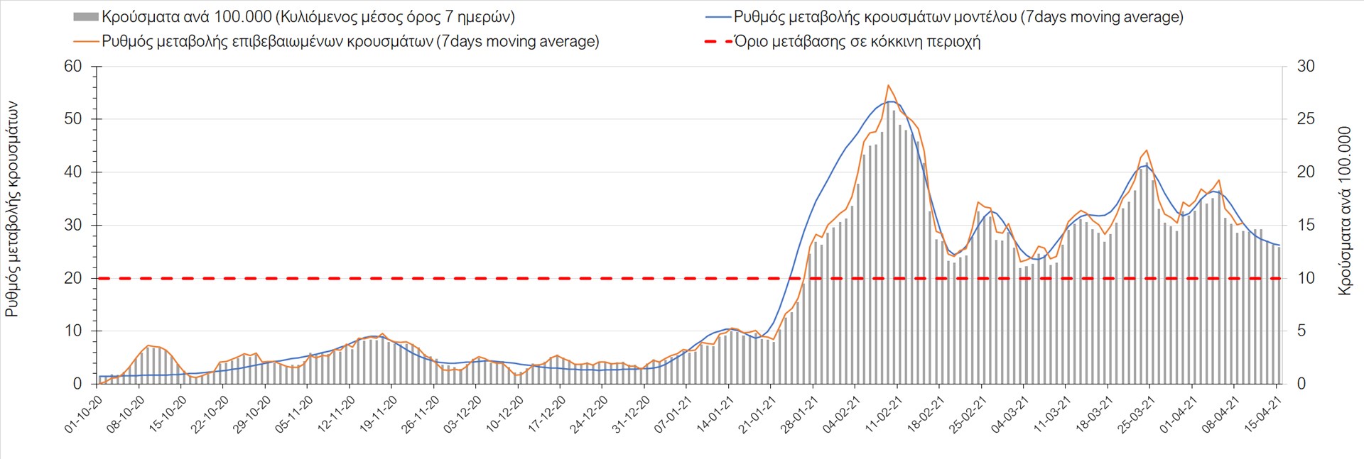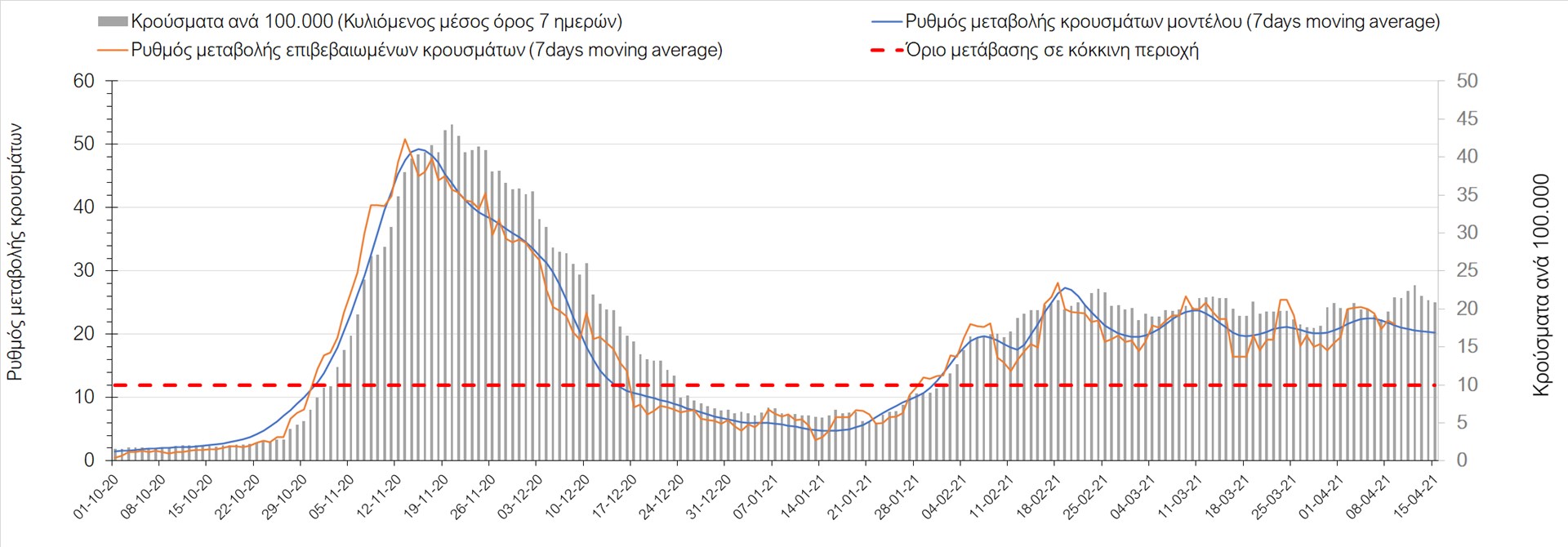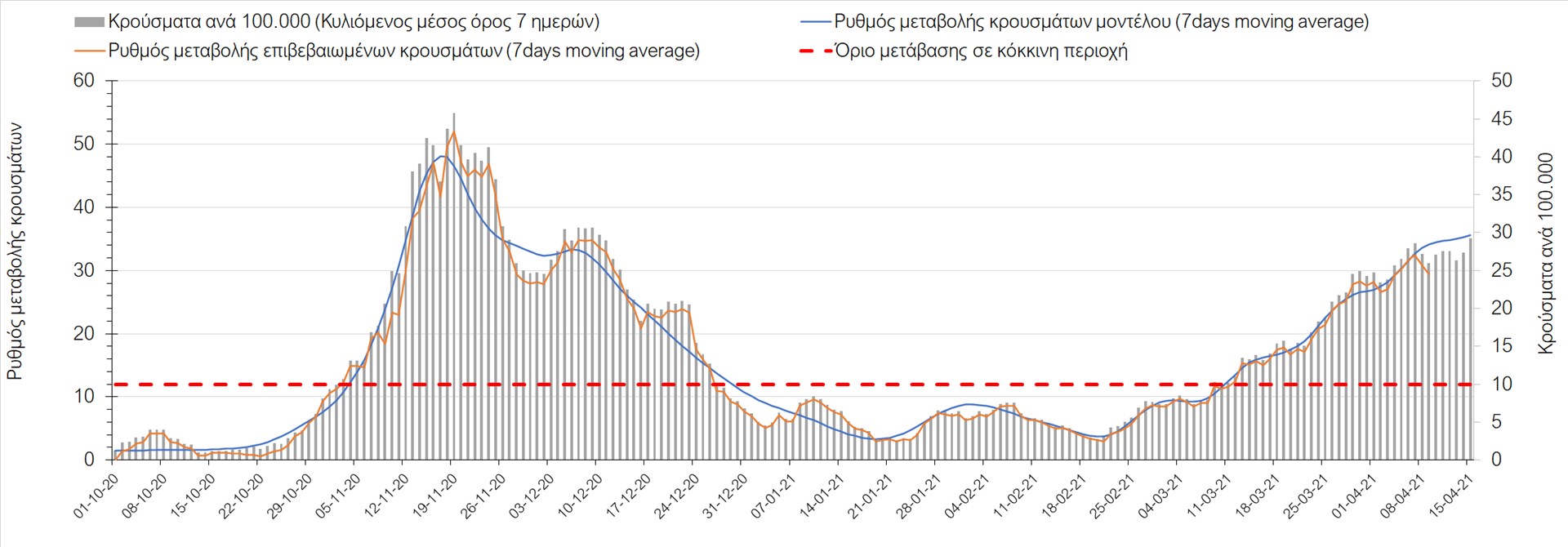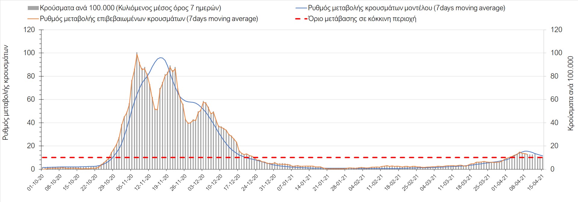 Σχήμα 49. Πορεία του ημερησίου αριθμού των κρουσμάτων (κυλιόμενος μέσος όρος 7 ημερών) στην Θάσο Συμπεράσματα:Η αύξηση που παρατηρείται πλέον στον αριθμό των ασθενών σε κρίσιμη κατάσταση (διασωληνομένοι σε ΜΕΘ), καθώς και ο αριθμός των θανάτων (αν και με κάποια μικρή απόκλιση την Παρασκευή) συνάδουν με τις προσομοιώσεις του μοντέλου CORE, όπως και ο αριθμός των κρουσμάτων, μετά και τις επικαιροποιημένες προβλέψεις προ 15 ημερών, όπου ελήφθη υπόψιν η μεγαλύτερη διασπορά των μεταλλαγμένων και ταχύτερα μεταδιδόμενων στελεχών. Σε πανελλαδικό επίπεδο ο κυλιόμενος εβδομαδιαίος μέσος όρος του δείκτη θετικότητας διαμορφώθηκε στο 6,8% (η ημερήσια τιμή ήταν την Παρασκευή4,8%) ενώ ο κυλιόμενος εβδομαδιαίος μέσος όρος του πραγματικού αριθμού αναπαραγωγής Rt (δηλαδή ο αριθμός των ατόμων που ένας φορέας μπορεί να επιμολύνει) διαμορφώθηκε στο 1,05 (τιμές του Rt πάνω από τη μονάδα υποδηλώνουν καθαρή αύξηση της διασποράς του ιού στην κοινότητα). Αξίζει να σημειωθεί ότι είναι η πρώτη φορά που έχουμε ταυτόχρονη μείωση και των δύο δεικτών, γεγονός που εάν δεν οφείλεται σε αστοχία της ιχνηλάτησης των κρουσμάτων, υποδηλώνει κάμψη της ανοδικής τάσης. Όμως, με δεδομένο το άνοιγμα του λιανικού εμπορίου στις 5 Απριλίου (εκτός άπο τις περιοχές της Θεσσαλονίκης, Αχαΐας που θα πραγματοποιηθεί στις 12 Απριλίου και Κοζάνης που ακόμα παραμένει κλειστό) και των Λυκείων στις 12 Απριλίου, είναι ακομα πιο σημαντική η τήρηση των μέτρων, ενώ ύψιστης σημασίας στις επόμενες εβδομάδες θα αποδειχθεί η ορθή και μαζική εφαρμογή των self-test, με ταυτόχρονη αύξηση της ιχνηλασίας των επαφών των ανιχνευθέντων ως θετικοί και καραντίνα 14 ημερών για τους συμπολίτες μας που θα επιβεβαιωθεί ότι είναι θετικοί στην μόλυνση με SARS-CoV-2 ακόμη και αν είναι ασυμπτωματικοί. Παρά την εφαρμογή οριζόντιων μέτρων ανάσχεσης της πανδημίας που εφαρμόσθηκαν από τα τέλη Οκτωβρίου, η πορεία της τελευταίας διαφοροποιείται από περιοχή σε περιοχή. Οι παραπάνω παρατηρήσεις τείνουν στο συμπέρασμα ότι η διαχείριση του υγειονομικού κινδύνου θα πρέπει να συνεχίσει να εξετάζεται σε τοπικό επίπεδο. Πλέον προβληματίζουν πέρα από την Αττική και τη Θεσσαλονίκη, η Αχαΐα, η Αιτωλοακαρνανία, η Εύβοια, η Βοιωτία, η Χαλκιδική, καθώς επίσης η Αρκαδία, η Ηλεία, η Αργολίδα, η Κορινιθία, η Φθιώτιδα, η Ευρυτανία, η Λάρισα, η Κοζάνη, η Καστοριά, η Καβάλα, η Χίος, το Ηράκλειο, τα Χανιά, τα Ιωάννινα, η Ημαθία, η Πέλλα, το Κιλκίς, τα Γρεβενά, η Μαγνησία, η Καρδίτσα και πλέον και το Λασίθι. Ανάγκη αυξημένης επιτήρησης έχουν το Κιλκίς, οι Σέρρες και η Πέλλα, Συνολικά, τα τεστ ανίχνευσης θα πρέπει να φτάσουν τουλάχιστον στα 120.000 και να δίνεται έμφαση στοχευμένα στις περιφερειακές ενότητες στις οποίες η δυναμική της διασποράς φαίνεται να είναι ανησυχητική για 1-2 ημέρες ώστε να ανιχνεύονται οι ασυμπτωματικοί και προσυμπτωματικοί φορείς και να σπάει η αλυσίδα μετάδοσης βάζοντάς τους σε καραντίνα. Λόγω της ανησυχίας που εγείρει η παρουσία στην κοινότητα των μεταλλαγμένων στελέχους του SARS-CoV-2 (κυρίως η βρετανική και η νοτιοαφρικανική μετάλλαξη) και προκειμένου να περιορίσουμε ή τουλάχιστον να καθυστερήσουμε την ευρεία διασπορά τους, προτείνουμε τα ακόλουθα μέτρα πριν συζητηθεί το περαιτέρω άνοιγμα εκπαιδευτικών και οικονομικών δραστηριοτήτων:– πιστή εφαρμογή του ήδη υπάρχοντος νομοθετικού πλαισίου για την τηλεργασία (όσο το δυνατόν περισσότερο, αλλ