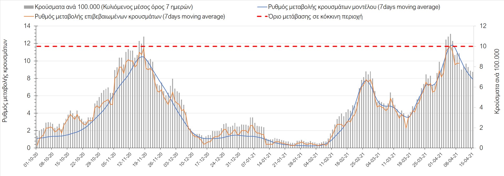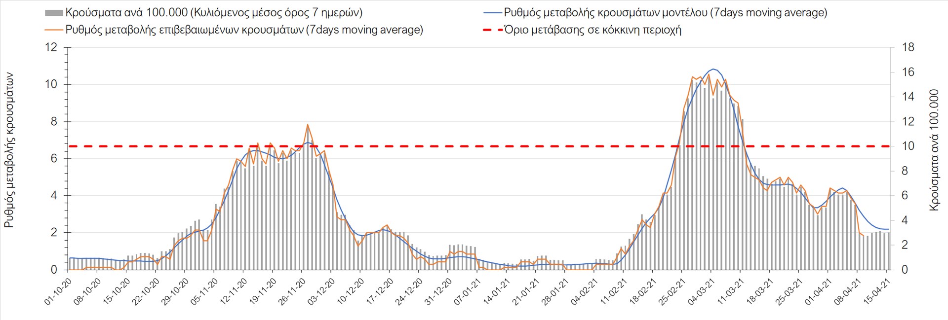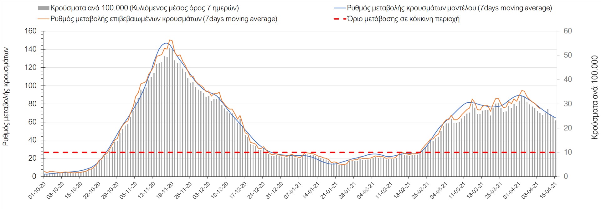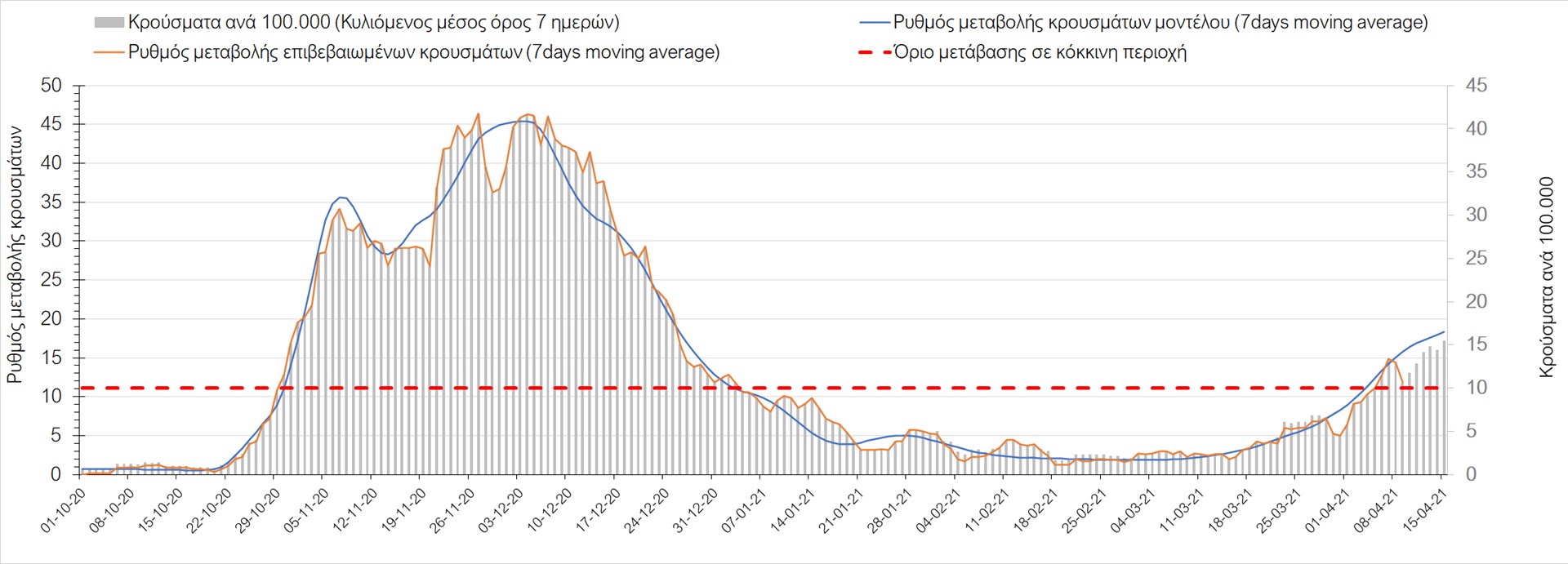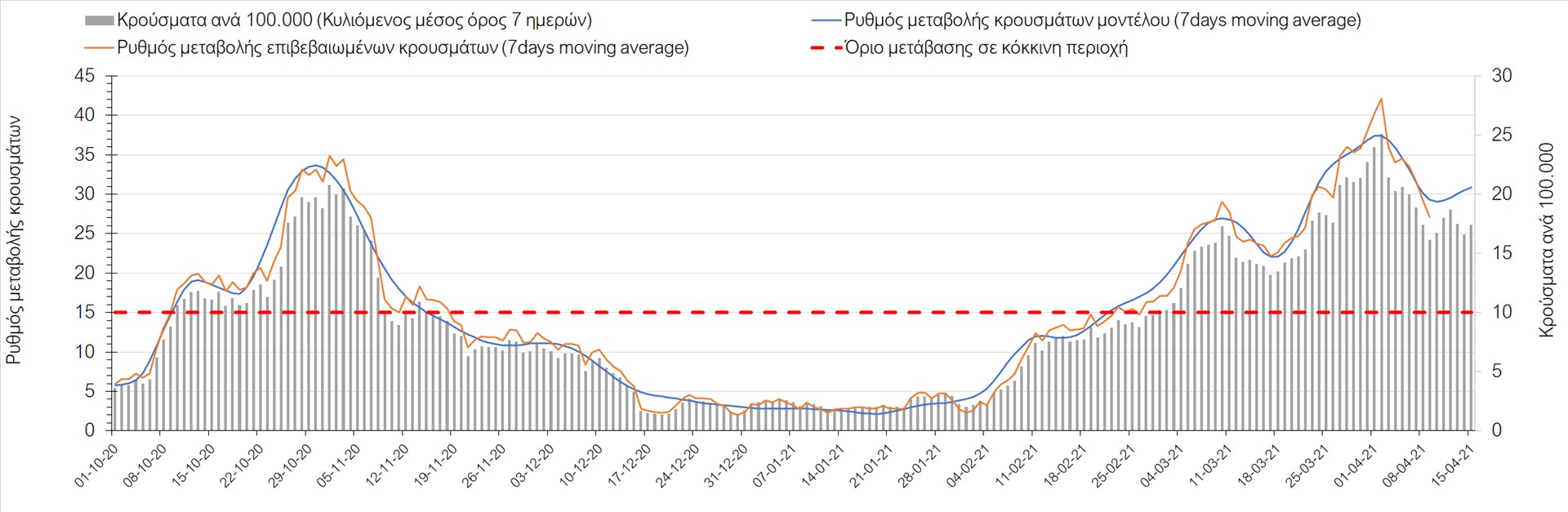 Σχήμα 49. Πορεία του ημερησίου αριθμού των κρουσμάτων (κυλιόμενος μέσος όρος 7 ημερών) στην Θάσο Συμπεράσματα:Η αύξηση που παρατηρείται πλέον στον αριθμό των ασθενών σε κρίσιμη κατάσταση (διασωληνομένοι σε ΜΕΘ), καθώς και ο αριθμός των θανάτων (αν και με κάποια μικρή απόκλιση την Παρασκευή) συνάδουν με τις προσομοιώσεις του μοντέλου CORE, όπως και ο αριθμός των κρουσμάτων, μετά και τις επικαιροποιημένες προβλέψεις προ 15 ημερών, όπου ελήφθη υπόψιν η μεγαλύτερη διασπορά των μεταλλαγμένων και ταχύτερα μεταδιδόμενων στελεχών. Σε πανελλαδικό επίπεδο ο κυλιόμενος εβδομαδιαίος μέσος όρος του δείκτη θετικότητας διαμορφώθηκε στο 6,8% (η ημερήσια τιμή ήταν την Παρασκευή4,8%) ενώ ο κυλιόμενος εβδομαδιαίος μέσος όρος του πραγματικού αριθμού αναπαραγωγής Rt (δηλαδή ο αριθμός των ατόμων που ένας φορέας μπορεί να επιμολύνει) διαμορφώθηκε στο 1,05 (τιμές του Rt πάνω από τη μονάδα υποδηλώνουν καθαρή αύξηση της διασποράς του ιού στην κοινότητα). Αξίζει να σημειωθεί ότι είναι η πρώτη φορά που έχουμε ταυτόχρονη μείωση και των δύο δεικτών, γεγονός που εάν δεν οφείλεται σε αστοχία της ιχνηλάτησης των κρουσμάτων, υποδηλώνει κάμψη της ανοδικής τάσης. Όμως, με δεδομένο το άνοιγμα του λιανικού εμπορίου στις 5 Απριλίου (εκτός άπο τις περιοχές της Θεσσαλονίκης, Αχαΐας που θα πραγματοποιηθεί στις 12 Απριλίου και Κοζάνης που ακόμα παραμένει κλειστό) και των Λυκείων στις 12 Απριλίου, είναι ακομα πιο σημαντική η τήρηση των μέτρων, ενώ ύψιστης σημασίας στις επόμενες εβδομάδες θα αποδειχθεί η ορθή και μαζική εφαρμογή των self-test, με ταυτόχρονη αύξηση της ιχνηλασίας των επαφών των ανιχνευθέντων ως θετικοί και καραντίνα 14 ημερών για τους συμπολίτες μας που θα επιβεβαιωθεί ότι είναι θετικοί στην μόλυνση με SARS-CoV-2 ακόμη και αν είναι ασυμπτωματικοί. Παρά την εφαρμογή οριζόντιων μέτρων ανάσχεσης της πανδημίας που εφαρμόσθηκαν από τα τέλη Οκτωβρίου, η πορεία της τελευταίας διαφοροποιείται από περιοχή σε περιοχή. Οι παραπάνω παρατηρήσεις τείνουν στο συμπέρασμα ότι η διαχείριση του υγειονομικού κινδύνου θα πρέπει να συνεχίσει να εξετάζεται σε τοπικό επίπεδο. Πλέον προβληματίζουν πέρα από την Αττική και τη Θεσσαλονίκη, η Αχαΐα, η Αιτωλοακαρνανία, η Εύβοια, η Βοιωτία, η Χαλκιδική, καθώς επίσης η Αρκαδία, η Ηλεία, η Αργολίδα, η Κορινιθία, η Φθιώτιδα, η Ευρυτανία, η Λάρισα, η Κοζάνη, η Καστοριά, η Καβάλα, η Χίος, το Ηράκλειο, τα Χανιά, τα Ιωάννινα, η Ημαθία, η Πέλλα, το Κιλκίς, τα Γρεβενά, η Μαγνησία, η Καρδίτσα και πλέον και το Λασίθι. Ανάγκη αυξημένης επιτήρησης έχουν το Κιλκίς, οι Σέρρες και η Πέλλα, Συνολικά, τα τεστ ανίχνευσης θα πρέπει να φτάσουν τουλάχιστον στα 120.000 και να δίνεται έμφαση στοχευμένα στις περιφερειακές ενότητες στις οποίες η δυναμική της διασποράς φαίνεται να είναι ανησυχητική για 1-2 ημέρες ώστε να ανιχνεύονται οι ασυμπτωματικοί και προσυμπτωματικοί φορείς και να σπάει η αλυσίδα μετάδοσης βάζοντάς τους σε καραντίνα. Λόγω της ανησυχίας που εγείρει η παρουσία στην κοινότητα των μεταλλαγμένων στελέχους του SARS-CoV-2 (κυρίως η βρετανική και η νοτιοαφρικανική μετάλλαξη) και προκειμένου να περιορίσουμε ή τουλάχιστον να καθυστερήσουμε την ευρεία διασπορά τους, προτείνουμε τα ακόλουθα μέτρα πριν συζητηθεί το περαιτέρω άνοιγμα εκπαιδευτικών και οικονομικών δραστηριοτήτων:– πιστή εφαρμογή του ήδη υπάρχοντος νομοθετικού πλαισίου για την τηλεργασία (όσο το δυνατόν περισσότερο, αλλ