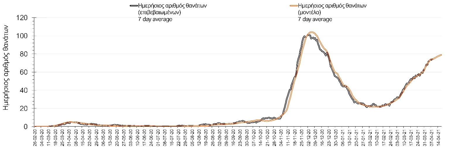 Σχήμα 2. Αριθμός θανάτων (κυλιόμενος μέσος όρος 7 ημερών) σύμφωνα με τα στοιχεία του ΕΟΔΥ και τις προβλέψεις της υπολογιστικής πλατφόρμας CORE.Η πορεία της μέσης εβδομαδιαίας τιμής των κρουσμάτων, καθώς και του κυλιόμενου μέσου όρου 7 ημερών του αριθμού των κρουσμάτων ανά 100.000 πληθυσμού, όπως έχουν καταγραφεί από τον ΕΟΔΥ και η αναμενόμενη πορεία τους όπως προδιαγράφεται από την υπολογιστική πλατφόρμα CORE για την Ελληνική επικράτεια μέχρι το μέσα Απριλίου, αποτυπώνονται στο Σχήμα 3. Όπως φαίνεται από το διάγραμμα, από τις 8 Ιανουαρίου έχουμε μια αύξηση κρουσμάτων μέχρι τις 11 Ιανουαρίου η οποία οφείλεται στη μείωση της περιστολής που σημειώθηκε στις γιορτές. Από τις 11 μέχρι τις 18 Ιανουαρίου προβλεπόταν μια μείωση κρουσμάτων λόγω της εφαρμογής του lockdown και η οποία όντως παρατηρήθηκε. Εντούτοις, όπως είχαμε προβλέψει, από τις 23 Ιανουαρίου και έπειτα διαφαίνεται αύξηση στον κυλιόμενο μέσο όρο των κρουσμάτων, η οποία έγινε ιδιαίτερα έντονη μετά τις 17/2, η οποία και συνεχίζεται μέχρι τώρα. Λόγω της ισχυρής παρουσίας των μεταλλαγμένων στελεχών, πιστεύουμε ότι για να επιτευχθεί κάμψη της επιδημικής καμπύλης, θα πρέπει να γίνει αυστηρή εφαρμογή των μέτρων, έτσι ώστε σε συνδυασμό με την επικρατούσα μετεωρολογία να επέλθει επιβράδυνση της ανόδου ή και σταθεροποίηση των κρουσμάτων προς το τέλος του μήνα. Πάντως για να μπορέσουμε να προχωρήσουμε σε σταδιακή άρση των περιοριστικών μέτρων για οικονομικές, εκπαιδευτικές και πολιτιστικές/αθλητικές δραστηριότητες, θα πρέπει να δημιουργήσουμε την κατάλληλη υποδομή ώστε να μπορέσουμε να αναχαιτίσουμε την υπερμετάδοση των μεταλλαγμένων στελεχών εκεί όπου συμβαίνει κατά το μάλλον, δηλαδή στους τόπους εργασίας και τα μέσα μαζικής μεταφοράς. Στα συμπεράσματα προτείνονται σχετικές λύσεις.