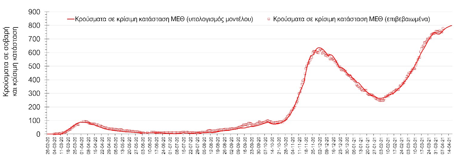 Σχήμα 1. Αριθμός κρουσμάτων σε κρίσιμη κατάσταση (ΜΕΘ) σύμφωνα με τα στοιχεία του ΕΟΔΥ και τις προβλέψεις της υπολογιστικής πλατφόρμας CORE.