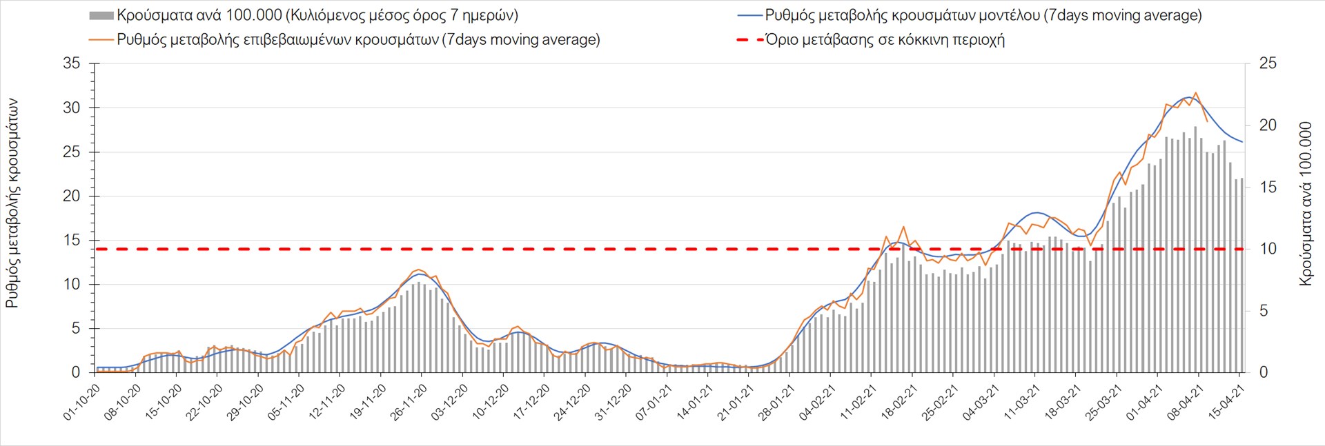Σχήμα 34. Πορεία του ημερησίου αριθμού των κρουσμάτων (κυλιόμενος μέσος όρος 7 ημερών) στην Πιερία