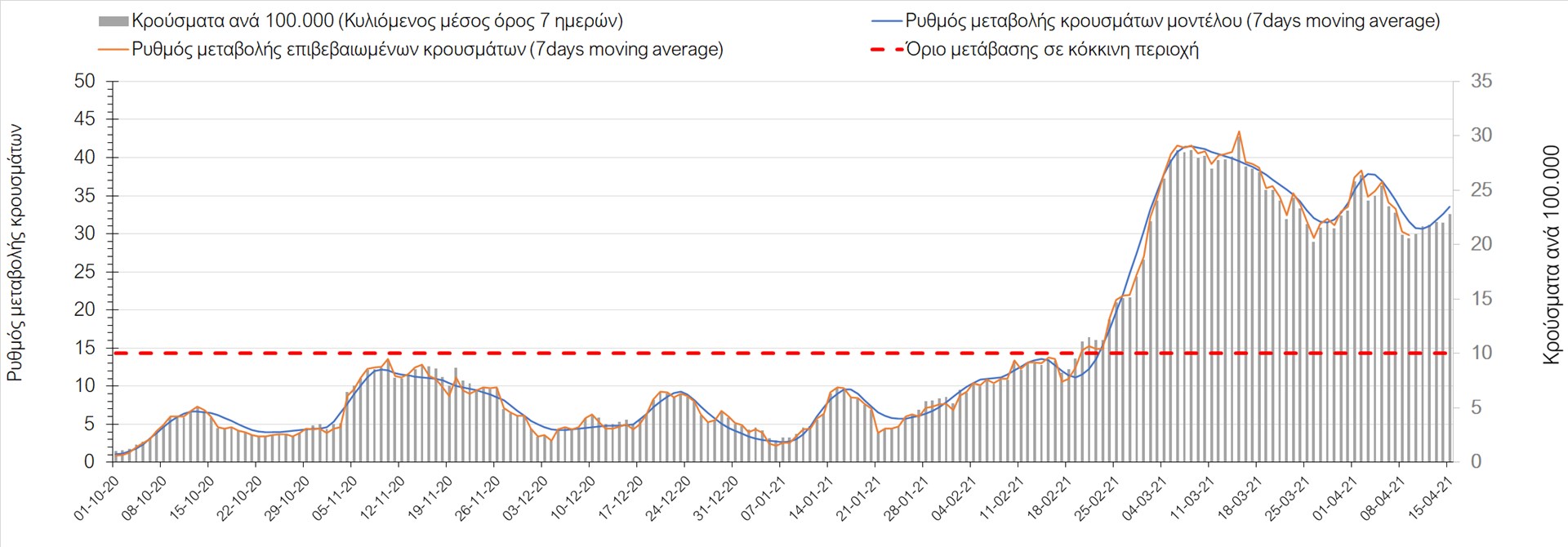 Σχήμα 41. Πορεία του ημερησίου αριθμού των κρουσμάτων (κυλιόμενος μέσος όρος 7 ημερών) στον ΈβροΣτο Ηράκλειο, όπου εντοπίστηκαν 50 κρούσματα παρατηρείται αύξηση σε σχέση με προχθές (Σχήμα 42). Παρά τις έντονες διακυμάνσεις λόγω του πολύ μεγάλου αριθμού φορέων του μεταλλαγμένου στελέχους Β.1.1.7, το Ηράκλειο διανύει ένα ακόμη ανοδικό κύμα και αυτή η δυναμική σίγουρα θα καθυστερήσει τον αποχαρακτηρισμό της περιοχής ως κόκκινη και μετά τις 15 Απριλίου. Στα Χανιά με 17 κρούσματα (Σχήμα 43) έχουμε μείωση σε σχέση με προχθές, αλλά διαφαίνεται ήδη η αποκλιμάκωση που επίσης αναμέναμε, παρά το πιο πρόσφατο ανοδικό κύμα που αναμένουμε να σταθεροποιηθεί στις επόμενες 3-4 ημέρες. Αύξηση κρουσμάτων παρατηρείται και στο Ρέθυμνο με 21 κρούσματα, στο οποίο έχει διαρφωθεί έντονα ανοδική τάση (Σχήμα 44). Στο Λασίθι παρατηρείται καθοδική πορεία, καθώς εντοπίστηκαν 3 κρούσματα ενώ η συνολική τάση παραμένει ανοδική (Σχήμα 45), έχοντας περάσει πλέον στις κόκκινες περιοχές.