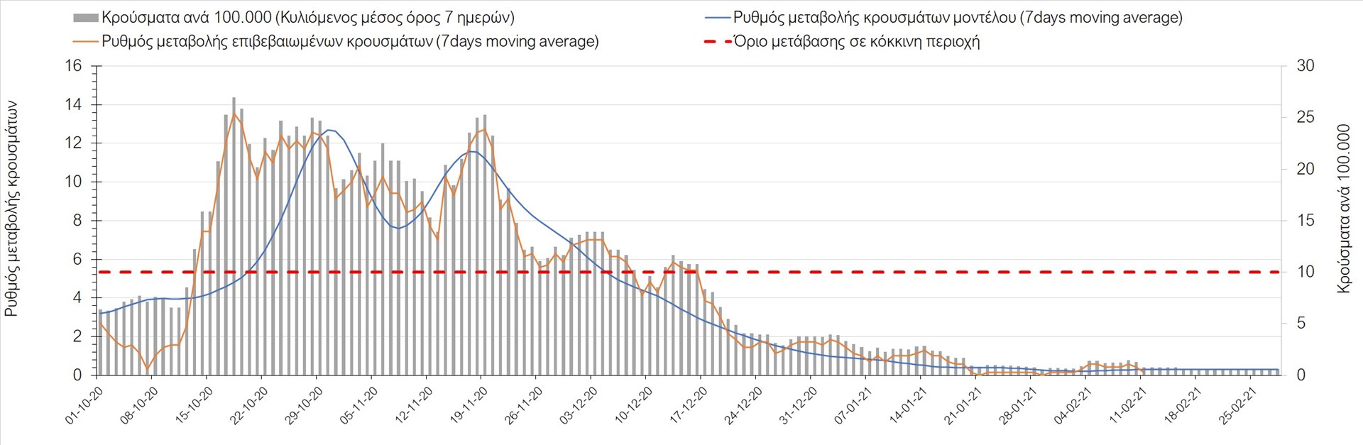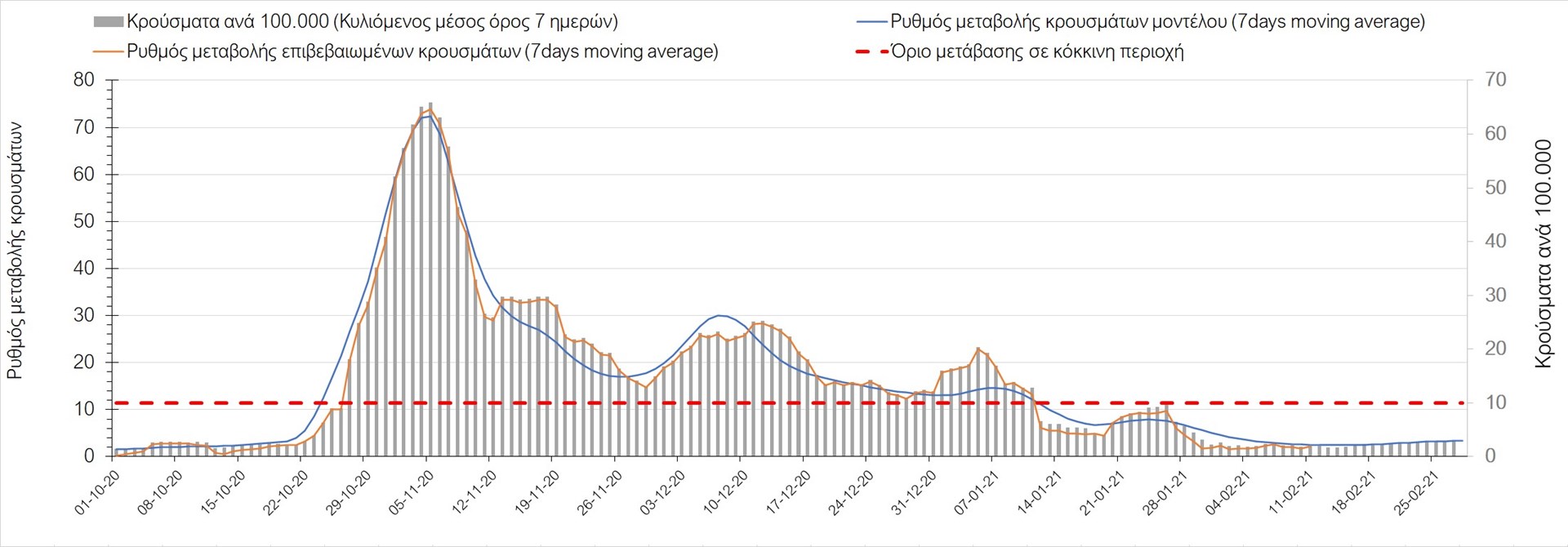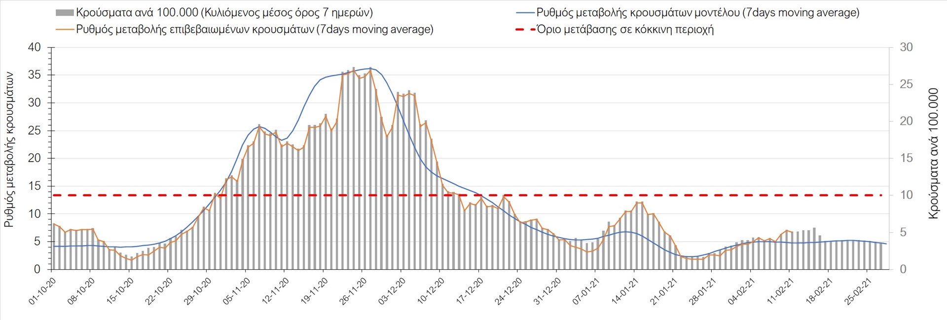 Σχήμα 39. Πορεία του ημερησίου αριθμού των κρουσμάτων (κυλιόμενος μέσος όρος 7 ημερών) στην ΘάσοΣυμπεράσματα:Η αύξηση που παρατηρείται πλέον στον αριθμό των ασθενών σε κρίσιμη κατάσταση (διασωληνομένοι σε ΜΕΘ), καθώς και ο αριθμός των θανάτων συνάδουν που παρατηρήθηκαν σήμερα συνάδουν με τις προσομοιώσεις του μοντέλου CORE για τον επόμενο μήνα, ενώ πλέον και ο αριθμός των νέων κρουσμάτων παραμένει ανησυχητικός, ιδιαίτερα για την Αττική, με δεδομένο και το χαμηλό αριθμό των τεστ ανίχνευσης που πραγματοποιήθηκαν χθες. Τα παραπάνω αποτελέσματα αποτυπώνονται και στο δείκτη θετικότητας. Σε πανελλαδικό επίπεδο ο κυλιόμενος εβδομαδιαίος μέσος όρος του δείκτη θετικότητας παρέμεινε στο 2,9% (η ημερήσια τιμή σήμερα είναι 2,6%) ενώ ο κυλιόμενος εβδομαδιαίος μέσος όρος του πραγματικού αριθμού αναπαραγωγής Rt (δηλαδή ο αριθμός των ατόμων που ένας φορέας μπορεί να επιμολύνει) είναι πλέον 1,27 (τιμές του Rt πάνω από τη μονάδα υποδηλώνουν καθαρή αύξηση της διασποράς του ιού στην κοινότητα). Οι τιμές αυτές δείχνουν ότι αν και καλώς εφαρμόσθηκε το γενικευμένο lockdown της 3ης Ιανουαρίου, έτσι ώστε να αποσβεσθούν όποιες αποκλίσεις στην εφαρμογή των μέτρων υπήρξαν κατά την περίοδο των εορτών, δημιουργώντας θετικές προοπτικές στο σταδιακό άνοιγμα της οικονομίας που ξεκίνησε από τη Δευτέρα 18 Ιανουαρίου, ιδιαίτερη προσοχή πρέπει να δοθεί διότι όπως είχαμε επισημάνει από το προ-προηγούμενο Σαββατοκύριακο, τα αποτελέσματα των τελευταίων ημερών, δείχνουν ότι σε πανελλαδικό επίπεδο υπάρχει συνολικά αύξηση, δημιουργώντας ανησυχία τόσο για την πορεία της πανδημίας, όσο και για την πραγματική εξάπλωση του στελέχους B.1.1.7. του SARS-CoV-2 στην κοινότητα. Αναμένουμε λοιπόν τα αποτελέσματα των επομένων ημερών, όπου ο αριθμός των τεστ ανίχνευσης θα παραμείνει στα συνήθη επίπεδα (άνω των 40.000 ανά ημέρα), και ελπίζουμε να συνεχίσει στα επίπεδα της τελευταίας εβδομάδας, δηλαδή άνω των 45.000, και να συνεχίσει να αυξάνει άμεσα, φτάνοντας τα 80.000-100.000 τεστ ημερησίως. Επιπλέον, με βάση τα δεδομένα αυτής της εβδομάδας, καλώς εφαρμόσθηκαν τα περιοριστικά μέτρα που ισχύουν από τις 6 Φεβρουαρίου, τα οποία ίσως χρειαστούν επιπλέον αναθεώρηση, με βάση την επιδημιολογική εικόνα που θα επικρατήσει, ενώ επίσης καλώς εφαρμόσθηκε το lockdown μέχρι τις 28 Φεβρουαρίου στην Αθήνα. Με τα μέχρι τώρα δεδομένα, τα μέτρα αυτά φαίνονται να είναι ικανά να αναχαιτίσουν προσωρινά την επέλαση ενός τρίτου κύματος, εν αναμονή και επιπλέον στοιχείων, τόσο για τη μεταδοτικότητα του στελέχους B.1.1.7. του SARS-CoV-2, όσο και της διασποράς του στην κοινότητα.Παρά την εφαρμογή οριζοντίων μέτρων ανάσχεσης της πανδημίας που εφαρμόσθηκαν από τα τέλη Οκτωβρίου, η πορεία της τελευταίας διαφοροποιείται από περιοχή σε περιοχή. Οι παραπάνω παρατηρήσεις τείνουν στο συμπέρασμα ότι η διαχείριση του υγειονομικού κινδύνου θα πρέπει να εξεταστεί σε τοπικό επίπεδο (όπως πολύ σωστά έγινε σήμερα με το lockdown στην Αθήνα και προηγουμένως στην Κοζάνη, από τη στιγμή που συνολικά στη χώρα φαίνεται να έχουμε ξεπεράσει την κορύφωση του συγκεκριμένου επιδημικού κύματος του Νοεμβρίου. Παρόλα αυτά, συνιστάται προσεκτική μελέτη των αποτελεσμάτων των επόμενων ημερών, λόγω του ανοίγματος των δημοτικών σχολείων και από αυτή την εβδομάδα και του λιανικού εμπορίου. Με βάση τη συνολική εικόνα που έχει διαμορφωθεί, έχουμε εντελώς διαφορετική κατανομή στο χάρτη