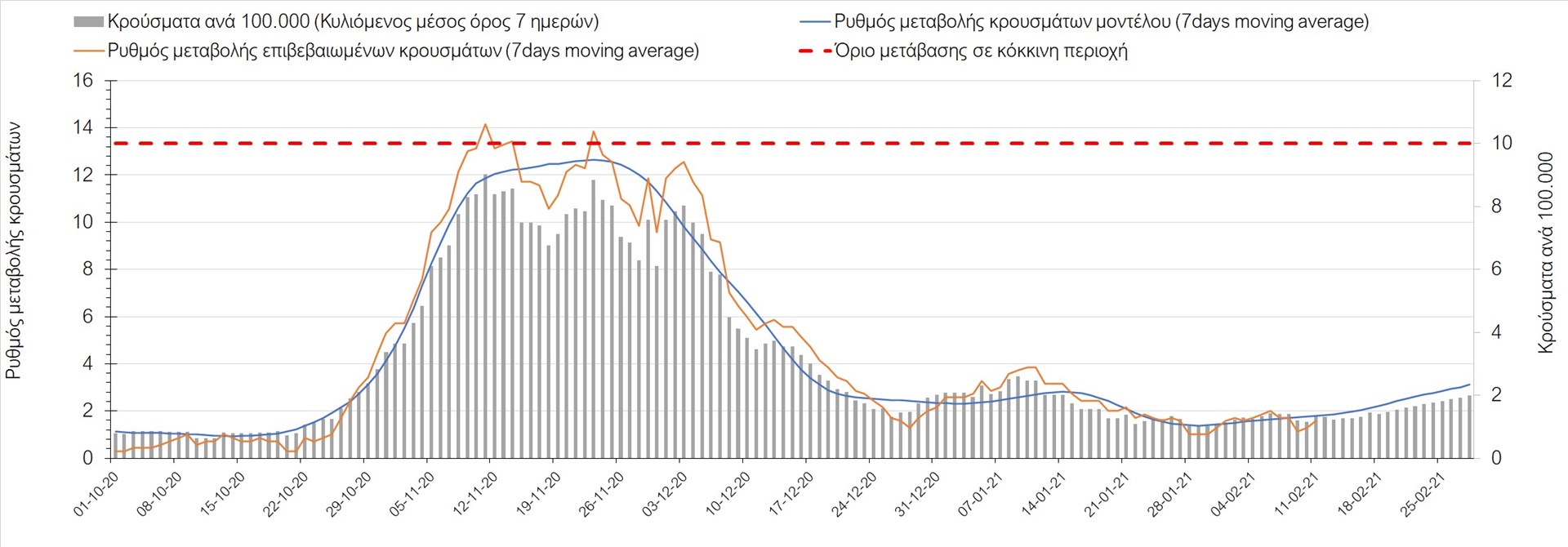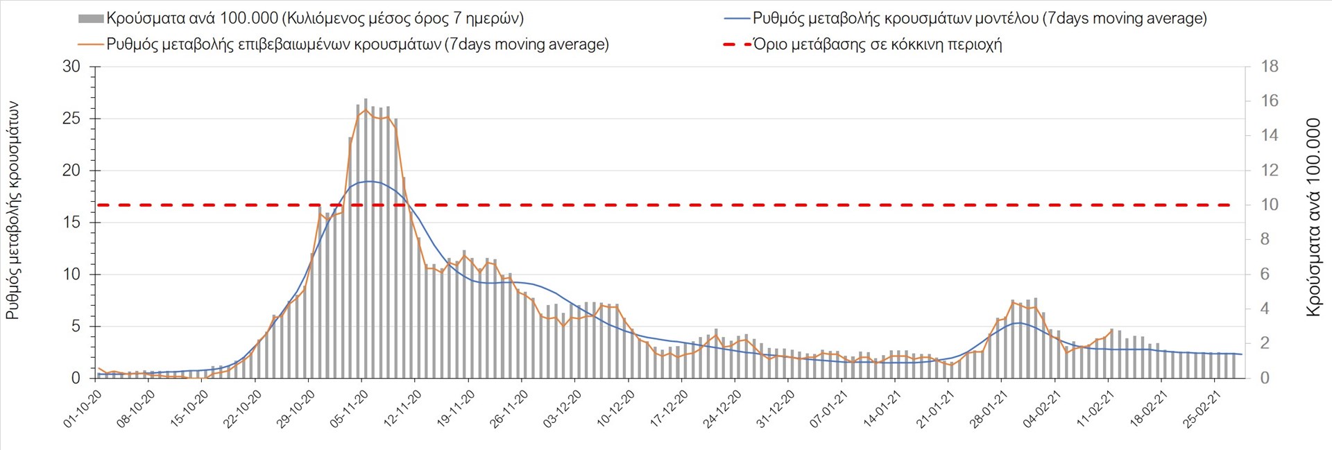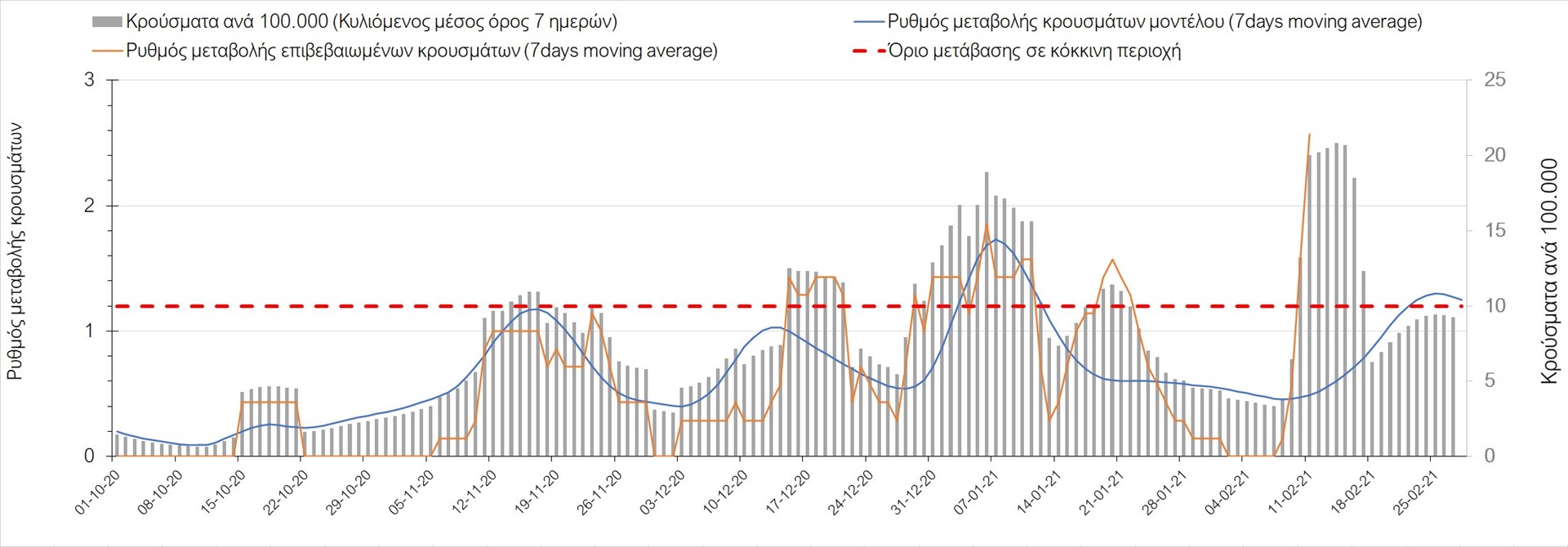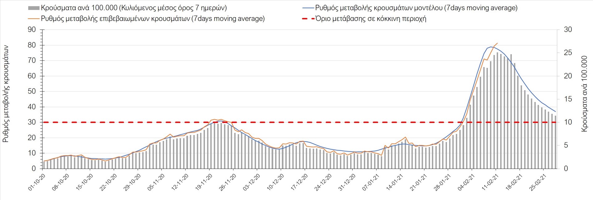 Σχήμα 39. Πορεία του ημερησίου αριθμού των κρουσμάτων (κυλιόμενος μέσος όρος 7 ημερών) στην ΘάσοΣυμπεράσματα:Η αύξηση που παρατηρείται πλέον στον αριθμό των ασθενών σε κρίσιμη κατάσταση (διασωληνομένοι σε ΜΕΘ), καθώς και ο αριθμός των θανάτων συνάδουν που παρατηρήθηκαν σήμερα συνάδουν με τις προσομοιώσεις του μοντέλου CORE για τον επόμενο μήνα, ενώ πλέον και ο αριθμός των νέων κρουσμάτων παραμένει ανησυχητικός, ιδιαίτερα για την Αττική, με δεδομένο και το χαμηλό αριθμό των τεστ ανίχνευσης που πραγματοποιήθηκαν χθες. Τα παραπάνω αποτελέσματα αποτυπώνονται και στο δείκτη θετικότητας. Σε πανελλαδικό επίπεδο ο κυλιόμενος εβδομαδιαίος μέσος όρος του δείκτη θετικότητας παρέμεινε στο 2,9% (η ημερήσια τιμή σήμερα είναι 2,6%) ενώ ο κυλιόμενος εβδομαδιαίος μέσος όρος του πραγματικού αριθμού αναπαραγωγής Rt (δηλαδή ο αριθμός των ατόμων που ένας φορέας μπορεί να επιμολύνει) είναι πλέον 1,27 (τιμές του Rt πάνω από τη μονάδα υποδηλώνουν καθαρή αύξηση της διασποράς του ιού στην κοινότητα). Οι τιμές αυτές δείχνουν ότι αν και καλώς εφαρμόσθηκε το γενικευμένο lockdown της 3ης Ιανουαρίου, έτσι ώστε να αποσβεσθούν όποιες αποκλίσεις στην εφαρμογή των μέτρων υπήρξαν κατά την περίοδο των εορτών, δημιουργώντας θετικές προοπτικές στο σταδιακό άνοιγμα της οικονομίας που ξεκίνησε από τη Δευτέρα 18 Ιανουαρίου, ιδιαίτερη προσοχή πρέπει να δοθεί διότι όπως είχαμε επισημάνει από το προ-προηγούμενο Σαββατοκύριακο, τα αποτελέσματα των τελευταίων ημερών, δείχνουν ότι σε πανελλαδικό επίπεδο υπάρχει συνολικά αύξηση, δημιουργώντας ανησυχία τόσο για την πορεία της πανδημίας, όσο και για την πραγματική εξάπλωση του στελέχους B.1.1.7. του SARS-CoV-2 στην κοινότητα. Αναμένουμε λοιπόν τα αποτελέσματα των επομένων ημερών, όπου ο αριθμός των τεστ ανίχνευσης θα παραμείνει στα συνήθη επίπεδα (άνω των 40.000 ανά ημέρα), και ελπίζουμε να συνεχίσει στα επίπεδα της τελευταίας εβδομάδας, δηλαδή άνω των 45.000, και να συνεχίσει να αυξάνει άμεσα, φτάνοντας τα 80.000-100.000 τεστ ημερησίως. Επιπλέον, με βάση τα δεδομένα αυτής της εβδομάδας, καλώς εφαρμόσθηκαν τα περιοριστικά μέτρα που ισχύουν από τις 6 Φεβρουαρίου, τα οποία ίσως χρειαστούν επιπλέον αναθεώρηση, με βάση την επιδημιολογική εικόνα που θα επικρατήσει, ενώ επίσης καλώς εφαρμόσθηκε το lockdown μέχρι τις 28 Φεβρουαρίου στην Αθήνα. Με τα μέχρι τώρα δεδομένα, τα μέτρα αυτά φαίνονται να είναι ικανά να αναχαιτίσουν προσωρινά την επέλαση ενός τρίτου κύματος, εν αναμονή και επιπλέον στοιχείων, τόσο για τη μεταδοτικότητα του στελέχους B.1.1.7. του SARS-CoV-2, όσο και της διασποράς του στην κοινότητα.Παρά την εφαρμογή οριζοντίων μέτρων ανάσχεσης της πανδημίας που εφαρμόσθηκαν από τα τέλη Οκτωβρίου, η πορεία της τελευταίας διαφοροποιείται από περιοχή σε περιοχή. Οι παραπάνω παρατηρήσεις τείνουν στο συμπέρασμα ότι η διαχείριση του υγειονομικού κινδύνου θα πρέπει να εξεταστεί σε τοπικό επίπεδο (όπως πολύ σωστά έγινε σήμερα με το lockdown στην Αθήνα και προηγουμένως στην Κοζάνη, από τη στιγμή που συνολικά στη χώρα φαίνεται να έχουμε ξεπεράσει την κορύφωση του συγκεκριμένου επιδημικού κύματος του Νοεμβρίου. Παρόλα αυτά, συνιστάται προσεκτική μελέτη των αποτελεσμάτων των επόμενων ημερών, λόγω του ανοίγματος των δημοτικών σχολείων και από αυτή την εβδομάδα και του λιανικού εμπορίου. Με βάση τη συνολική εικόνα που έχει διαμορφωθεί, έχουμε εντελώς διαφορετική κατανομή στο χάρτη