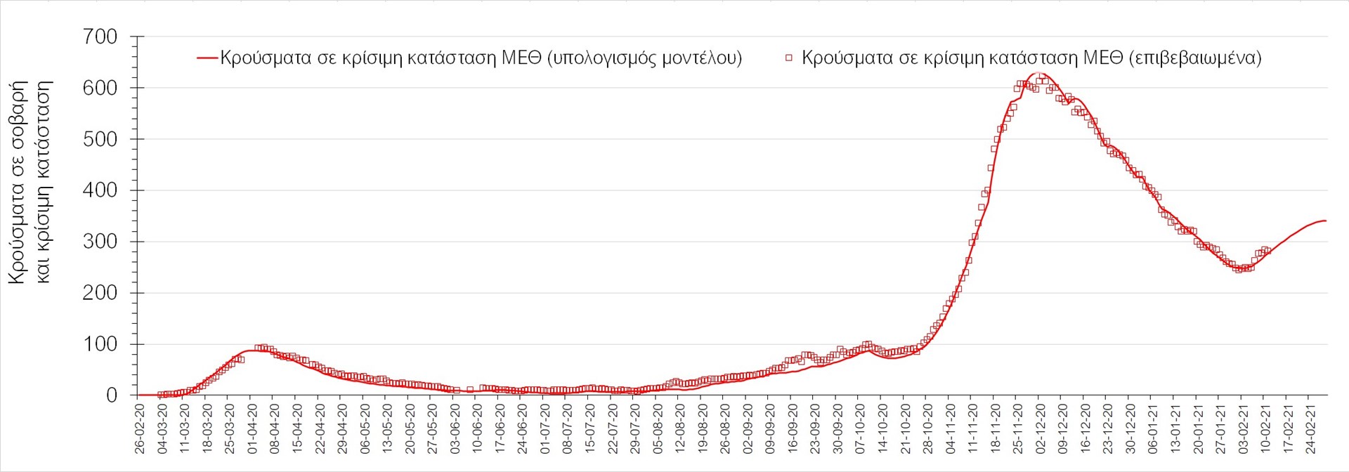 Σχήμα 1. Αριθμός κρουσμάτων σε κρίσιμη κατάσταση (ΜΕΘ) σύμφωνα με τα στοιχεία του ΕΟΔΥ και τις προβλέψεις της υπολογιστικής πλατφόρμας CORE.