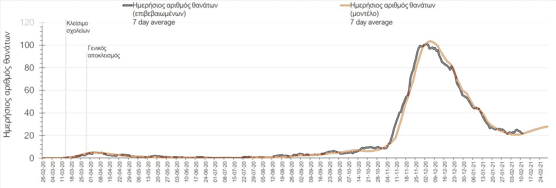 Σχήμα 2. Αριθμός θανάτων (κυλιόμενος μέσος όρος 7 ημερών) σύμφωνα με τα στοιχεία του ΕΟΔΥ και τις προβλέψεις της υπολογιστικής πλατφόρμας CORE.Και στις δύο περιπτώσεις φαίνεται ότι πλέον ξεπερνάμε τη φάση της αποκλιμάκωσης (βλέπε σχήματα 1 και 2) και εισερχόμαστε σε νέα ανοδική τροχιά. Η πορεία της μέσης εβδομαδιαίας τιμής των κρουσμάτων, καθώς και του κυλιόμενου μέσου όρου 7 ημερών του αριθμού των κρουσμάτων ανά 100.000 πληθυσμού, όπως έχουν καταγραφεί από τον ΕΟΔΥ και η αναμενόμενη πορεία τους όπως προδιαγράφεται από την υπολογιστική πλατφόρμα CORE για την Ελληνική επικράτεια μέχρι το τέλος του Ιανουαρίου, αποτυπώνονται στο Σχήμα 3. Η ανάλυσή μας έχει επικαιροποιηθεί με βάση την απόφαση εφαρμογής αυστηρού lockdown από την Κυριακή 3 Ιανουαρίου μέχρι και τις 17 Ιανουαρίου. Στις 11 Ιανουαρίου λάβαμε υπόψη το άνοιγμα της πρωτοβάθμιας εκπαίδευσης, ενώ το άνοιγμα των βιβλιοπωλείων, κομμωτηρίων, λιανικού εμπορίου και των εμπορικών καταστημάτων από τη Δευτέρα 18/1, ενώ επιπλέον, έχει ληφθεί υπόψη το άνοιγμα τις δευτεροβάθμιας εκπαίδευσης από τη Δευτέρα 1 Φεβρουαρίου στις κίτρινες περιοχές. Στις κόκκινες περιοχές, από τη Δευτέρα 1 Φεβρουαρίου έχει γίνει άνοιγμα μόνο των Γυμνασίων (και συνεχίζεται το καθεστώς τηλε-εκπαίδευση για τα Λύκεια), στις οποίες επίσης, η λειτουργία του λιανεμπορίου θα πραγματοποιείται με τη μέθοδο click away, και η λειτουργία καταστημάτων ένδυσης, υπόδησης, βιβλιοπωλείων, κομμωτηρίων και καταστημάτων προσωπικής περιποίησης με προκαθορισμένο ραντεβού (click-in-a-shop) και με 1 άτομο ανά 25 τ.μ. Έχουν ληφθεί υπόψιν τα περιοριστικά μέτρα που ανακοινώθηκαν στις 5 Φεβρουαρίου) για Αθήνα, Θεσσαλονίκη, Πάτρα, Χαλκίδα και Χαλκιδική και που τέθηκαν σε ισχύ από το Σάββατο 6 Φεβρουαρίου και μέχρι τη Δευτέρα 15 Φεβρουαρίου, ενώ επιπλέον για την Αθήνα και στο βαθμό που αυτή επηρεάζει όλη την υπόλοιπη Ελλάδα, το αυστηρό lock down που ανακοινώθηκε, με εφαρμογή από την Πέμπτη 11/2 έως και τις 28/2.Όπως φαίνεται από το διάγραμμα, από τις 8 Ιανουαρίου έχουμε μια αύξηση κρουσμάτων μέχρι τις 11 Ιανουαρίου η οποία οφείλεται στη μείωση της περιστολής που σημειώθηκε στις γιορτές. Από τις 11 μέχρι τις 18 Ιανουαρίου προβλεπόταν μια μείωση κρουσμάτων λόγω της εφαρμογής του lockdown και η οποία όντως παρατηρήθηκε. Εντούτοις, όπως είχαμε προβλέψει, από τις 23 Ιανουαρίου και έπειτα διαφαίνεται αύξηση στον κυλιόμενο μέσο όρο των κρουσμάτων. Η εφαρμογή των περιοριστικών μέτρων, σε συνδυασμό με την επικρατούσα μετεωρολογία πρόκειται να επιφέρει μια σταθεροποίηση ή και ελαφρά μείωση των κρουσμάτων τις επόμενες ημέρες. Παρ’ολ’αυτά, μετά από τις 17/2 προβλέπεται μια περαιτέρω αύξηση των κρουσμάτων, η οποία αναμένουμε να καμφθεί τις επόμενες ημέρες, ως αποτέλεσμα των μέτρων που ελήφθησαν από την προηγουμένη εβδομάδα.