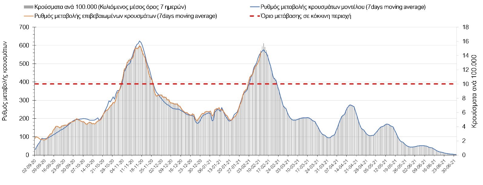 Σχήμα 3. Πορεία του ημερησίου αριθμού των κρουσμάτων (κυλιόμενος μέσος όρος 7 ημερών) στην Ελληνική επικράτειαΤο ίδιο σενάριο μέτρων, έχει ληφθεί υπόψη στα αποτελέσματα του μοντέλου που παρουσιάζονται σε επιμέρους περιοχές της επικράτειας.
