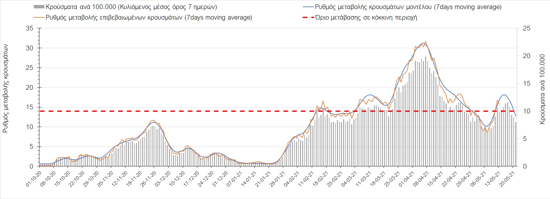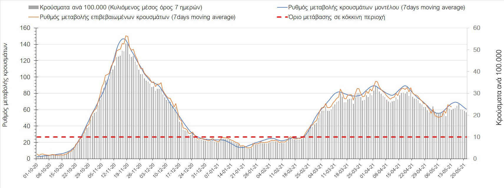 Σχήμα 19. Πορεία του ημερησίου αριθμού των κρουσμάτων (κυλιόμενος μέσος όρος 7 ημερών) στην ΚορινθίαΣτην Αιτωλοακαρνανία (Σχήμα 20) με 127 κρούσματα παρατηρείται ίδιος αριθμός κρουσμάτων σε σχέση με προχθές (127 κρούσματα) (Σχήμα 20), και ενώ έχει ήδη περάσει τρεις κορυφώσεις της επιδημικής καμπύλης, η περιοχή διανύει μια τέταρτη, η οποία διατηρεί την Αιτωλοακαρνανία πάνω από το όριο της κόκκινης περιοχής. Με βάση τα τωρινά αποτελέσματα, η Αιτωλοακαρνανία είναι η περιφέρεια με την πιο έντονα ανοδική τάση, παρόλα αυτά, αναμένεται να ξεκινήσει αποκλιμάκωση στις επόμενες 1-2 ημέρες. Όπως έχουμε εκφράσει και παλιότερα, σε όλες τις επαρχιακές περιφερειακές ενότητες παρατηρούνται διακυμάνσεις οι οποίες ενίοτε αντιστρέφουν γρήγορα την καθοδική πορεία και δυστυχώς οι φόβοι που είχαμε εκφράσει παρατηρώντας και προηγούμενες κυμάνσεις, επιβεβαιώθηκαν ξανά, και η περιοχή την διανύει ένα επιπλέον ανοδικό κύμα (συγκεκριμένα το 4ο μέσα στο 2021), το οποίο μάλιστα είναι και το υψηλότερο από όλα. Επειδή αυτές οι διακυμάνσεις παρατηρούνται περισσότερο σε περιοχές της επαρχίας, παρά στα 2 μεγάλα αστικά κέντρα, θα ήταν χρήσιμο να ανακοινώνονται (ή τουλάχιστον να κοινοποιούνται στην ερευνητική ομάδα HERACLES) τα στοιχεία του ημερήσιου αριθμού των τεστ τα οποία διενεργούνται από τον ΕΟΔΥ ανά περιοχή, έτσι ώστε να μπορούμε να διαπιστώνουμε νωρίς εάν αυτές οι διακυμάνσεις οφείλονται σε γεγονότα υπερμετάδοσης (που σχετίζονται με δραστηριότητες που δε συνάδουν με την τήρηση των μέτρων) ή με τη διακύμανση του αριθμού των τεστ ανίχνευσης σε ημερήσια βάση. Στη συγκεκριμένη περίπτωση, οι διακυμάνσεις δεν μπορούν να εξηγηθούν ούτε από τα ισχύοντα μέτρα, ούτε από τη βελτίωση του καιρού, παρά μόνο από φαινόμενα αδικαιολόγητης συρροής, γι’ αυτό και είναι αναγκαίες, τόσο η αύξηση της επιδημιολογικής επιτήρησης, όσο και ο έλεγχος συμμόρφωσης με τα μέτρα αναχαίτισης της επιδημίας. Στην Εύβοια, με 35 κρούσματα παρατηρείται μειωμένος αριθμός κρουσμάτων σε σχέση με προχθές (Σχήμα 21). Η συνολική πορεία της καμπύλης νέων κρουσμάτων ενώ είχε επανέλθει σε πτωτική όπως είχαμε αρχικά προβλέψει, υφίσταται διακυμάνσεις. Λόγω αυτών των διακυμάνσεων, η Εύβοια προβλέπεται να παραμείνει «κόκκινη» μέχρι το πρώτο 10ήμερο του Μαΐου. Μείωση στον αριθμό των κρουσμάτων είχαμε στη Βοιωτία με 31 κρούσματα (Σχήμα 22), στην οποία επίσης είχε διαμορφωθεί μια τάση σταθεροποίησης την προηγούμενη εβδομάδα, η οποία όμως ακολουθήθηκε από ανοδική τάση που έχει αρχίσει να κάμπτεται. Η εξέλιξη της πανδημίας στη Βοιωτία, σημαίνει ότι η περιφερειακή ενότητα θα παραμείνει κόκκινη μετά και τα μέσα Μαΐου. Αυξημένος σε σχέση με προχθές ήταν ο αριθμός των κρουσμάτων και στη Φθιώτιδα με 25 κρούσματα (Σχήμα 24), η οποία έχει περιέλθει σε ανοδική πορεία που την έχουν επαναφέρει πάνω από το όριο του να χαρακτηριστεί κόκκινη. Μείωση του αριθμού κρουσμάτων σε σχέση με τις προηγούμενες ημέρες παρατηρήθηκε στην Ευρυτανία, καθώς εντοπίστηκε 1 κρούσμα (Σχήμα 25), και παρά τις συνεχείς διακυμάνσεις, πλέον η περιοχή μόλις πέρασε ξανά το όριο του αποχαρακτηρισμού της από κόκκινη. Αύξηση παρατηρήθηκε στην Φωκίδα με 6 κρούσματα (Σχήμα 23), στην οποία επίσης έχει διαμορφωθεί ανοδική πορεία.