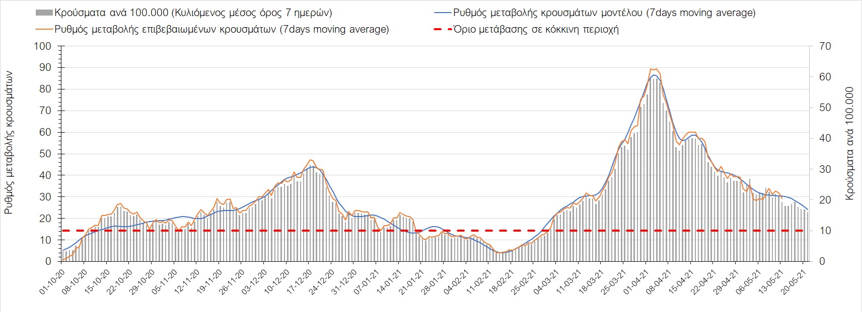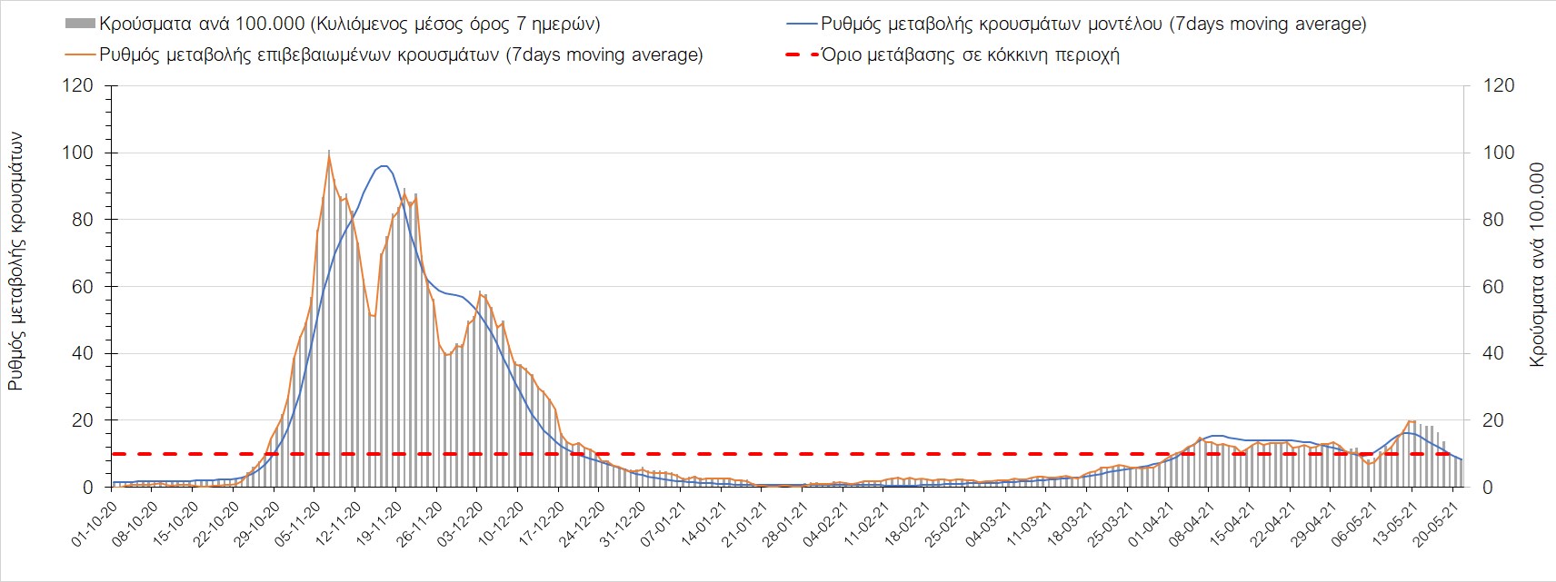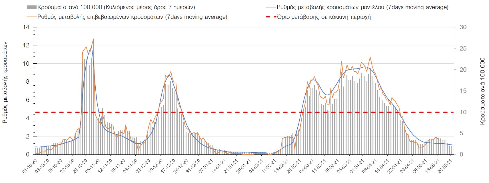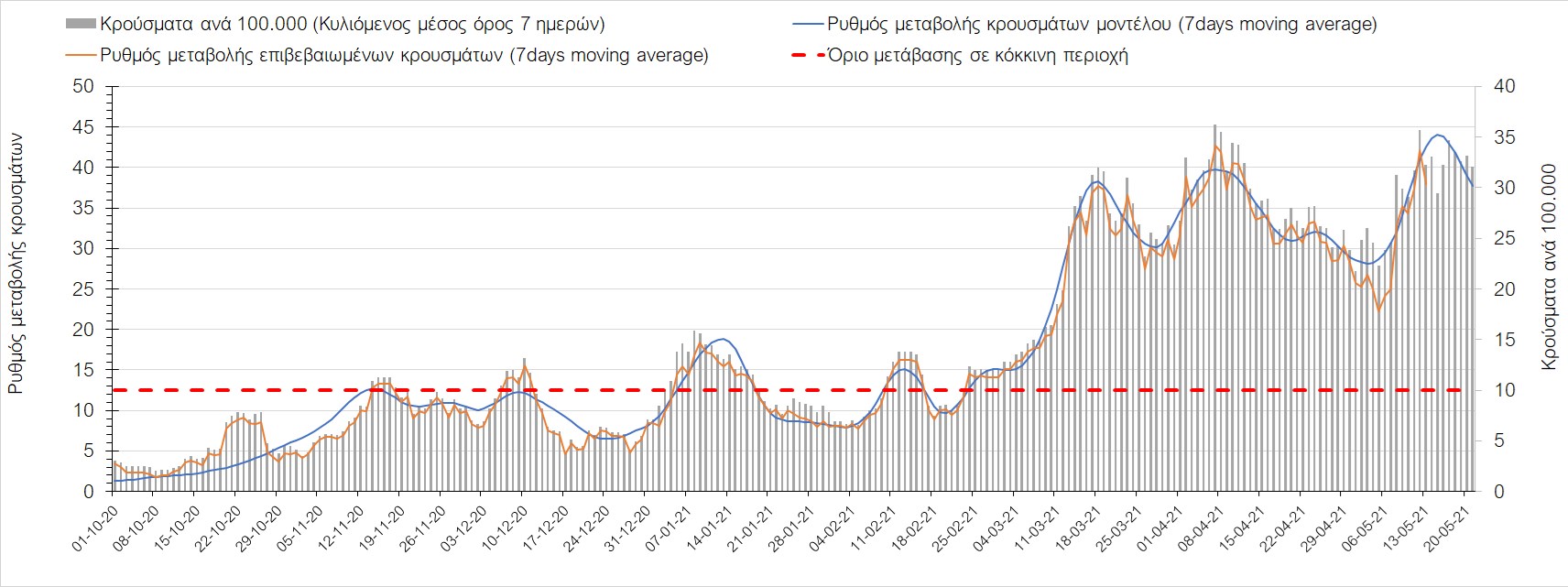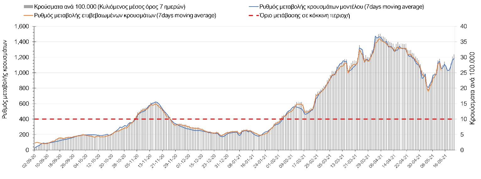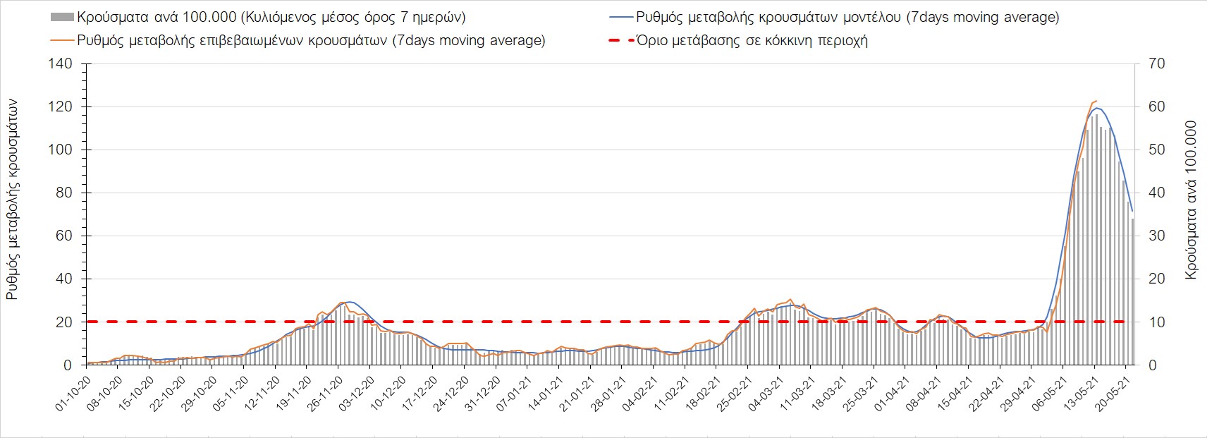 Σχήμα 52. Πορεία του ημερησίου αριθμού των κρουσμάτων (κυλιόμενος μέσος όρος 7 ημερών) στην Θάσο Συμπεράσματα:Με βάση τα αποτελέσματα της Πέμπτης είχαμε μείωση των ασθενών σε κρίσιμη κατάσταση (διασωληνωμένοι σε ΜΕΘ) σε σχέση με προχθές, και συνεχίζει η συνολικά αργή αποκλιμάκωση, η οποία εκφράζεται και στον αριθμό των θανάτων. Οι προβλέψεις αυτές συνάδουν με τις προσομοιώσεις του μοντέλου CORE, όπως και ο αριθμός των κρουσμάτων, μετά και τις επικαιροποιημένες προβλέψεις προ 2 μηνών, όπου ελήφθη υπόψιν η μεγαλύτερη διασπορά των μεταλλαγμένων και ταχύτερα μεταδιδόμενων στελεχών. Σε πανελλαδικό επίπεδο ο κυλιόμενος εβδομαδιαίος μέσος όρος του δείκτη θετικότητας διαμορφώθηκε στο 4,7% (η ημερήσια τιμή είναι 3,5%) ενώ ο κυλιόμενος εβδομαδιαίος μέσος όρος του πραγματικού αριθμού αναπαραγωγής Rt (δηλαδή ο αριθμός των ατόμων που ένας φορέας μπορεί να επιμολύνει) διαμορφώθηκε στο 1,12 (τιμές του Rt πάνω από τη μονάδα υποδηλώνουν καθαρή αύξηση της διασποράς του ιού στην κοινότητα). Η ταυτόχρονη αύξηση και των δύο δεικτών, που παρατηρήθηκε τις προηγούμενες ημέρες, υποδηλώνει την συνολικά αυξητική πορεία στο συνολικό αριθμό κρουσμάτων στη χώρα από την Πέμπτη του Πάσχα και έπειτα. Με βάση τα αποτελέσματα, βλέπουμε ανοδικές τάσεις πλέον και σε επαρχιακές πόλεις της Βορείου Ελλάδας, οι οποίες χρονικά συνάδουν με αύξηση επαφών τις ημέρες του Πάσχα. Με βάση τις τάσεις που διαμορφώνονται, είναι σημαντικό να διατηρηθεί ο υψηλός αριθμός των τεστ ανίχνευσης, έτσι ώστε να μπορούμε να έχουμε καλή εικόνα της διασποράς της πανδημίας στις επόμενες ημέρες, όπου συνδυάζονται με τα πιο πρόσφατα ανοίγματα (εστίαση, άνοιγμα Δημοτικών και Γυμνασίων). Όπως ήδη αναφέρθηκε, αναμένεται στις επόμενες ημέρες μια προσωρινή πτώση της ταχύτητας αύξησης, η οποία θα οδηγήσει σε ένα μέγιστο περί τα 2600 κρούσματα/ημέρα (κυλιόμενος εβδομαδιαίος μέσος όρος) στο τέλος Μαΐου. Η ήπια αναχαίτιση του 3ου κύματος που παρατηρούνταν μέχρι και τις ημέρες του Πάσχα, οφείλονταν σε ένα συνδυασμό παραμέτρων, οι οποίες είναι η συνέχιση του lockdown, η χρήση των self-test, η αύξηση του αριθμού των τεστ από τον ΕΟΔΥ, γεγονός που συντελεί στην απομάκρυνση από τις αλυσίδες μετάδοσης των ασυμπτωματικών και προσυμπτωματικών φορέων, η προοδευτική βελτίωση του καιρού και σε μικρότερο βαθμό η πρόοδος των εμβολιασμών, η σημασία των οποίων στον έλεγχο της πανδημίας θα αρχίσει να είναι πιο εμφανής από το τέλος του επόμενου μήνα, ιδιαίτερα λαμβάνοντας υπόψιν τη σημαντική αύξηση του ρυθμού εμβολιασμού, με περίπου 110.000 εμβολιασμούς ημερησίως. Όμως, με δεδομένο το άνοιγμα του λιανικού εμπορίου και όλων των εκπαιδευτικών βαθμίδων πλέον, είναι ακόμα πιο σημαντική η τήρηση των μέτρων, ενώ ύψιστης σημασίας στις επόμενες εβδομάδες θα αποδειχθεί η ορθή και μαζική εφαρμογή των self-test, με ταυτόχρονη αύξηση της ιχνηλασίας των επαφών των ανιχνευθέντων ως θετικοί και καραντίνα 14 ημερών για τους συμπολίτες μας που θα επιβεβαιωθεί ότι είναι θετικοί στην μόλυνση με SARS-CoV-2 ακόμη και αν είναι ασυμπτωματικοί. Δεδομένου ότι τελικά ο αριθμός των self-test που πραγματοποιούνται ημερησίως δεν έχει φθάσει στα επιθυμητά νούμερα στα οποία βασίζονται οι προβολές που παρουσιάζονται στην παρούσα τεχνική έκθεση μέχρι τις 21 Μαΐου, μόλις έχουμε νεότερα για τον ακριβή αριθμό τους και τη συχνότητα εκτέλεσης αυτών, θα επικαιροποιήσουμε τις προβλέψεις μ