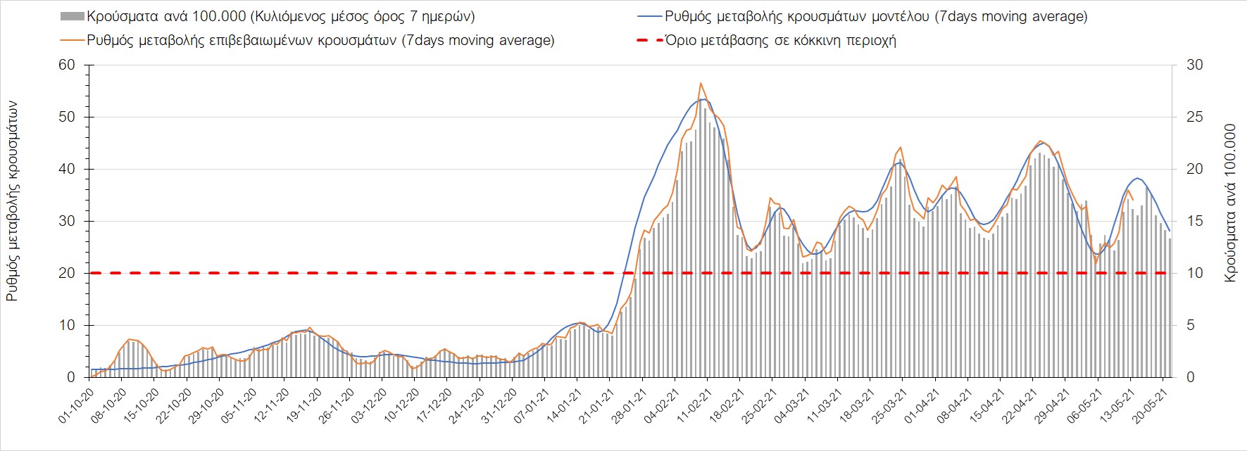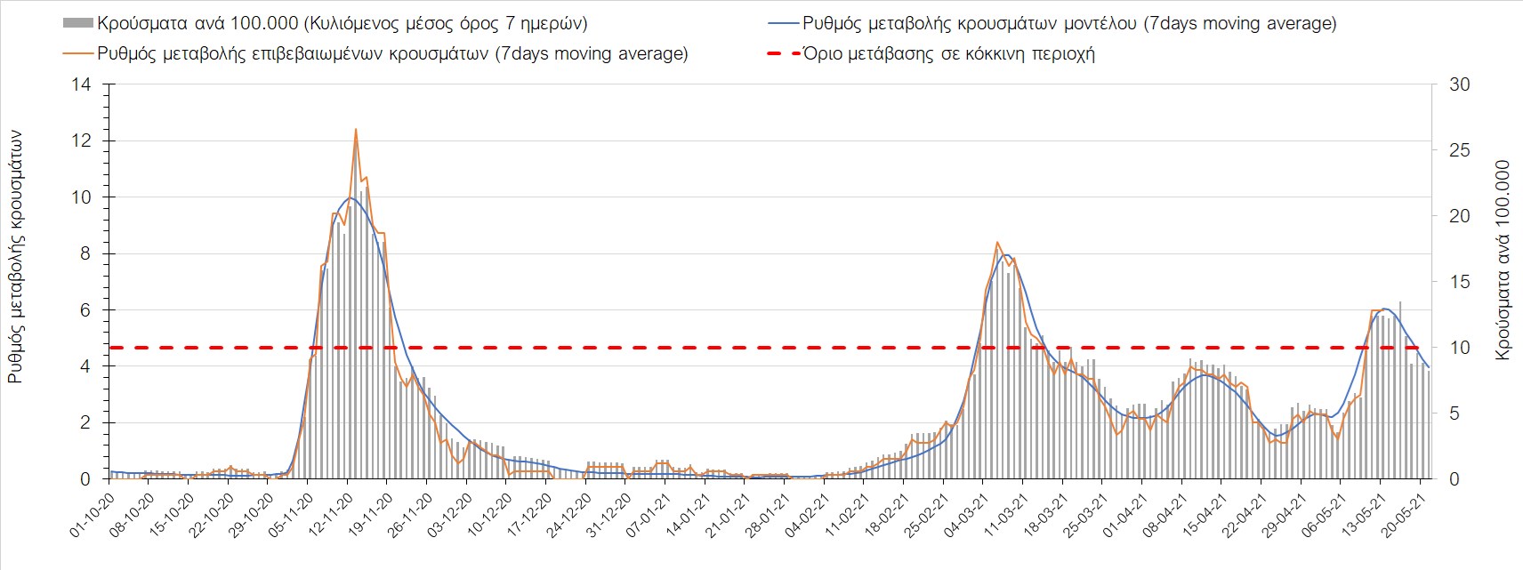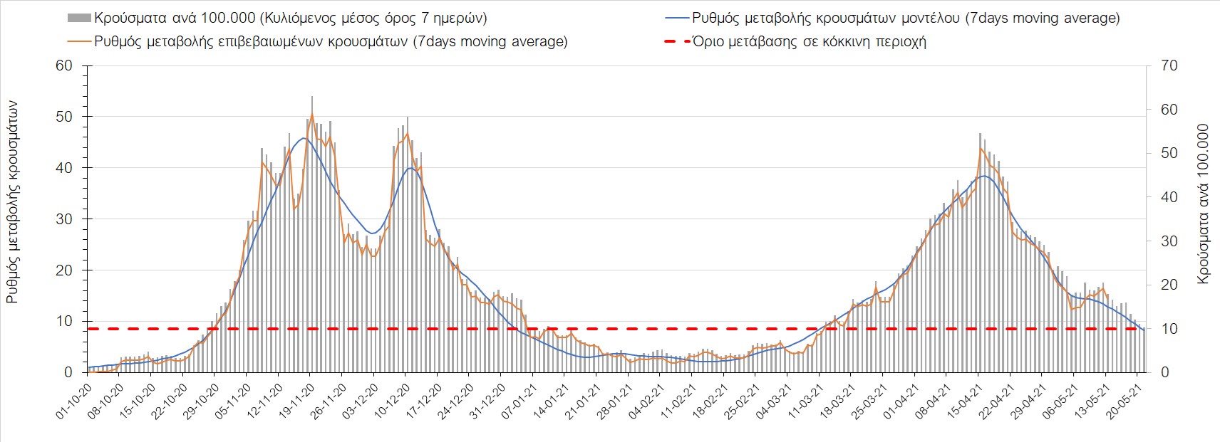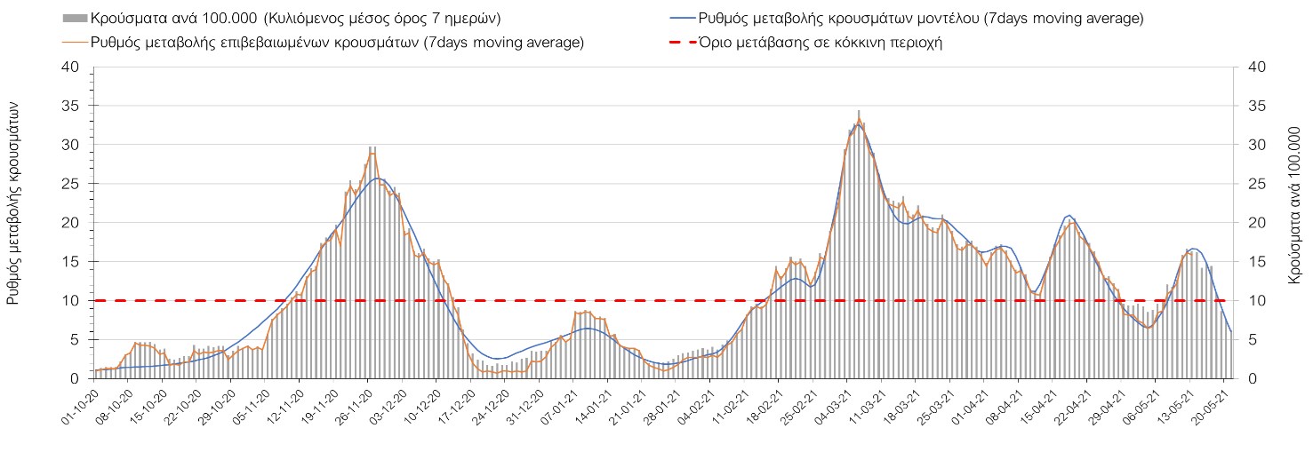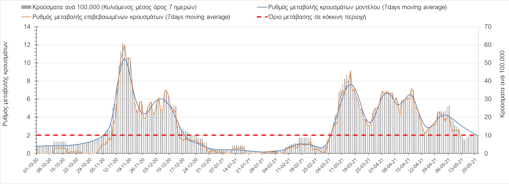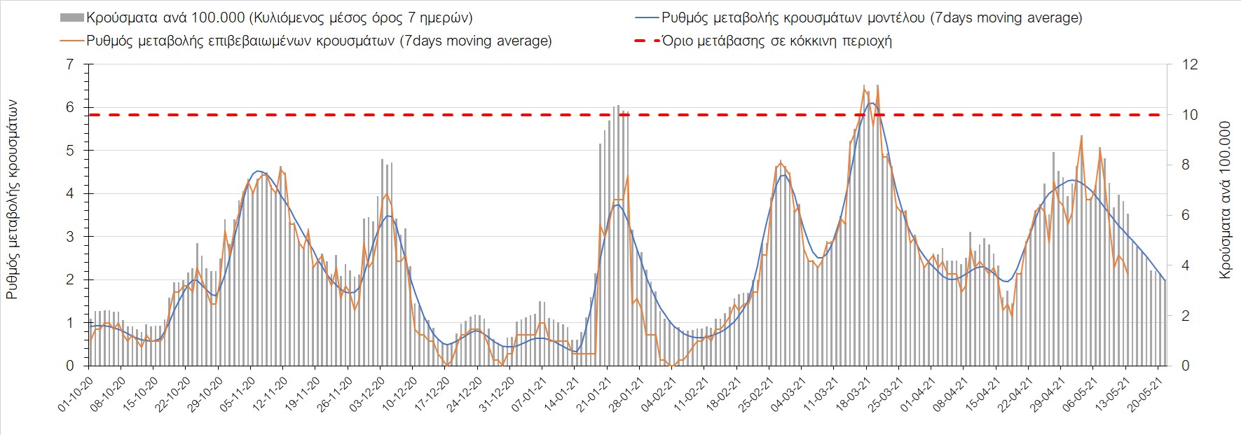 Σχήμα 52. Πορεία του ημερησίου αριθμού των κρουσμάτων (κυλιόμενος μέσος όρος 7 ημερών) στην Θάσο Συμπεράσματα:Με βάση τα αποτελέσματα της Πέμπτης είχαμε μείωση των ασθενών σε κρίσιμη κατάσταση (διασωληνωμένοι σε ΜΕΘ) σε σχέση με προχθές, και συνεχίζει η συνολικά αργή αποκλιμάκωση, η οποία εκφράζεται και στον αριθμό των θανάτων. Οι προβλέψεις αυτές συνάδουν με τις προσομοιώσεις του μοντέλου CORE, όπως και ο αριθμός των κρουσμάτων, μετά και τις επικαιροποιημένες προβλέψεις προ 2 μηνών, όπου ελήφθη υπόψιν η μεγαλύτερη διασπορά των μεταλλαγμένων και ταχύτερα μεταδιδόμενων στελεχών. Σε πανελλαδικό επίπεδο ο κυλιόμενος εβδομαδιαίος μέσος όρος του δείκτη θετικότητας διαμορφώθηκε στο 4,7% (η ημερήσια τιμή είναι 3,5%) ενώ ο κυλιόμενος εβδομαδιαίος μέσος όρος του πραγματικού αριθμού αναπαραγωγής Rt (δηλαδή ο αριθμός των ατόμων που ένας φορέας μπορεί να επιμολύνει) διαμορφώθηκε στο 1,12 (τιμές του Rt πάνω από τη μονάδα υποδηλώνουν καθαρή αύξηση της διασποράς του ιού στην κοινότητα). Η ταυτόχρονη αύξηση και των δύο δεικτών, που παρατηρήθηκε τις προηγούμενες ημέρες, υποδηλώνει την συνολικά αυξητική πορεία στο συνολικό αριθμό κρουσμάτων στη χώρα από την Πέμπτη του Πάσχα και έπειτα. Με βάση τα αποτελέσματα, βλέπουμε ανοδικές τάσεις πλέον και σε επαρχιακές πόλεις της Βορείου Ελλάδας, οι οποίες χρονικά συνάδουν με αύξηση επαφών τις ημέρες του Πάσχα. Με βάση τις τάσεις που διαμορφώνονται, είναι σημαντικό να διατηρηθεί ο υψηλός αριθμός των τεστ ανίχνευσης, έτσι ώστε να μπορούμε να έχουμε καλή εικόνα της διασποράς της πανδημίας στις επόμενες ημέρες, όπου συνδυάζονται με τα πιο πρόσφατα ανοίγματα (εστίαση, άνοιγμα Δημοτικών και Γυμνασίων). Όπως ήδη αναφέρθηκε, αναμένεται στις επόμενες ημέρες μια προσωρινή πτώση της ταχύτητας αύξησης, η οποία θα οδηγήσει σε ένα μέγιστο περί τα 2600 κρούσματα/ημέρα (κυλιόμενος εβδομαδιαίος μέσος όρος) στο τέλος Μαΐου. Η ήπια αναχαίτιση του 3ου κύματος που παρατηρούνταν μέχρι και τις ημέρες του Πάσχα, οφείλονταν σε ένα συνδυασμό παραμέτρων, οι οποίες είναι η συνέχιση του lockdown, η χρήση των self-test, η αύξηση του αριθμού των τεστ από τον ΕΟΔΥ, γεγονός που συντελεί στην απομάκρυνση από τις αλυσίδες μετάδοσης των ασυμπτωματικών και προσυμπτωματικών φορέων, η προοδευτική βελτίωση του καιρού και σε μικρότερο βαθμό η πρόοδος των εμβολιασμών, η σημασία των οποίων στον έλεγχο της πανδημίας θα αρχίσει να είναι πιο εμφανής από το τέλος του επόμενου μήνα, ιδιαίτερα λαμβάνοντας υπόψιν τη σημαντική αύξηση του ρυθμού εμβολιασμού, με περίπου 110.000 εμβολιασμούς ημερησίως. Όμως, με δεδομένο το άνοιγμα του λιανικού εμπορίου και όλων των εκπαιδευτικών βαθμίδων πλέον, είναι ακόμα πιο σημαντική η τήρηση των μέτρων, ενώ ύψιστης σημασίας στις επόμενες εβδομάδες θα αποδειχθεί η ορθή και μαζική εφαρμογή των self-test, με ταυτόχρονη αύξηση της ιχνηλασίας των επαφών των ανιχνευθέντων ως θετικοί και καραντίνα 14 ημερών για τους συμπολίτες μας που θα επιβεβαιωθεί ότι είναι θετικοί στην μόλυνση με SARS-CoV-2 ακόμη και αν είναι ασυμπτωματικοί. Δεδομένου ότι τελικά ο αριθμός των self-test που πραγματοποιούνται ημερησίως δεν έχει φθάσει στα επιθυμητά νούμερα στα οποία βασίζονται οι προβολές που παρουσιάζονται στην παρούσα τεχνική έκθεση μέχρι τις 21 Μαΐου, μόλις έχουμε νεότερα για τον ακριβή αριθμό τους και τη συχνότητα εκτέλεσης αυτών, θα επικαιροποιήσουμε τις προβλέψεις μ