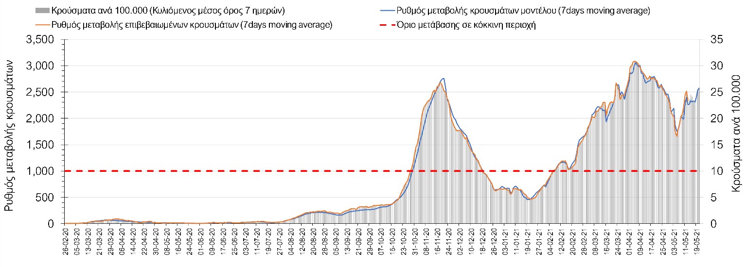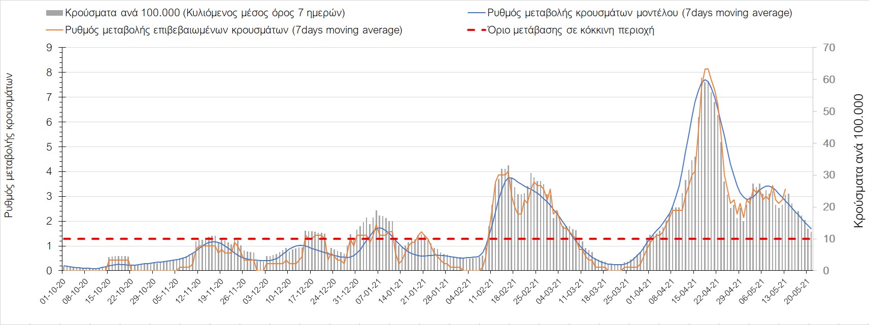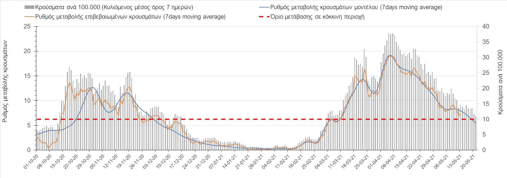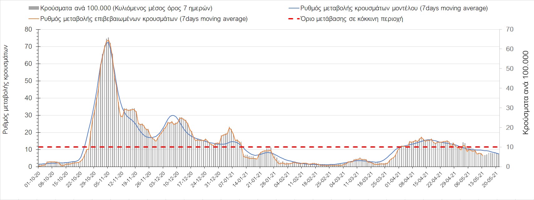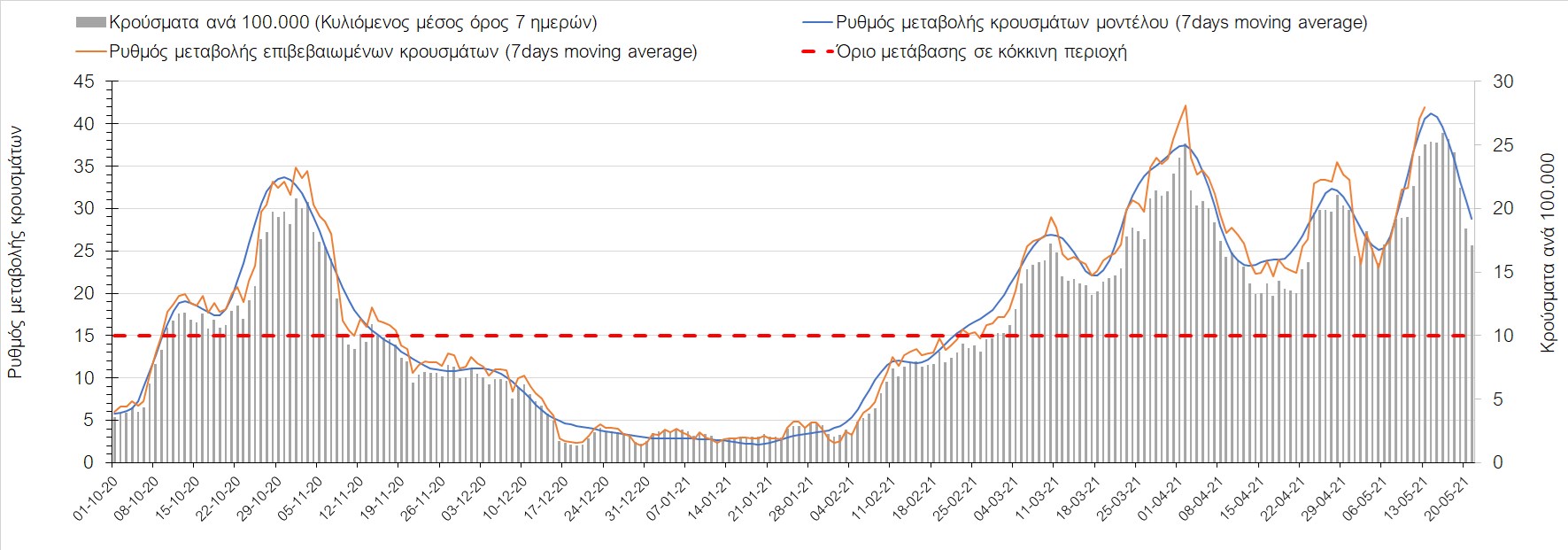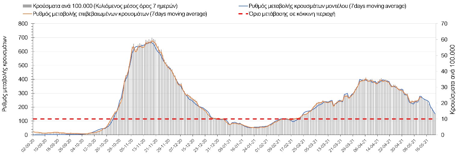 Σχήμα 52. Πορεία του ημερησίου αριθμού των κρουσμάτων (κυλιόμενος μέσος όρος 7 ημερών) στην Θάσο Συμπεράσματα:Με βάση τα αποτελέσματα της Πέμπτης είχαμε μείωση των ασθενών σε κρίσιμη κατάσταση (διασωληνωμένοι σε ΜΕΘ) σε σχέση με προχθές, και συνεχίζει η συνολικά αργή αποκλιμάκωση, η οποία εκφράζεται και στον αριθμό των θανάτων. Οι προβλέψεις αυτές συνάδουν με τις προσομοιώσεις του μοντέλου CORE, όπως και ο αριθμός των κρουσμάτων, μετά και τις επικαιροποιημένες προβλέψεις προ 2 μηνών, όπου ελήφθη υπόψιν η μεγαλύτερη διασπορά των μεταλλαγμένων και ταχύτερα μεταδιδόμενων στελεχών. Σε πανελλαδικό επίπεδο ο κυλιόμενος εβδομαδιαίος μέσος όρος του δείκτη θετικότητας διαμορφώθηκε στο 4,7% (η ημερήσια τιμή είναι 3,5%) ενώ ο κυλιόμενος εβδομαδιαίος μέσος όρος του πραγματικού αριθμού αναπαραγωγής Rt (δηλαδή ο αριθμός των ατόμων που ένας φορέας μπορεί να επιμολύνει) διαμορφώθηκε στο 1,12 (τιμές του Rt πάνω από τη μονάδα υποδηλώνουν καθαρή αύξηση της διασποράς του ιού στην κοινότητα). Η ταυτόχρονη αύξηση και των δύο δεικτών, που παρατηρήθηκε τις προηγούμενες ημέρες, υποδηλώνει την συνολικά αυξητική πορεία στο συνολικό αριθμό κρουσμάτων στη χώρα από την Πέμπτη του Πάσχα και έπειτα. Με βάση τα αποτελέσματα, βλέπουμε ανοδικές τάσεις πλέον και σε επαρχιακές πόλεις της Βορείου Ελλάδας, οι οποίες χρονικά συνάδουν με αύξηση επαφών τις ημέρες του Πάσχα. Με βάση τις τάσεις που διαμορφώνονται, είναι σημαντικό να διατηρηθεί ο υψηλός αριθμός των τεστ ανίχνευσης, έτσι ώστε να μπορούμε να έχουμε καλή εικόνα της διασποράς της πανδημίας στις επόμενες ημέρες, όπου συνδυάζονται με τα πιο πρόσφατα ανοίγματα (εστίαση, άνοιγμα Δημοτικών και Γυμνασίων). Όπως ήδη αναφέρθηκε, αναμένεται στις επόμενες ημέρες μια προσωρινή πτώση της ταχύτητας αύξησης, η οποία θα οδηγήσει σε ένα μέγιστο περί τα 2600 κρούσματα/ημέρα (κυλιόμενος εβδομαδιαίος μέσος όρος) στο τέλος Μαΐου. Η ήπια αναχαίτιση του 3ου κύματος που παρατηρούνταν μέχρι και τις ημέρες του Πάσχα, οφείλονταν σε ένα συνδυασμό παραμέτρων, οι οποίες είναι η συνέχιση του lockdown, η χρήση των self-test, η αύξηση του αριθμού των τεστ από τον ΕΟΔΥ, γεγονός που συντελεί στην απομάκρυνση από τις αλυσίδες μετάδοσης των ασυμπτωματικών και προσυμπτωματικών φορέων, η προοδευτική βελτίωση του καιρού και σε μικρότερο βαθμό η πρόοδος των εμβολιασμών, η σημασία των οποίων στον έλεγχο της πανδημίας θα αρχίσει να είναι πιο εμφανής από το τέλος του επόμενου μήνα, ιδιαίτερα λαμβάνοντας υπόψιν τη σημαντική αύξηση του ρυθμού εμβολιασμού, με περίπου 110.000 εμβολιασμούς ημερησίως. Όμως, με δεδομένο το άνοιγμα του λιανικού εμπορίου και όλων των εκπαιδευτικών βαθμίδων πλέον, είναι ακόμα πιο σημαντική η τήρηση των μέτρων, ενώ ύψιστης σημασίας στις επόμενες εβδομάδες θα αποδειχθεί η ορθή και μαζική εφαρμογή των self-test, με ταυτόχρονη αύξηση της ιχνηλασίας των επαφών των ανιχνευθέντων ως θετικοί και καραντίνα 14 ημερών για τους συμπολίτες μας που θα επιβεβαιωθεί ότι είναι θετικοί στην μόλυνση με SARS-CoV-2 ακόμη και αν είναι ασυμπτωματικοί. Δεδομένου ότι τελικά ο αριθμός των self-test που πραγματοποιούνται ημερησίως δεν έχει φθάσει στα επιθυμητά νούμερα στα οποία βασίζονται οι προβολές που παρουσιάζονται στην παρούσα τεχνική έκθεση μέχρι τις 21 Μαΐου, μόλις έχουμε νεότερα για τον ακριβή αριθμό τους και τη συχνότητα εκτέλεσης αυτών, θα επικαιροποιήσουμε τις προβλέψεις μ
