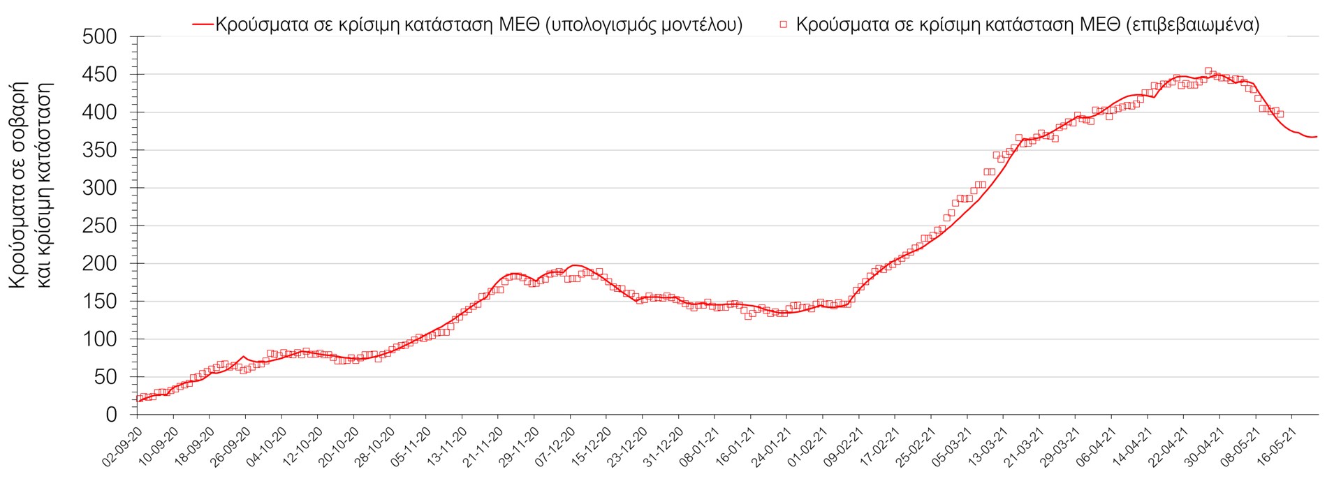 Ακολουθεί η ανάλυση του καθηγητή Δημοσθένη Σαρηγιάννη και του Δρ. Σπύρου Καρακίτσιου για την εξέλιξη της πανδημίας στη χώρα μας: Σύμφωνα με τα στοιχεία του ΕΟΔΥ, ο αριθμός κρουσμάτων της Πέμπτης ανέρχεται στα 2167 νέα κρούσματα, με τα αποτελέσματα να συνάδουν με τις προβλέψεις της υπολογιστικής πλατφόρμας CORE (n=2210). Ο αριθμός των τεστ που πραγματοποιήθηκαν ήταν 62315 και σε συνδυασμό με τον αριθμό των κρουσμάτων, ο δείκτης θετικότητας διαμορφώθηκε στο 3,5%. Η πραγματοποίηση αριθμού τεστ σε επίπεδα άνω των 50.000 την ημέρα (όπως και πραγματοποιείται τις τελευταίες ημέρες), συντελεί στο να εξάγουμε πιο ασφαλή συμπεράσματα σχετικά με την πορεία της πανδημίας, αλλά και να εντοπίζονται περισσότεροι ασυμπτωματικοί και προσυμπτωματικοί, συντελώντας στον περιορισμό της πανδημίας. Γενικά όμως θα πρέπει να αυξηθεί κι άλλο ο αριθμός των τεστ ανίχνευσης του SARS-CoV-2 χρησιμοποιώντας τα rapid test και τα self test για να καταπολεμηθεί η δυναμική αύξησης της διασποράς στις περιοχές όπου μια τέτοια αύξηση διαφαίνεται από τα μέχρι τώρα δεδομένα και την υπολογιστική πλατφόρμα CORE. Ο αριθμός ημερήσιων θανάτων (55) που καταγράφηκε είναι χαμηλότερος σε σχέση με προχθές (70) και όπως είχαμε προβλέψει από την προηγούμενη εβδομάδα, ο κυλιόμενος εβδομαδιαίος μέσος όρος που την Πέμπτη είναι 60 έχει ξεκινήσει ήπια αποκλιμάκωση σε συνδυασμό με την πτωτική πορεία του αριθμού των κρουσμάτων.Όσον αφορά στους ασθενείς σε κρίσιμη κατάσταση (διασωληνωμένοι σε ΜΕΘ), ο αριθμός τους μειώθηκε σημαντικά σε σχέση με προχθές (683 από 707). Παρά τις παρατηρούμενες διακυμάνσεις, διαφαίνεται να έχει ξεκινήσει η αποκλιμάκωση με βάση την επικαιροποιημένη πρόβλεψη (αυτό βέβαια με την παραδοχή ότι θα συνεχίσουν να τηρούνται τα ισχύοντα μέτρα, συμπεριλαμβανομένων των προβλεπόμενων self–test και ανοίγματα δραστηριοτήτων υψηλού συγχρωτισμού, όπως τα mall και η εστίαση θα γίνουν με την κατάλληλη προετοιμασία), η οποία όμως είναι αργή και έχει διακυμάνσεις. Αξίζει να σημειωθεί ότι ο αριθμός των ασθενών σε κρίσιμη κατάσταση όπως και των θανάτων είναι αναλογικά χαμηλότερος σε σχέση με τα αντίστοιχα μεγέθη στο δεύτερο κύμα, τόσο λόγω των εμβολιασμών ευπαθών ομάδων, όσο και του υψηλότερου αριθμού τεστ ανίχνευσης, που συντελεί στον εντοπισμό περισσότερων ασυμπτωματικών ή ήπια συμπτωματικών κρουσμάτων. Επίσης, η διασπορά των μεταλλαγμένων στελεχών που έχουν μεγαλύτερη μεταδοτικότητα από το στέλεχος του SARS-CoV-2 που κυριαρχούσε μέχρι το τέλος Φεβρουαρίου και η αυξημένη κινητικότητα του πληθυσμού έχουν μεγαλώσει το ποσοστό των νεότερων ηλικιών που μολύνονται με αποτέλεσμα η μέση ηλικία των μολύνσεων να έχει πέσει σημαντικά. Η καμπύλη εξέλιξης του αριθμού των ασθενών που νοσηλεύονται σε κλίνες ΜΕΘ με βάση τις προσομοιώσεις της πλατφόρμας CORE, όπως αυτή παρουσιάζεται στο Σχήμα 1, των ασθενών που νοσηλεύονται σε απλές κλίνες στο Σχήμα 2, ενώ μια εκτίμηση για την πορεία των θανάτων ανά ημέρα παρουσιάζεται στο Σχήμα 3.