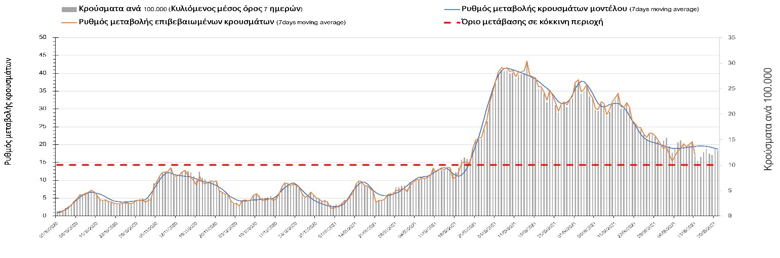 Σχήμα 21. Πορεία του ημερησίου αριθμού των κρουσμάτων (κυλιόμενος μέσος όρος 7 ημερών) στην Εύβοια