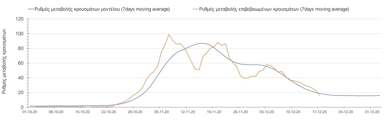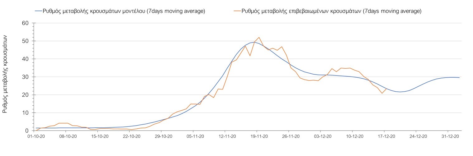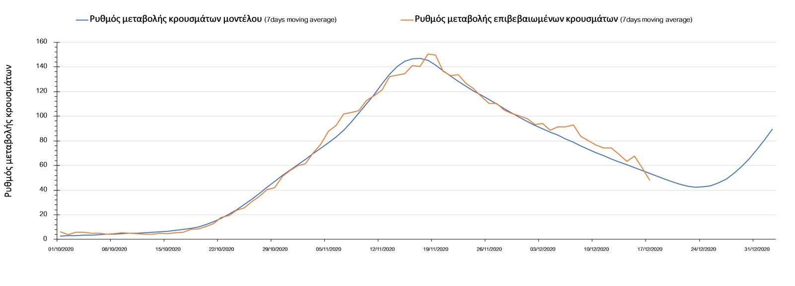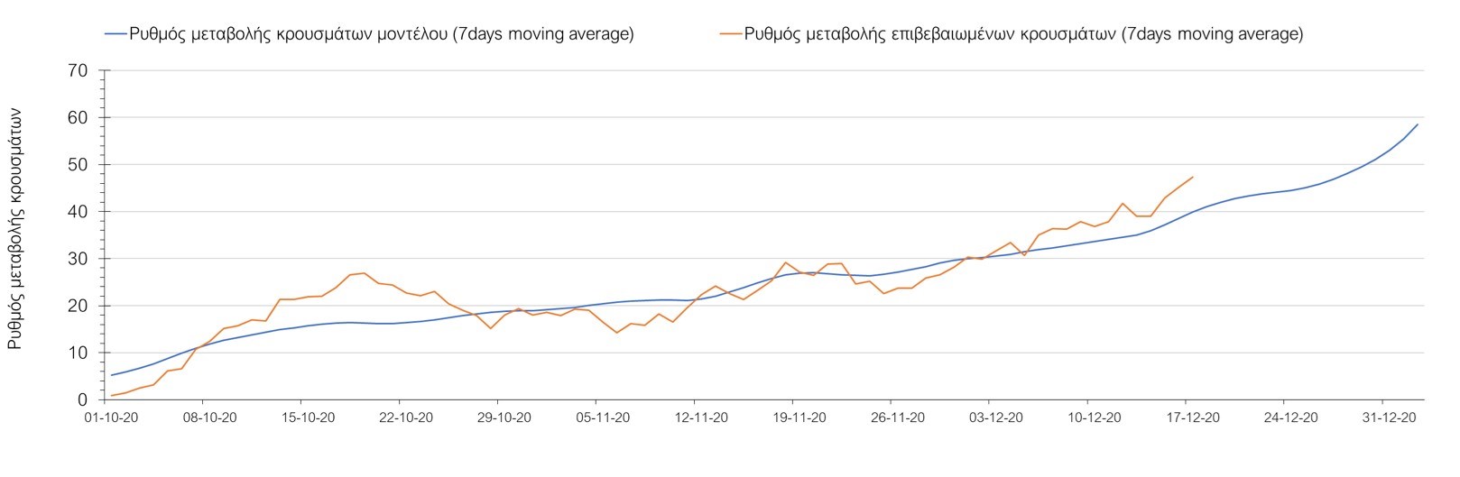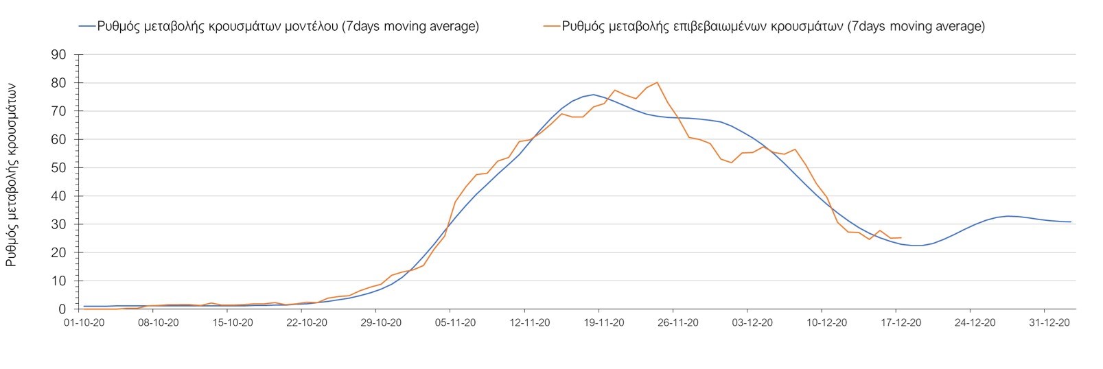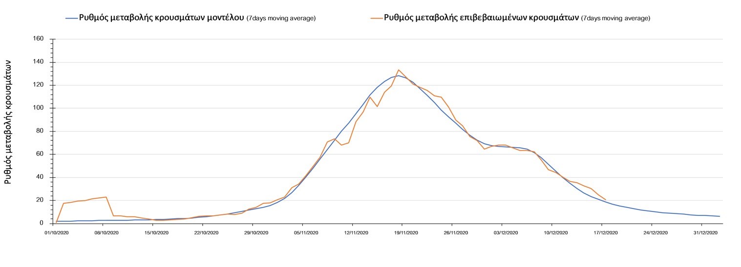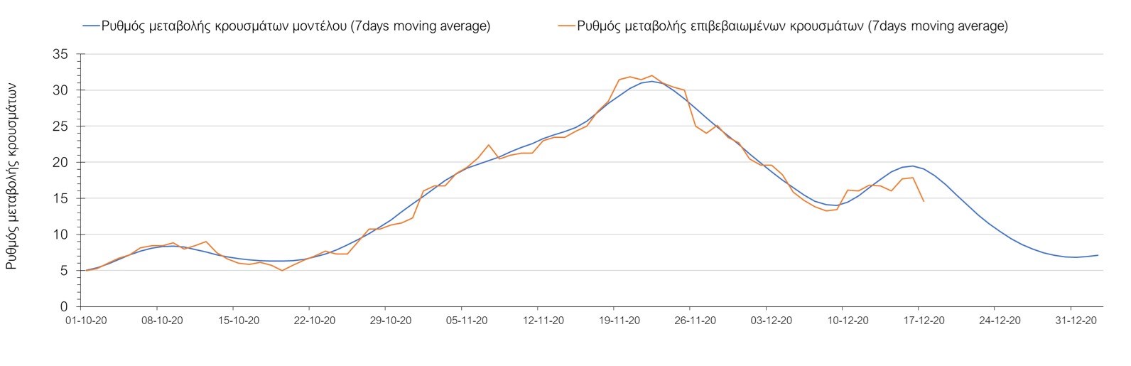 Η πορεία της μέσης εβδομαδιαίας τιμής των κρουσμάτων όπως έχουν καταγραφεί από τον ΕΟΔΥ και η αναμενόμενη πορεία τους μέχρι το τέλος του χρόνου, σύμφωνα με την υπάρχουσα κατάσταση και την απόφαση παράτασης του lockdown μέχρι και τις 7 Ιανουαρίου, όπως προδιαγράφεται από την υπολογιστική πλατφόρμα CORE για την Ελληνική επικράτεια, αποτυπώνονται στο Σχήμα 3.